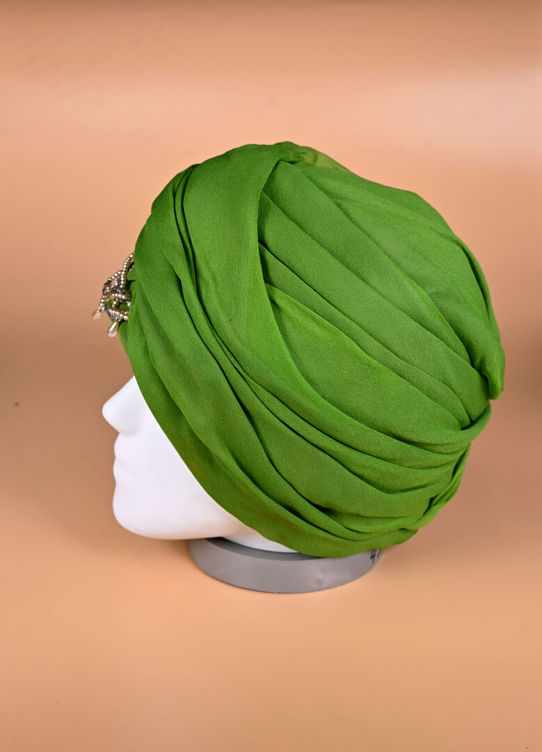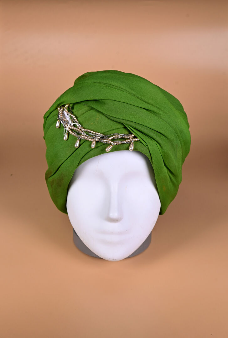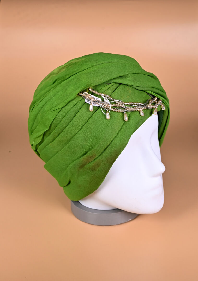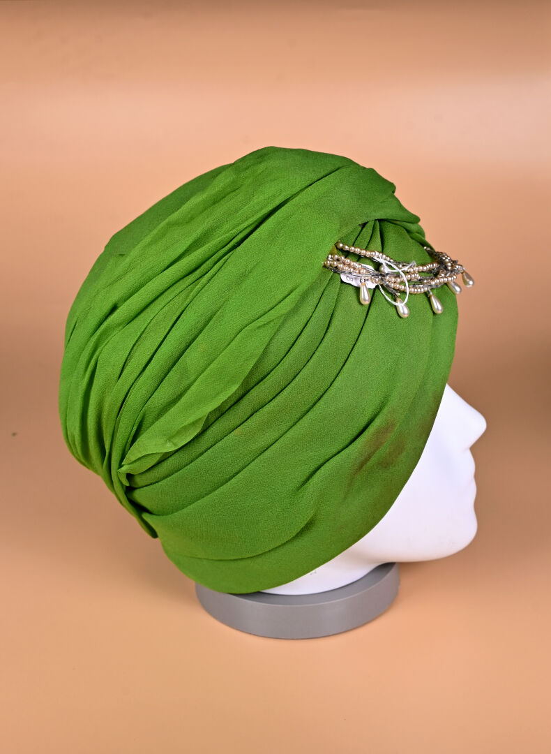 Un turban en crêpe verteà décor de perles fantaisies (quelques taches).