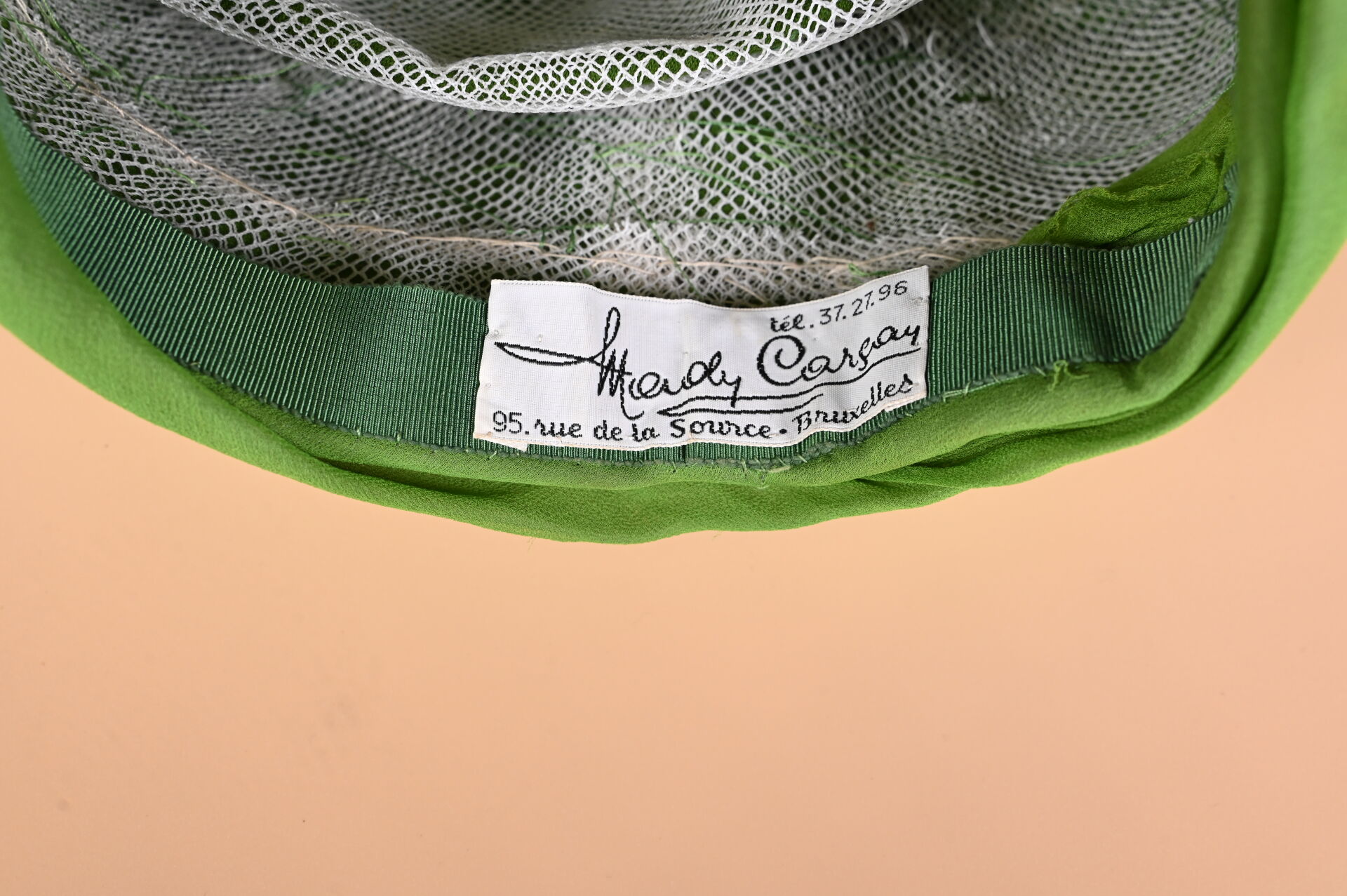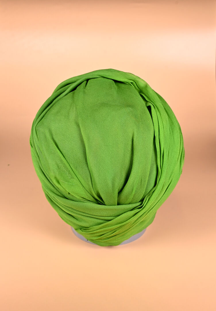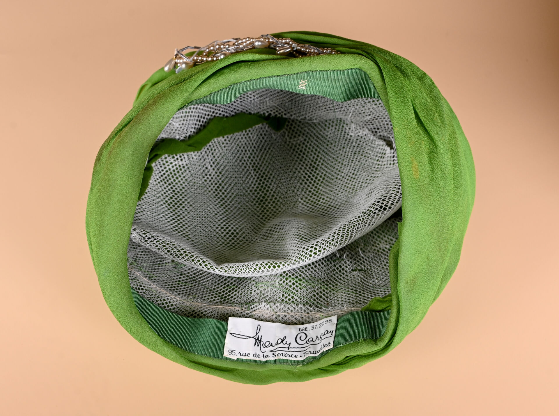 Un turban en crêpe verteà décor de perles fantaisies (quelques taches).