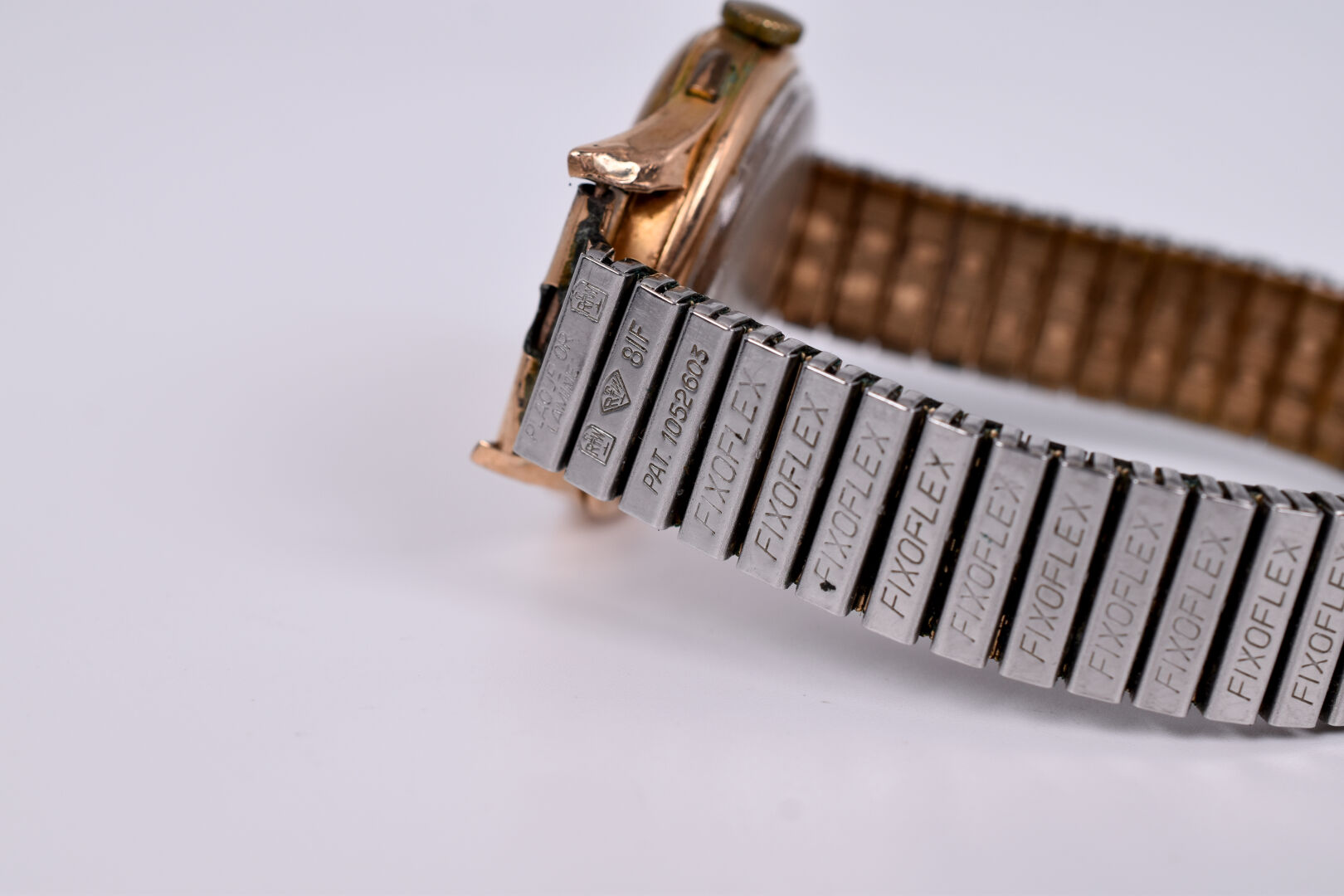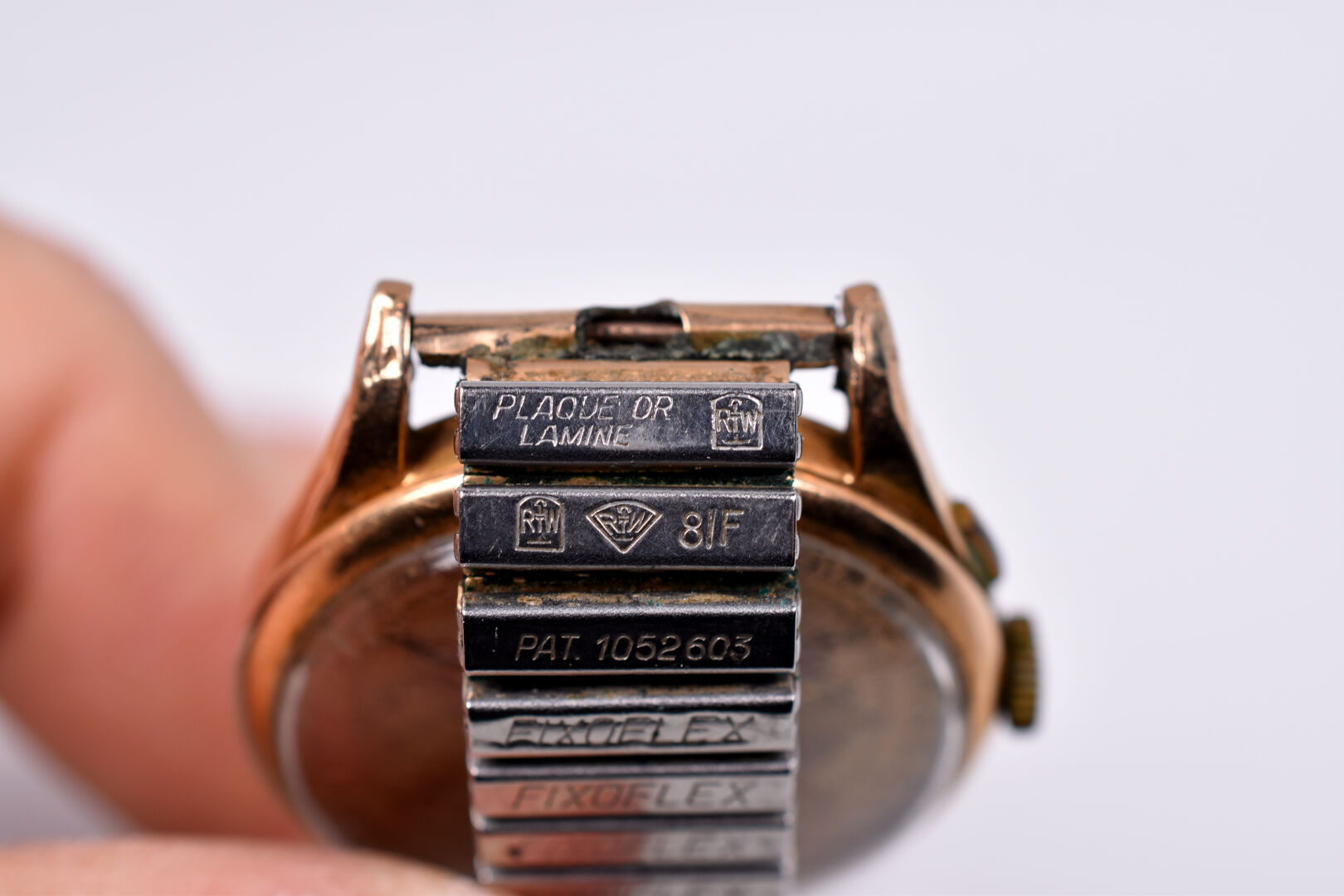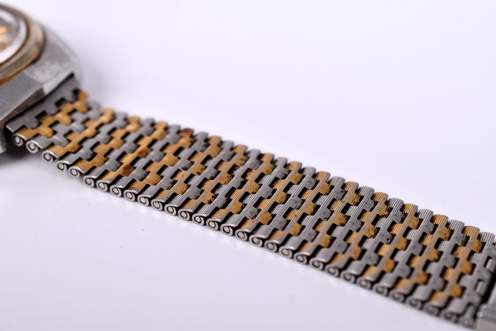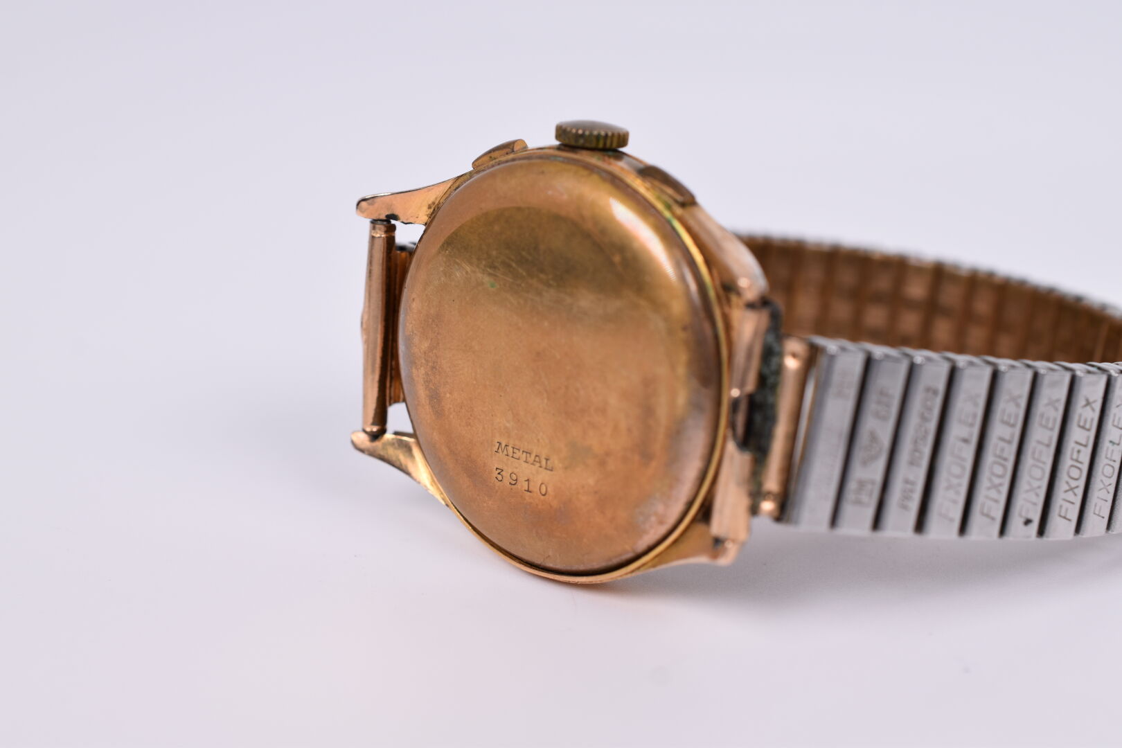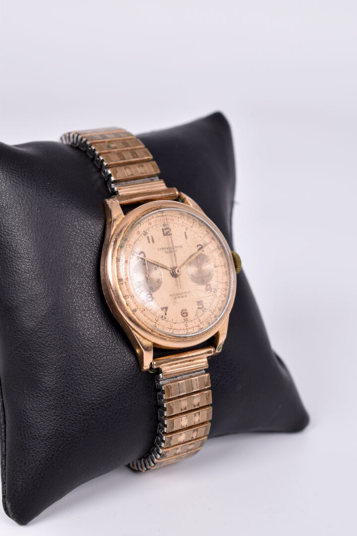 Une montre bracelet chronographe à boitier en or jaune 18K 750/1000e, les boutons et le fond en métal. Cadran à fond or à double complication (usures générales, verre rayé, enfoncements). Démarre. Bracelet en métal doré. Poids brut. : 71,5g. On joint une autre montre en métal (usures et rayures).