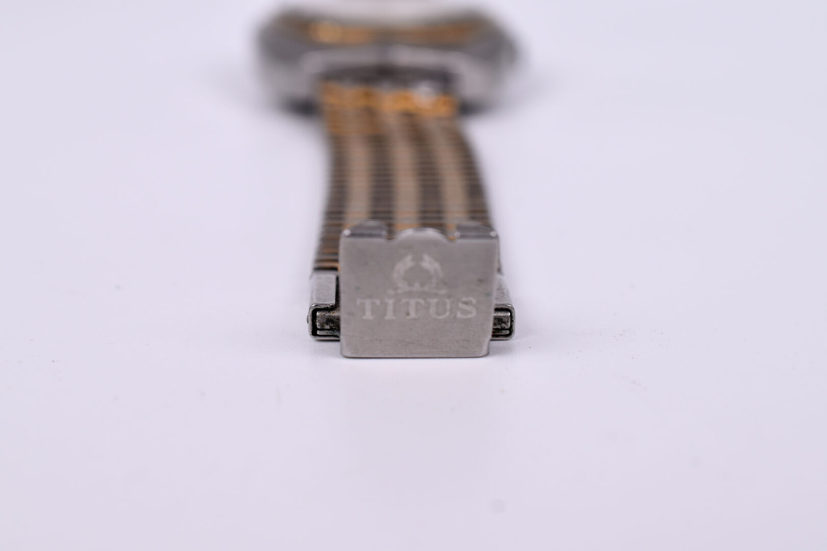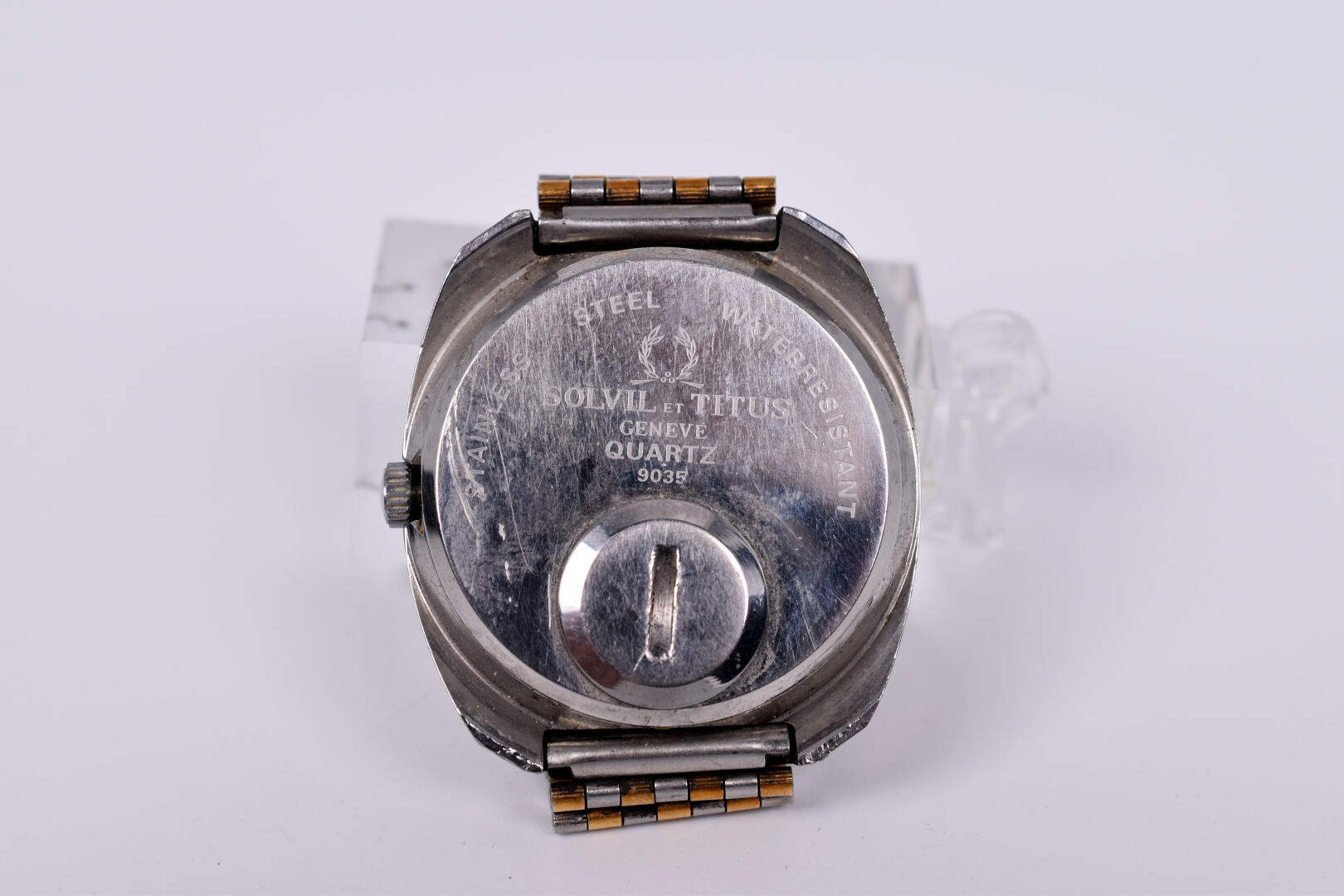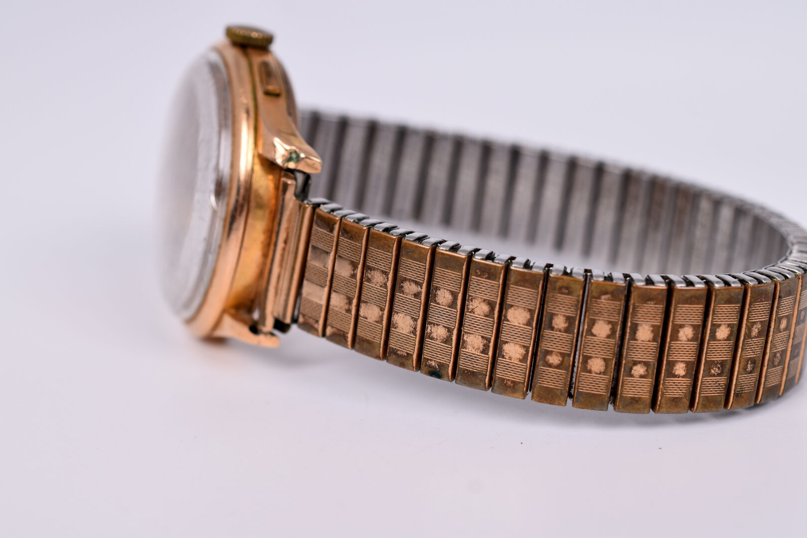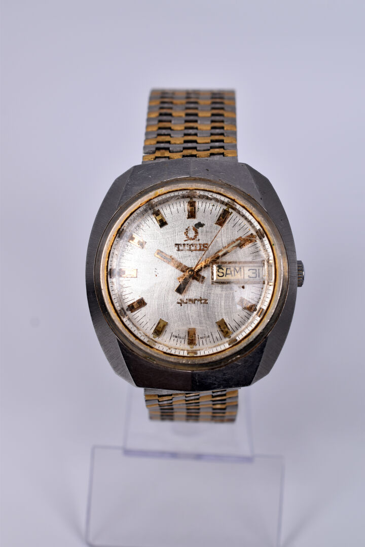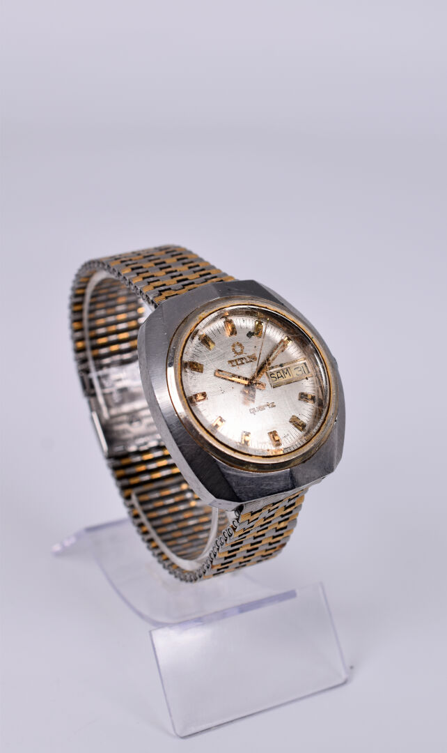 Une montre bracelet chronographe à boitier en or jaune 18K 750/1000e, les boutons et le fond en métal. Cadran à fond or à double complication (usures générales, verre rayé, enfoncements). Démarre. Bracelet en métal doré. Poids brut. : 71,5g. On joint une autre montre en métal (usures et rayures).
