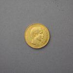 Une pièce de 50 Francs or Napoléon III tête nue 1855 A. Poids : 16,07 g.