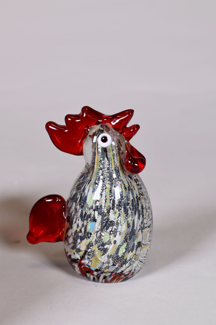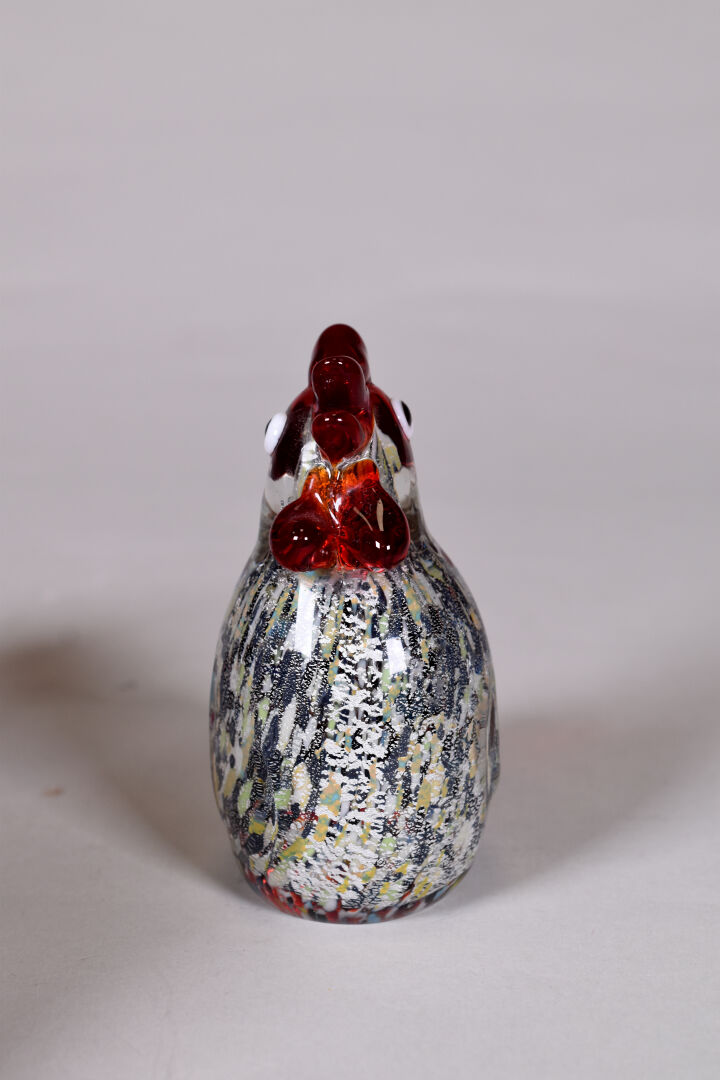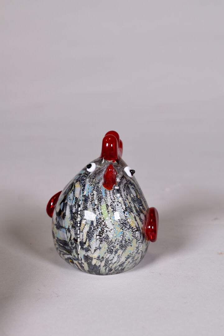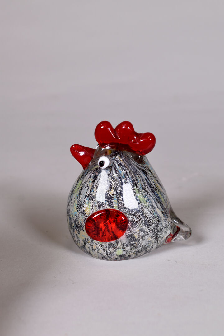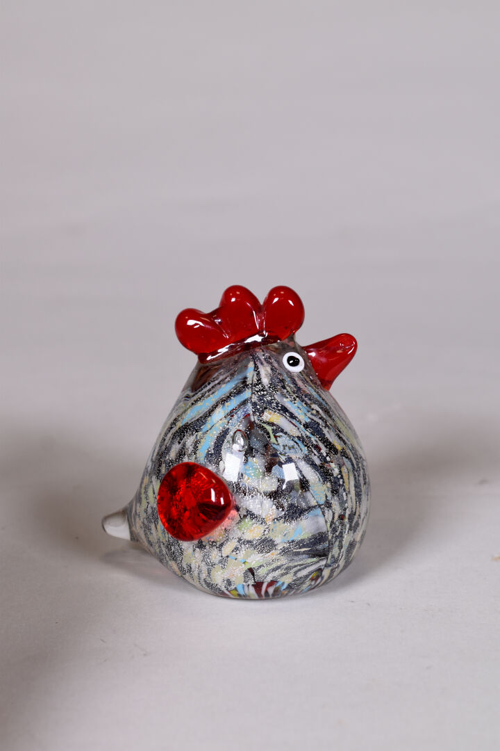 Une poule et un coq miniatures en verre de couleur et paillons argent. Haut. : 11 et 9 cm.