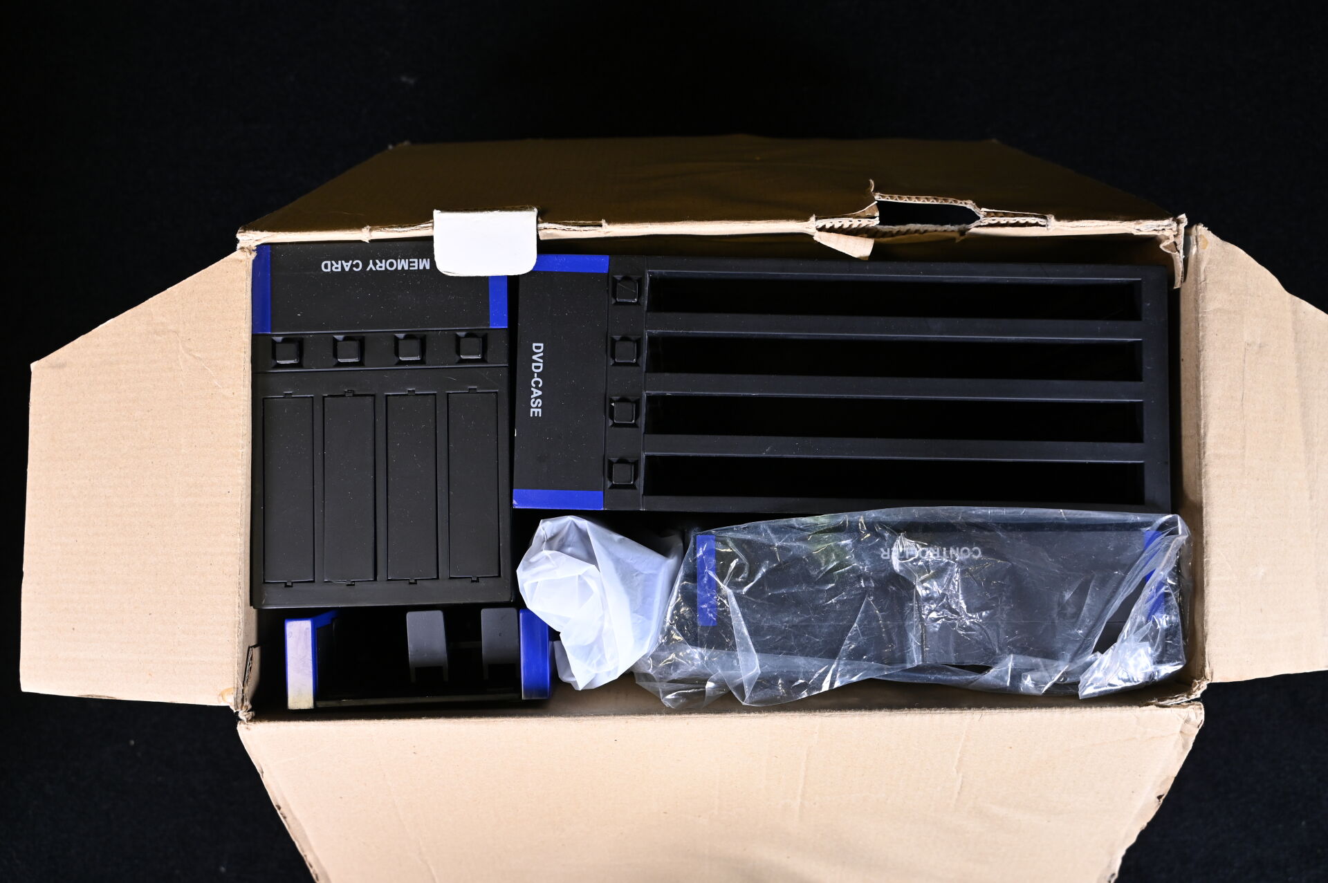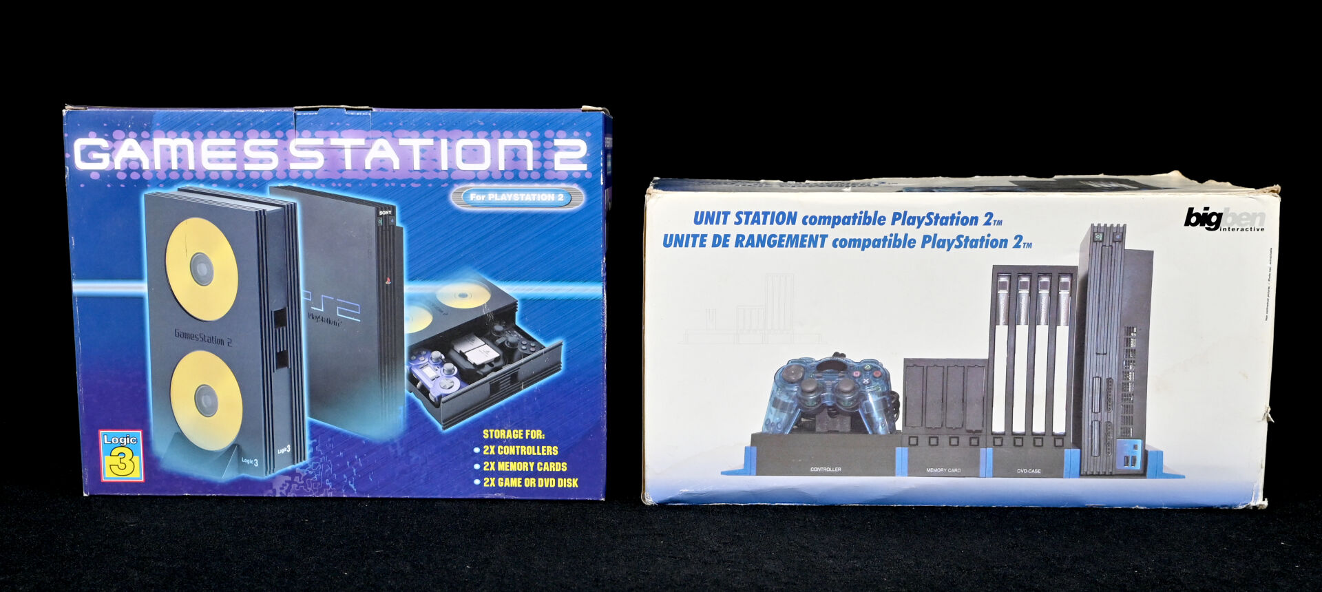 Une unité de rangement BIG BEN pour PLAYSTATION 2. On joint une GAME STATION 2. Avec boîtes.