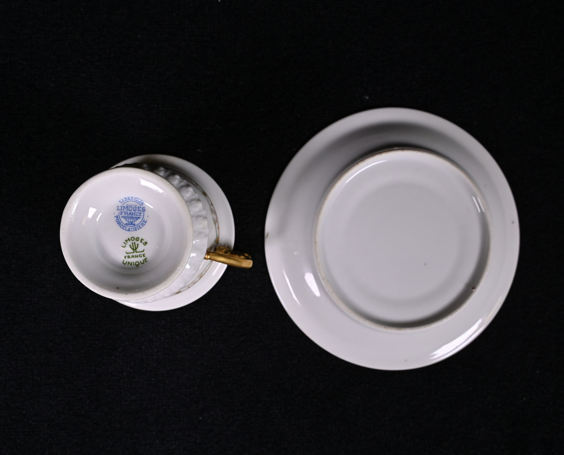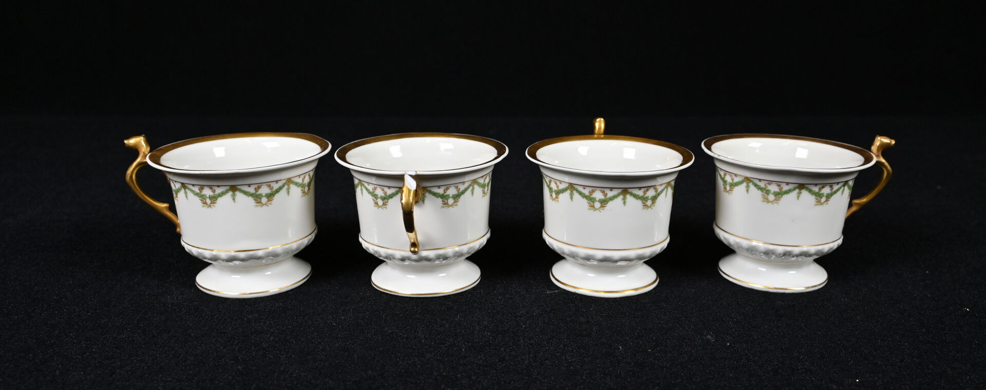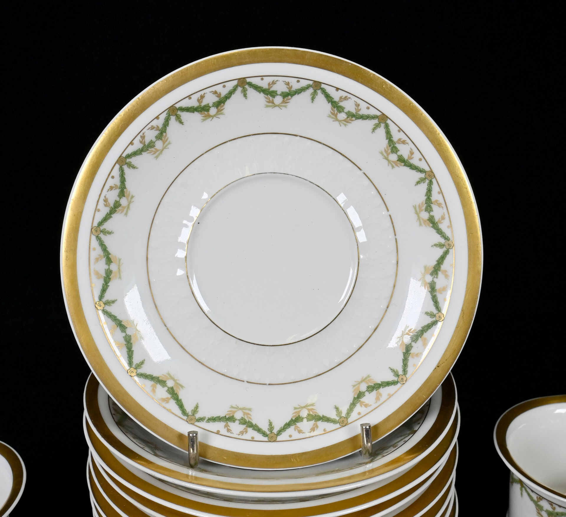 UNION LIMOGES FRANCE. Partie de service à café en porcelaine blanche et liserés dorés à décor de guirlandes et feuilles de laurier, composé de 10 tasses et de 12 sous-tasses (usures d’usage, éclats). Marqué.