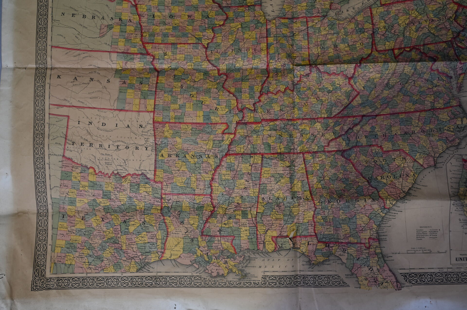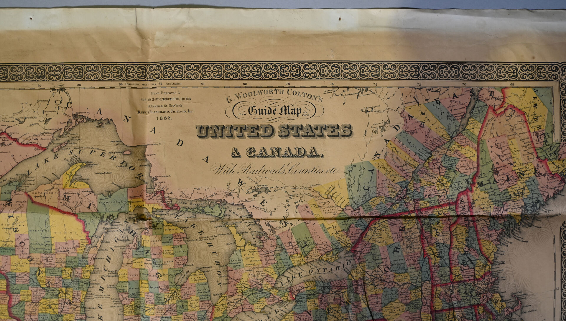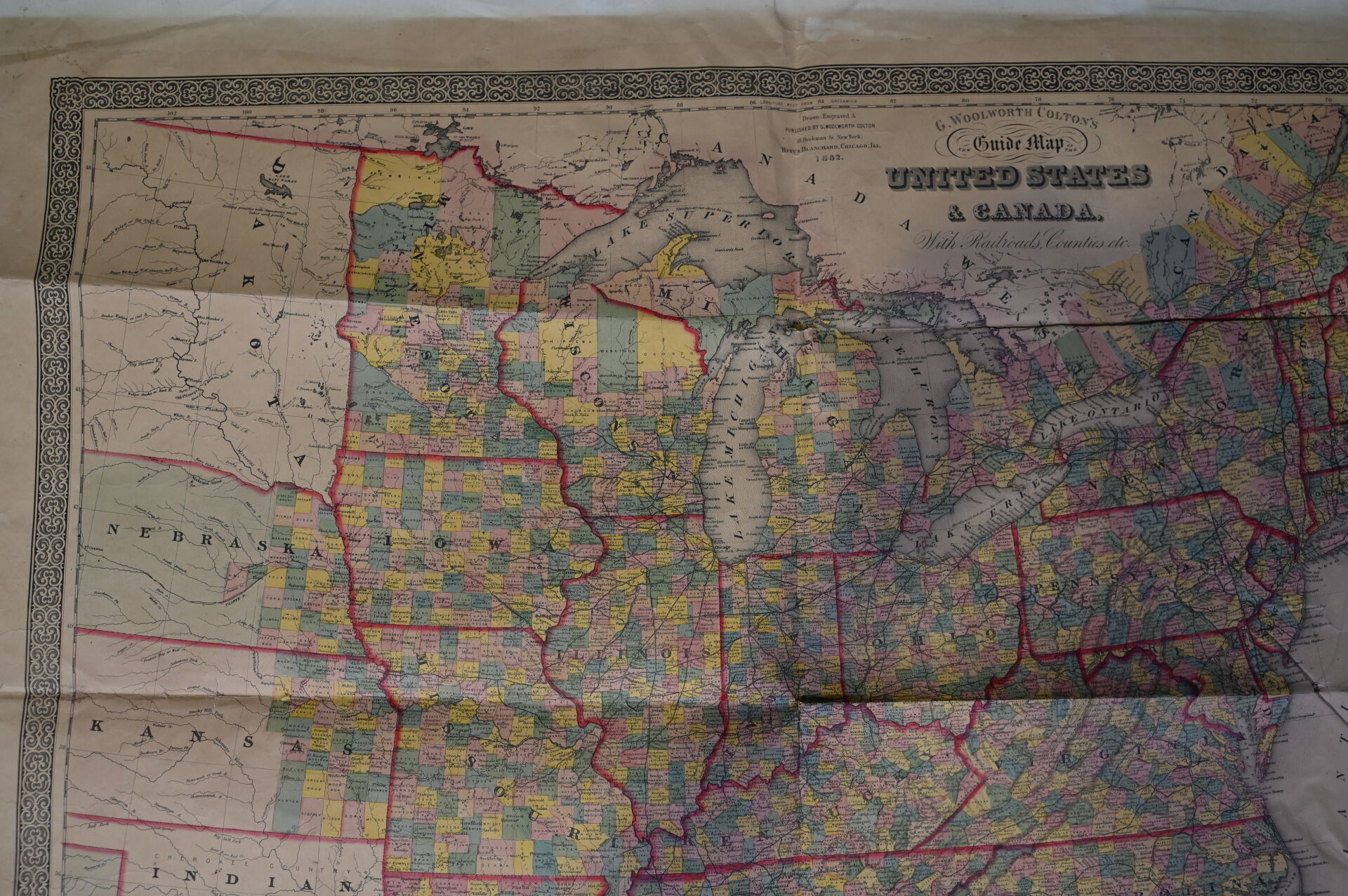 United States & Canada. Carte lithographiée. 1862. G. Woolworth Colton – Rufus Blanchard Chicago, Ill. Non entoilée, assez bon état : plis médians marqués, papier insolé et marqué, pliures et taches, petites déchirures dans les marges. 87 x 105 cm.