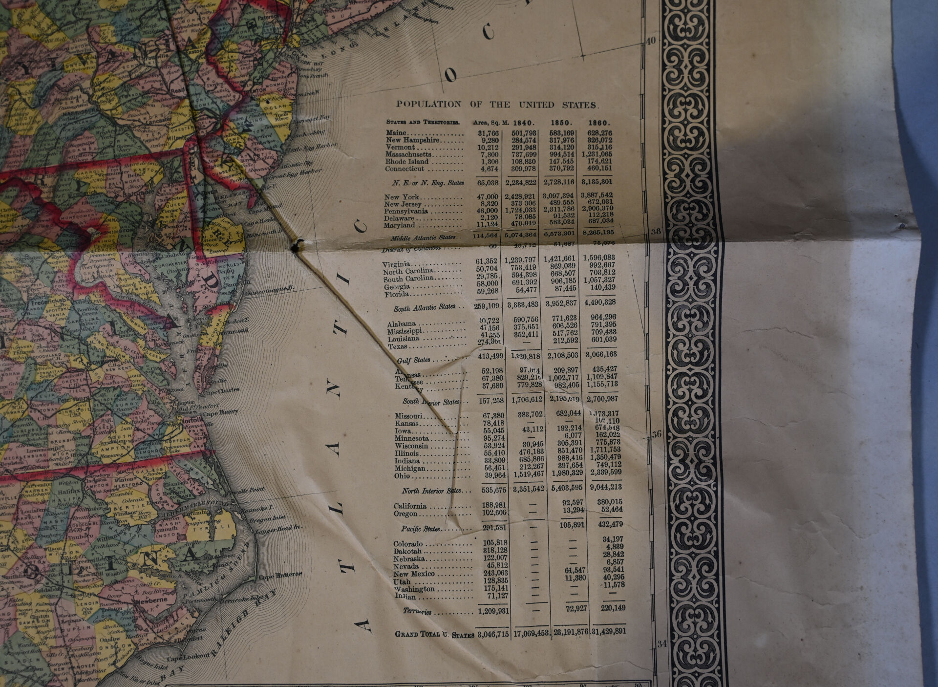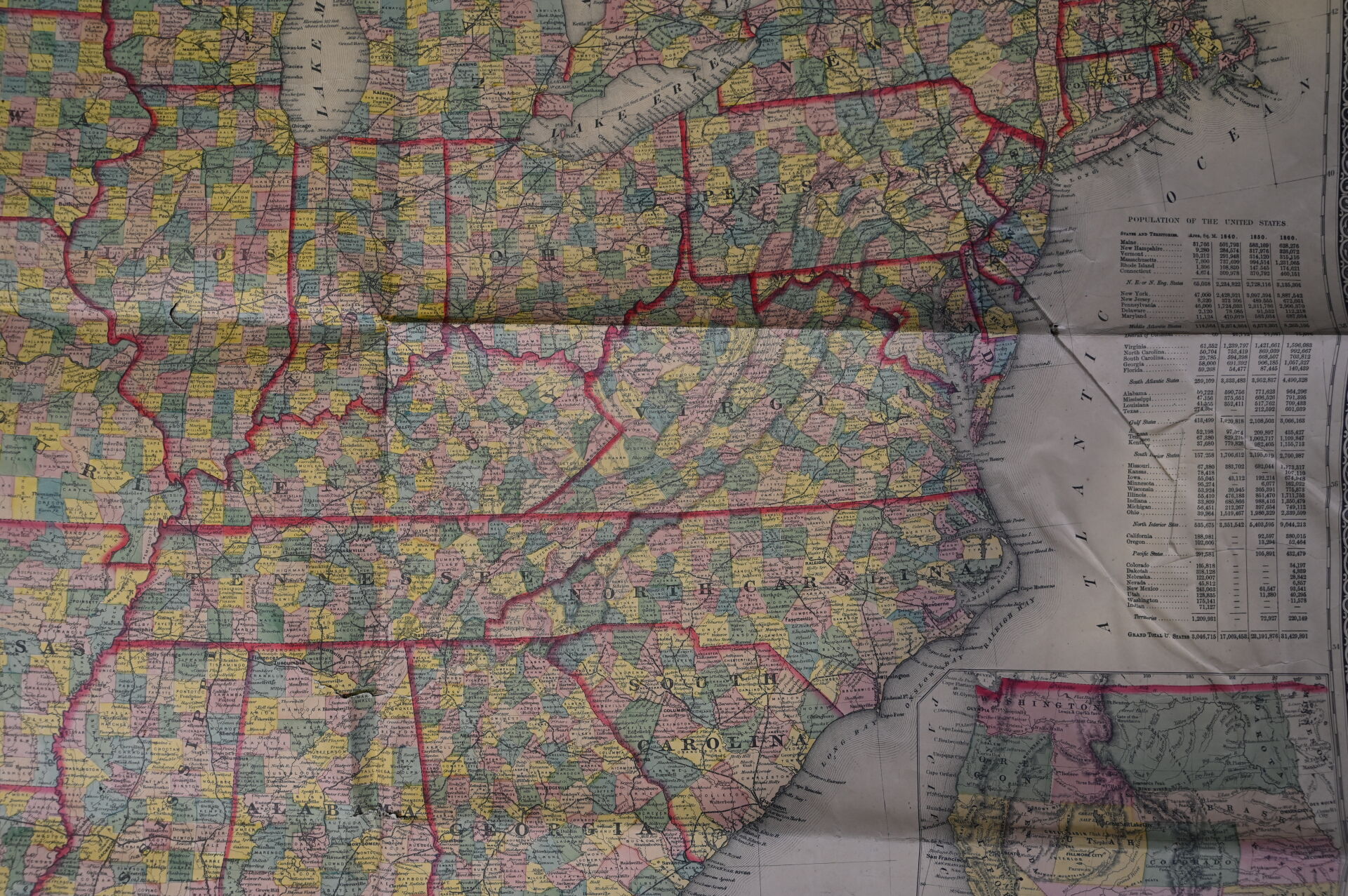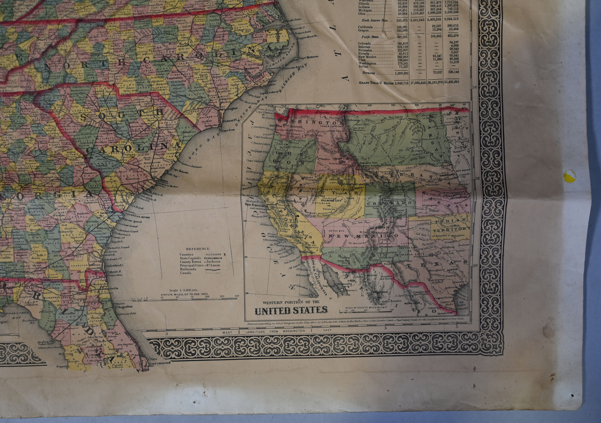 United States & Canada. Carte lithographiée. 1862. G. Woolworth Colton – Rufus Blanchard Chicago, Ill. Non entoilée, assez bon état : plis médians marqués, papier insolé et marqué, pliures et taches, petites déchirures dans les marges. 87 x 105 cm.