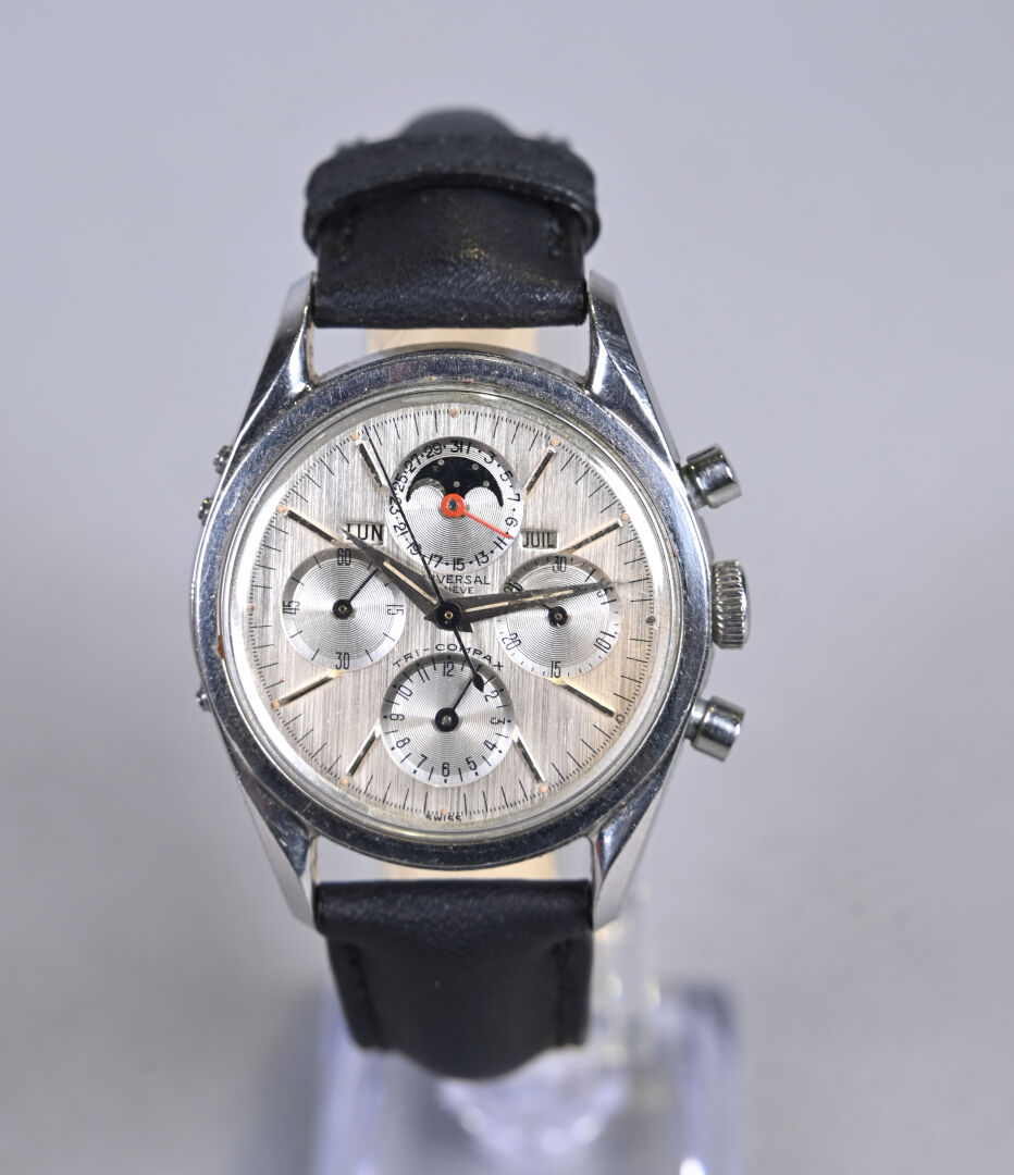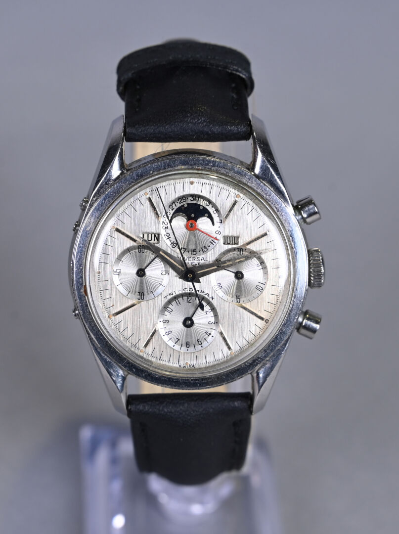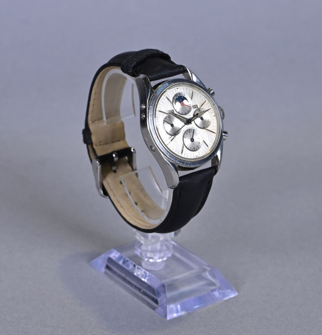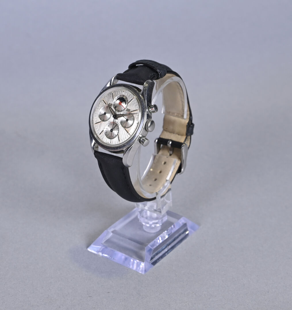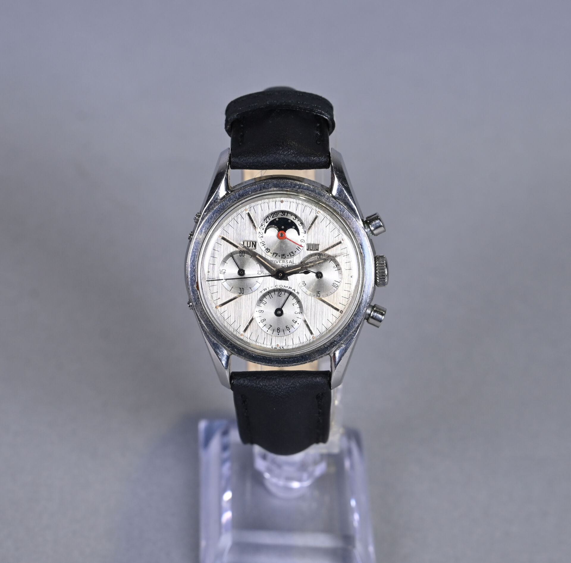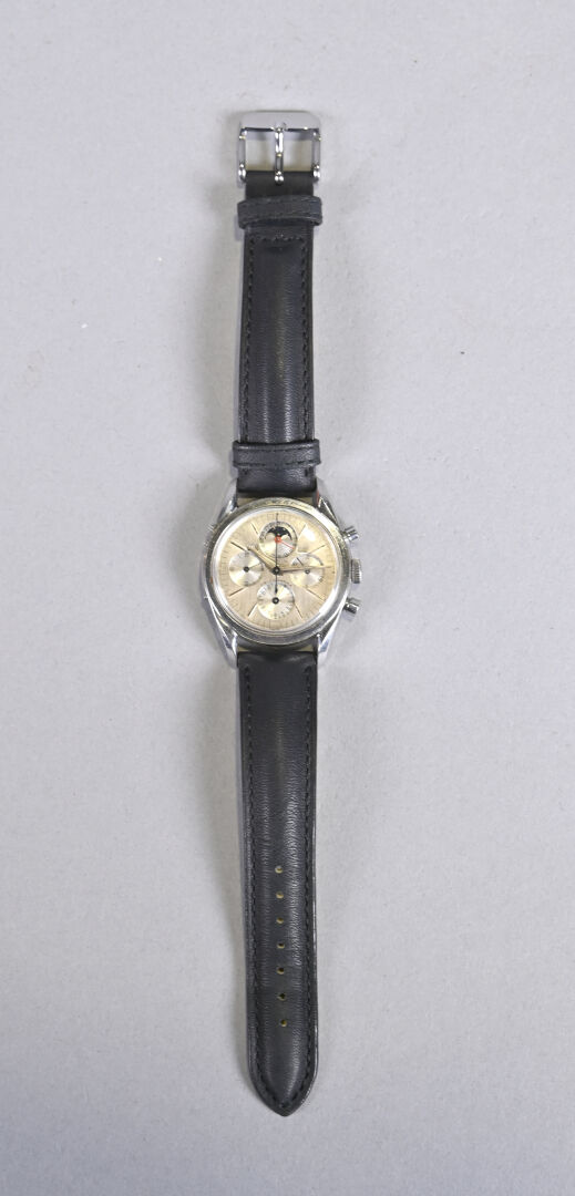 UNIVERSAL GENEVE TRI COMPAX. Montre chronographe bracelet d’homme à boitier rond en acier. Cadran signé à fonds argenté jour/date, phases de lune à 12H avec 3 sous cadran. Mouvement mécanique à remontage manuel. Bracelet en cuir noir sur boucle ardillon. Diam. : 34 mm. Bracelet rapporté. Démarre. Très légères traces d’oxydation au niveau des boutons chrono. Petits sauts à la peinture dans les aiguilles. Joint étanchéité absent. Mouvement gravé 281. Rayures d’usage.