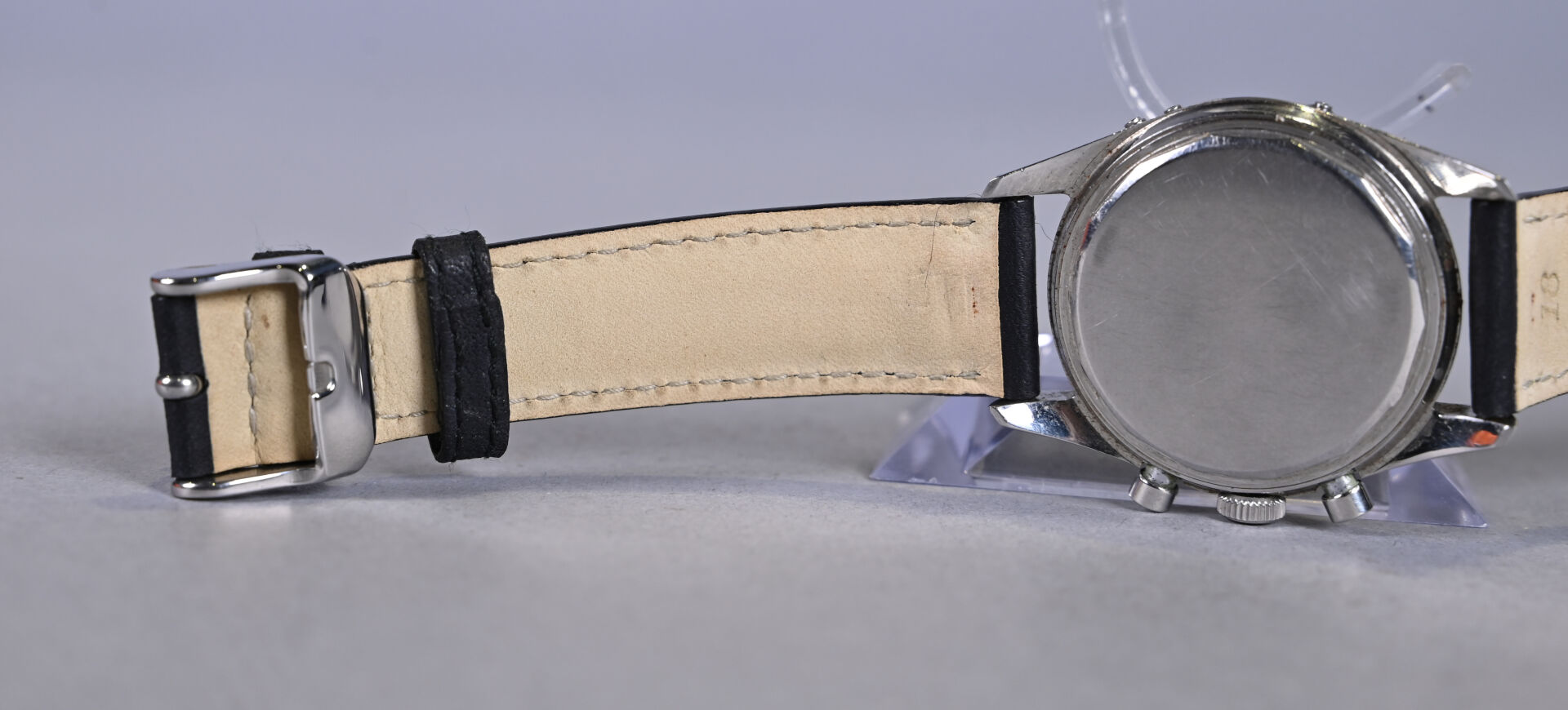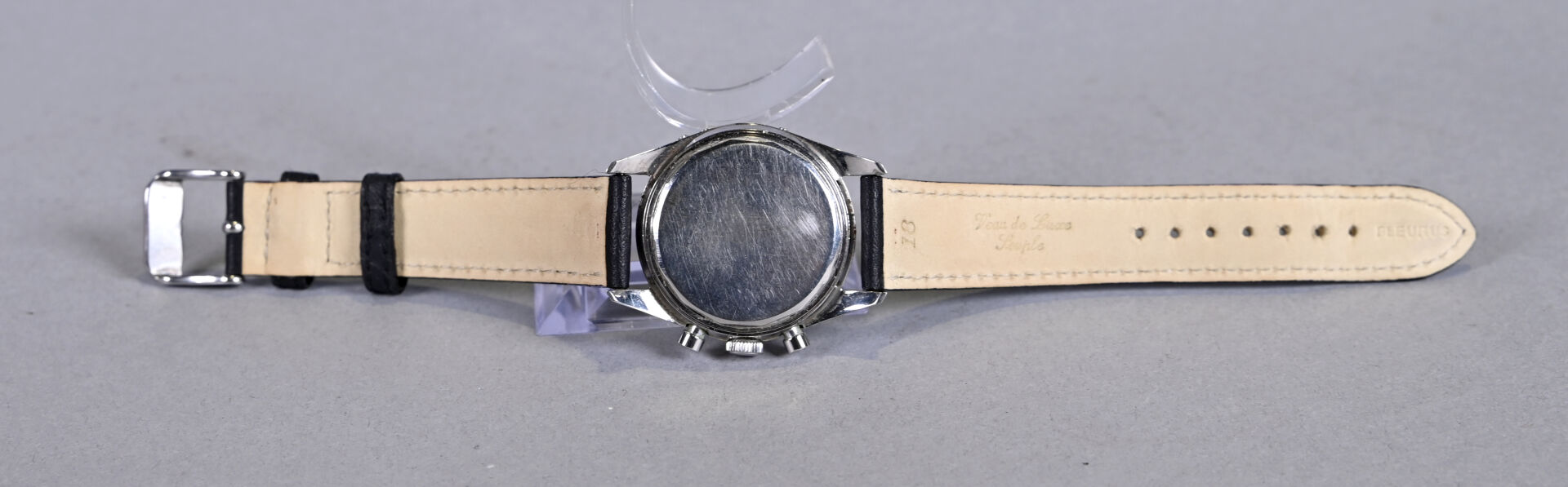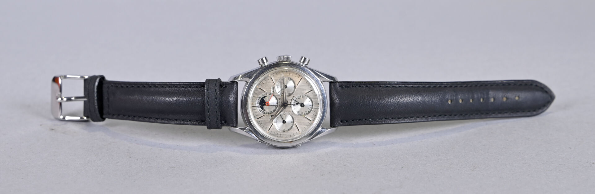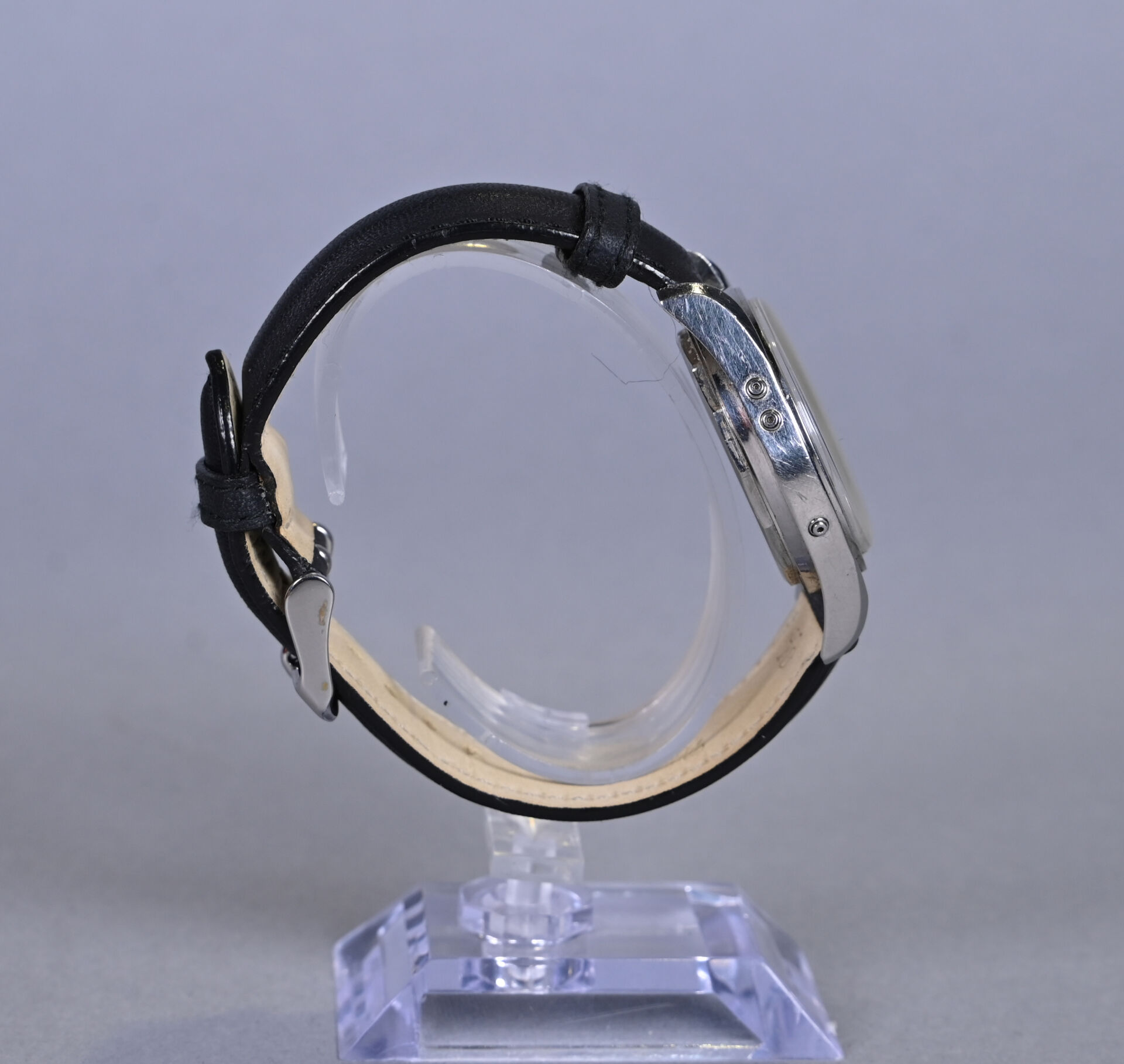 UNIVERSAL GENEVE TRI COMPAX. Montre chronographe bracelet d’homme à boitier rond en acier. Cadran signé à fonds argenté jour/date, phases de lune à 12H avec 3 sous cadran. Mouvement mécanique à remontage manuel. Bracelet en cuir noir sur boucle ardillon. Diam. : 34 mm. Bracelet rapporté. Démarre. Très légères traces d’oxydation au niveau des boutons chrono. Petits sauts à la peinture dans les aiguilles. Joint étanchéité absent. Mouvement gravé 281. Rayures d’usage.