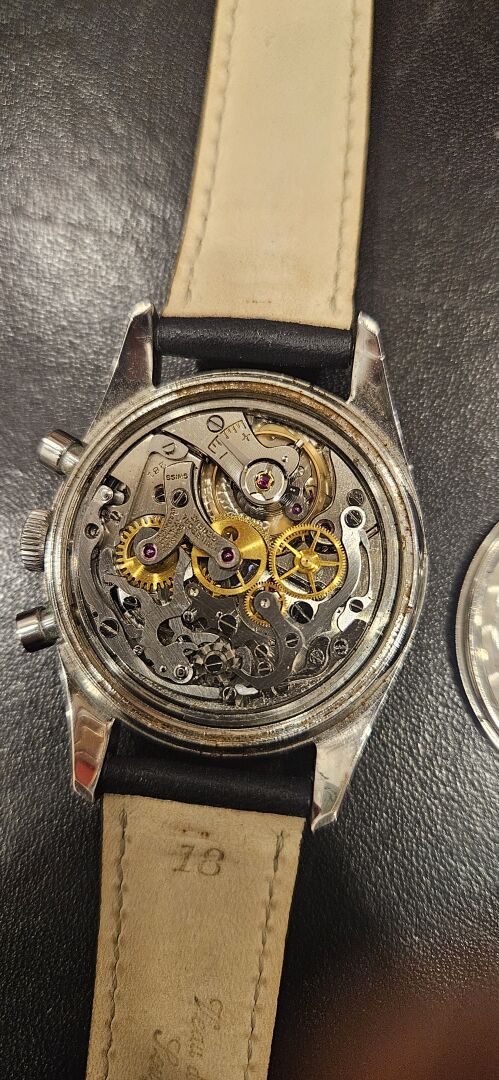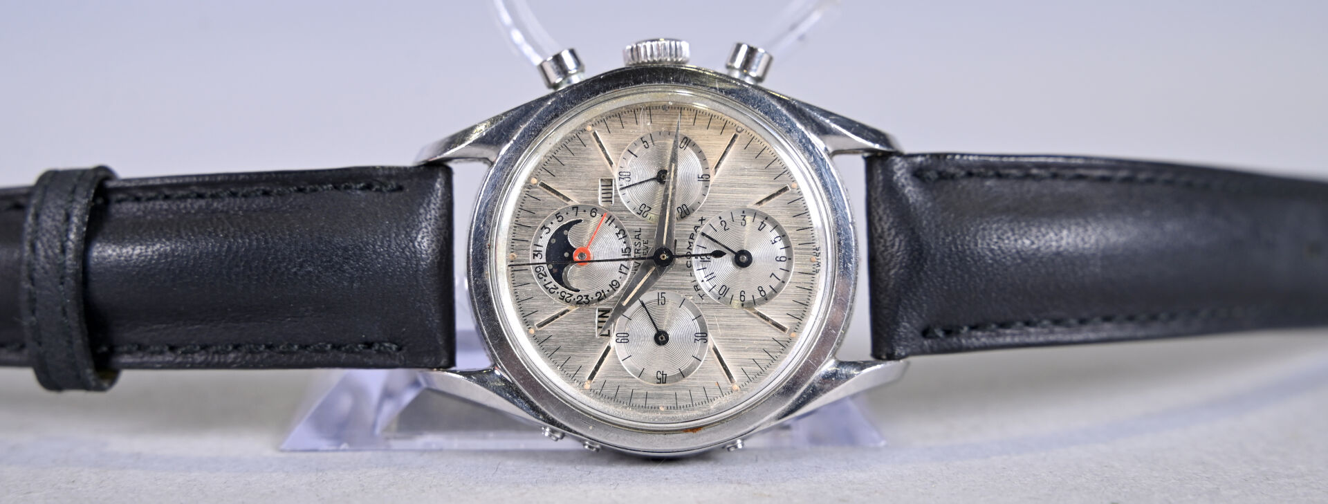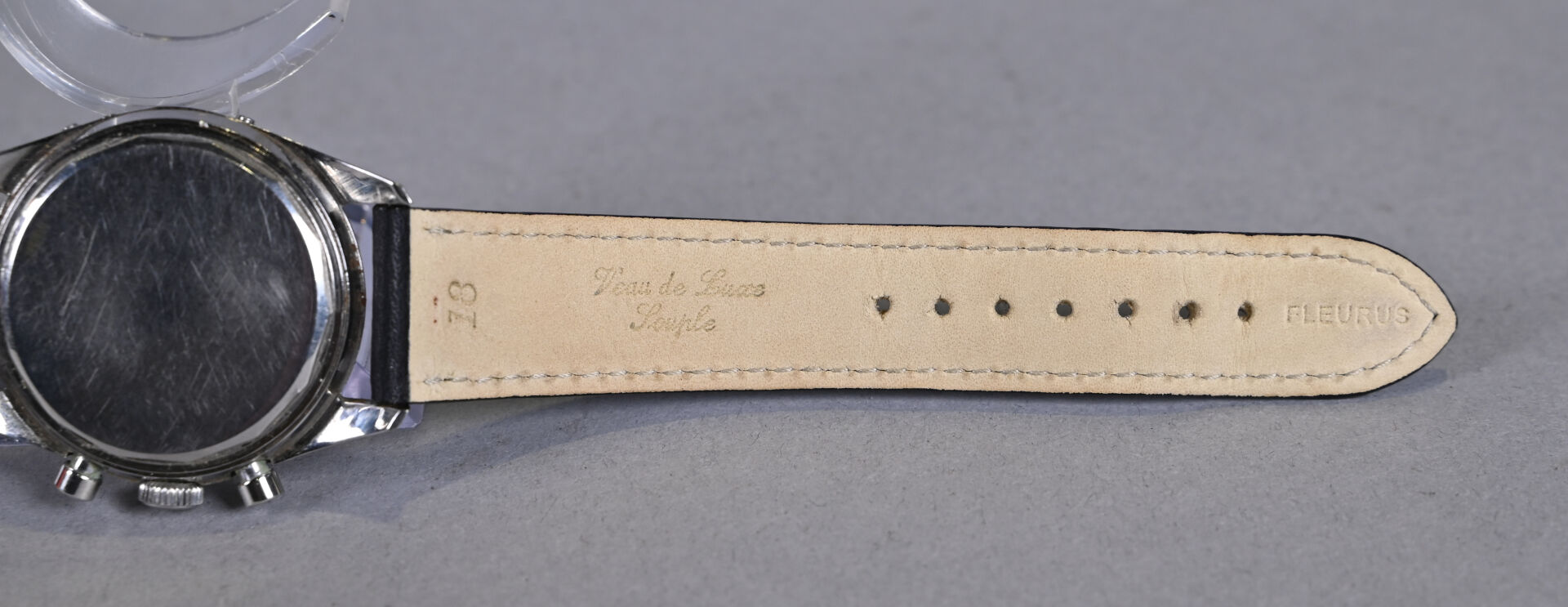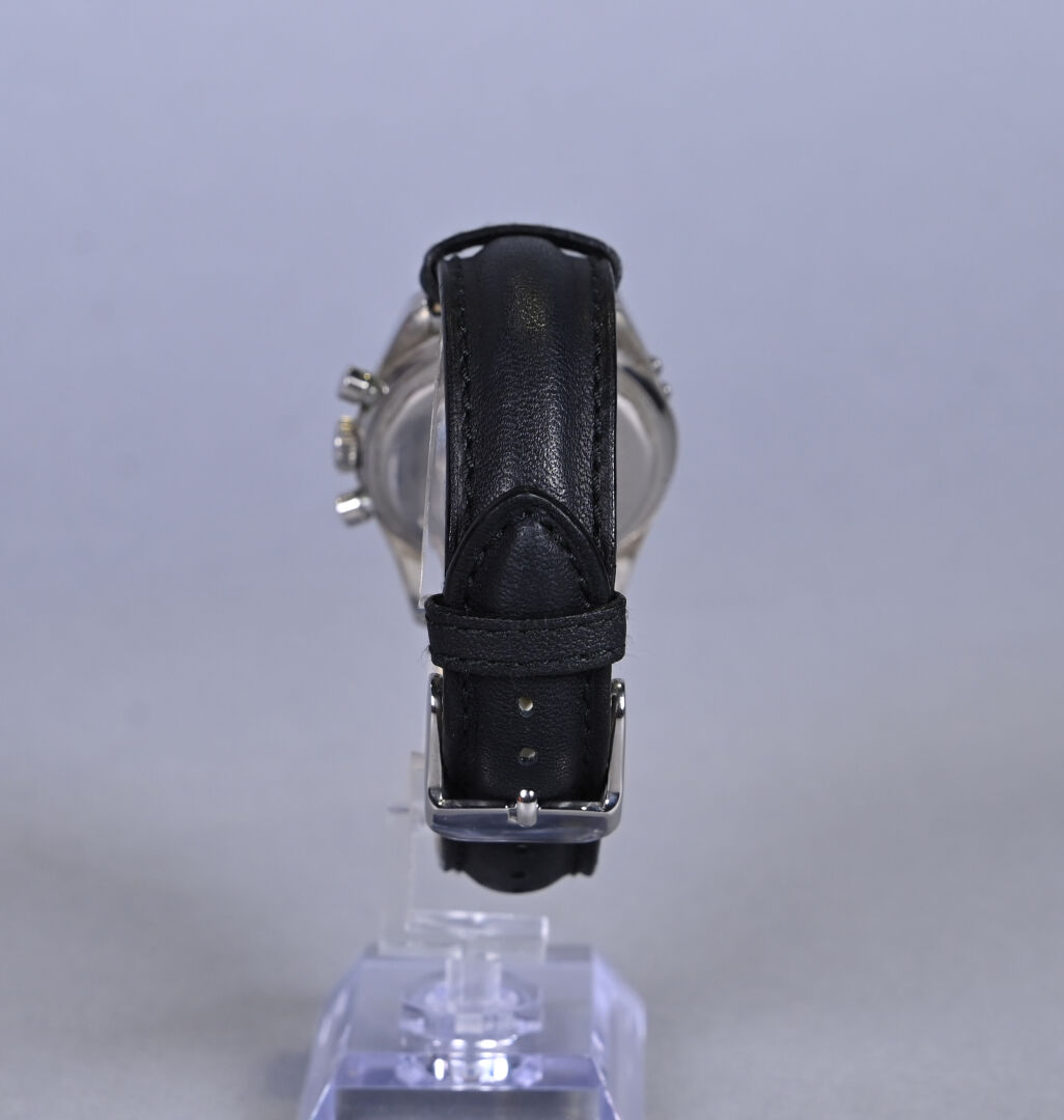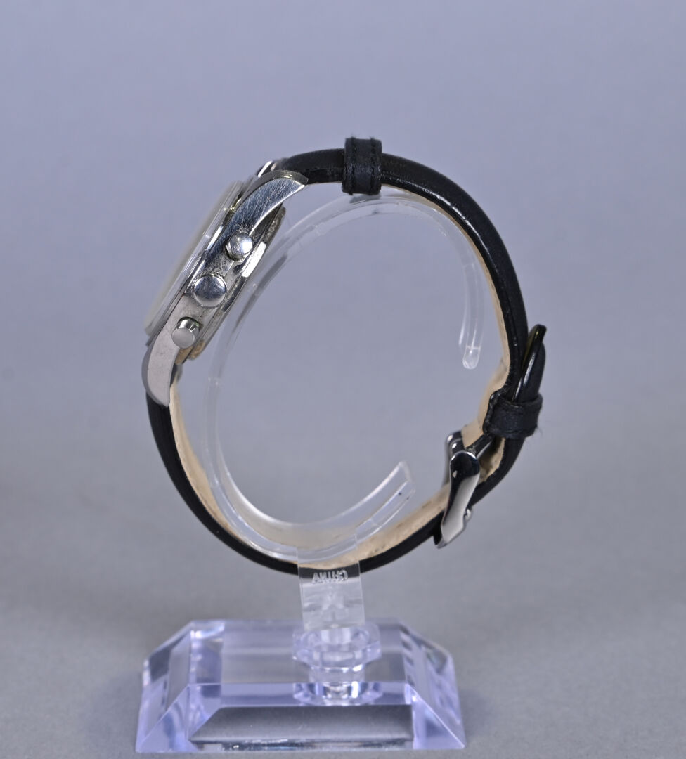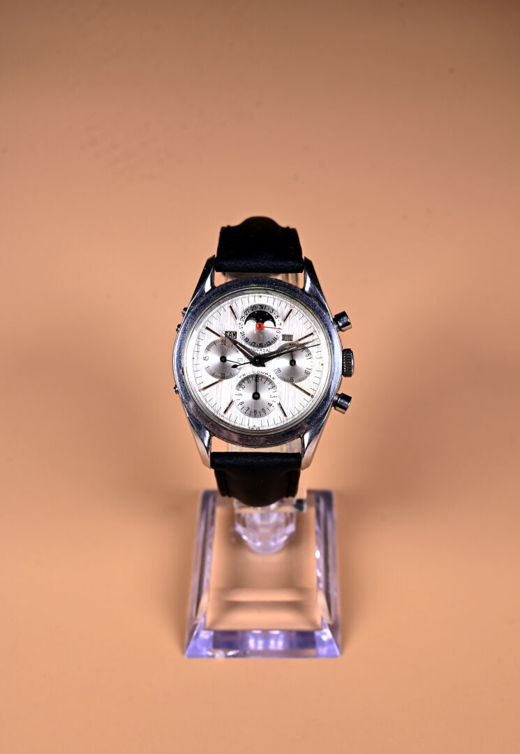 UNIVERSAL GENEVE TRI COMPAX. Montre chronographe bracelet d’homme à boitier rond en acier. Cadran signé à fonds argenté jour/date, phases de lune à 12H avec 3 sous cadran. Mouvement mécanique à remontage manuel. Bracelet en cuir noir sur boucle ardillon. Diam. : 34 mm. Bracelet rapporté. Démarre. Très légères traces d’oxydation au niveau des boutons chrono. Petits sauts à la peinture dans les aiguilles. Joint étanchéité absent. Mouvement gravé 281. Rayures d’usage.