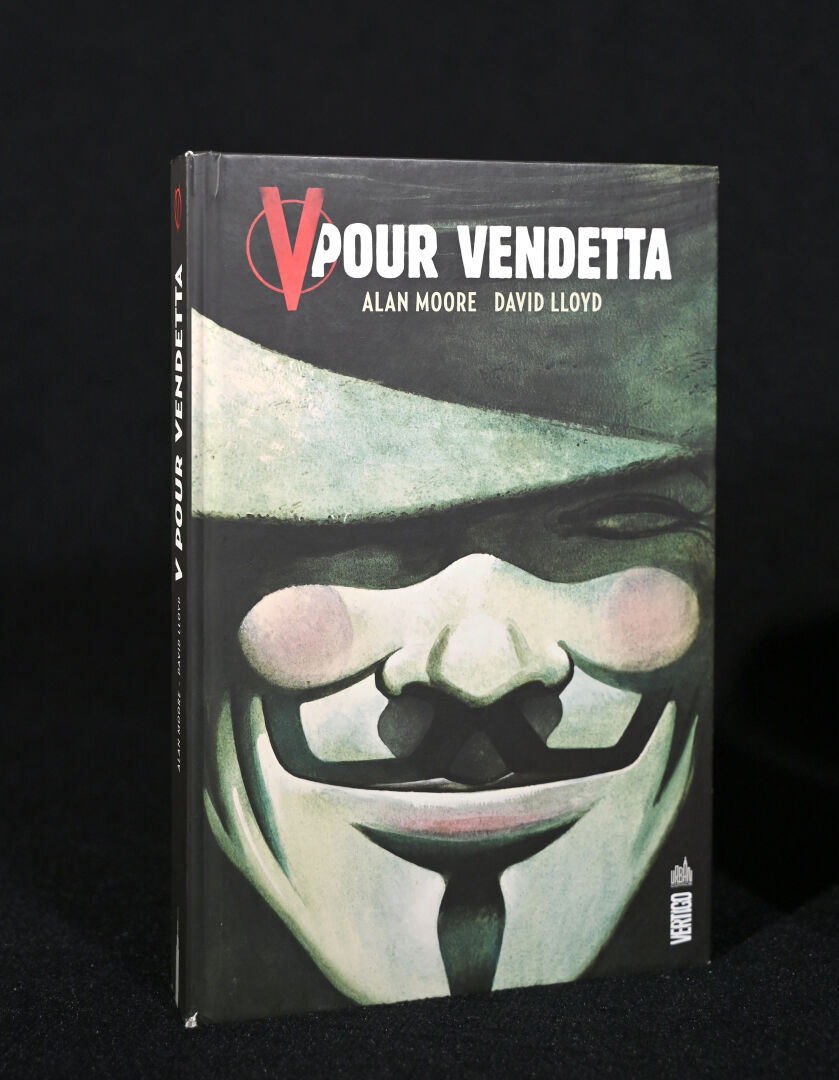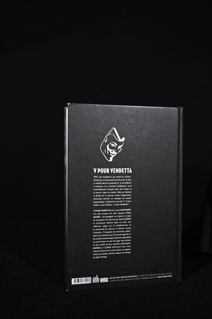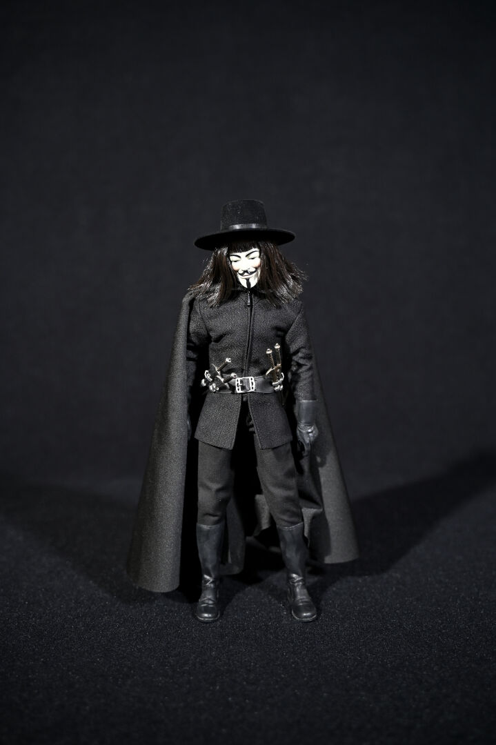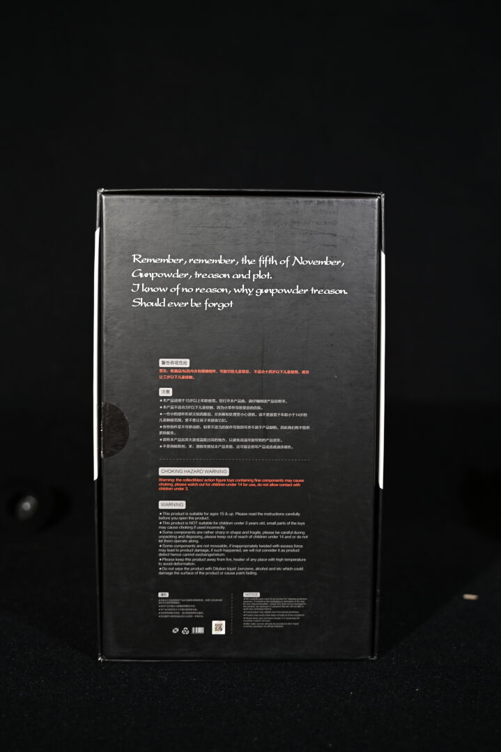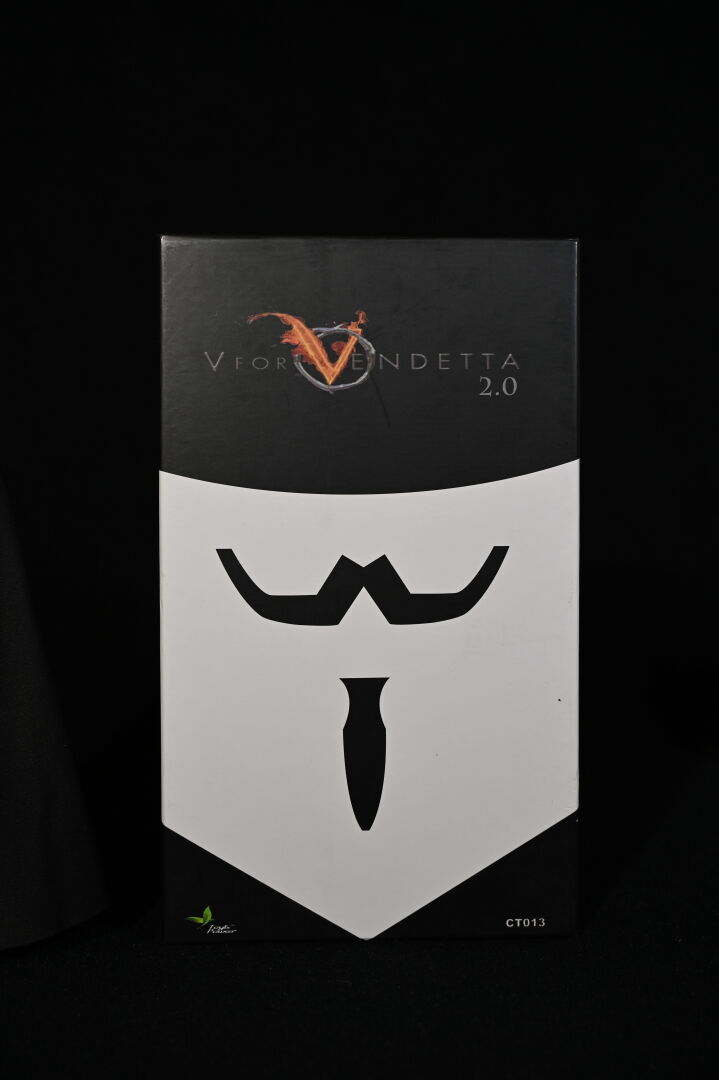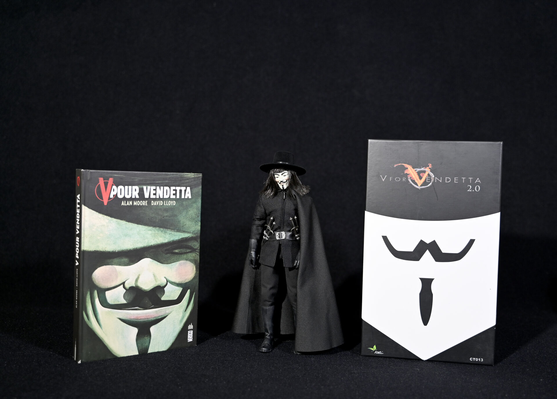V POUR VENDETTA – V FOR VENDETTA 2.0 – TOYS POWER. Figurine CT013 représentant V avec des accessoires, notamment des gants, une rose et un chapeau. Dans sa boîte. Haut. de la figurine : 31 cm. On joint une vitrine en plexiglas, et un livre « V pour Vendetta » de Alan Moore et David Lloyd, Urban Comics Vertigo, 2009.