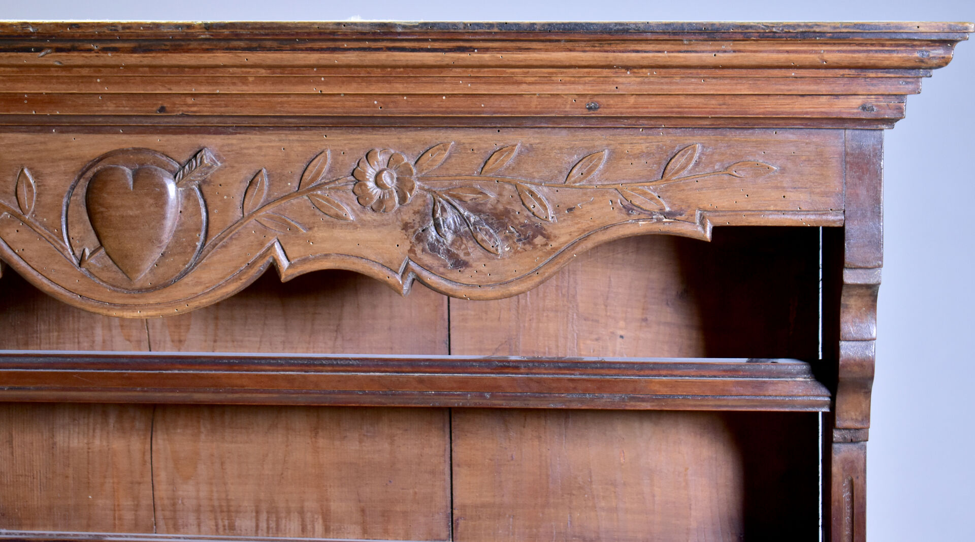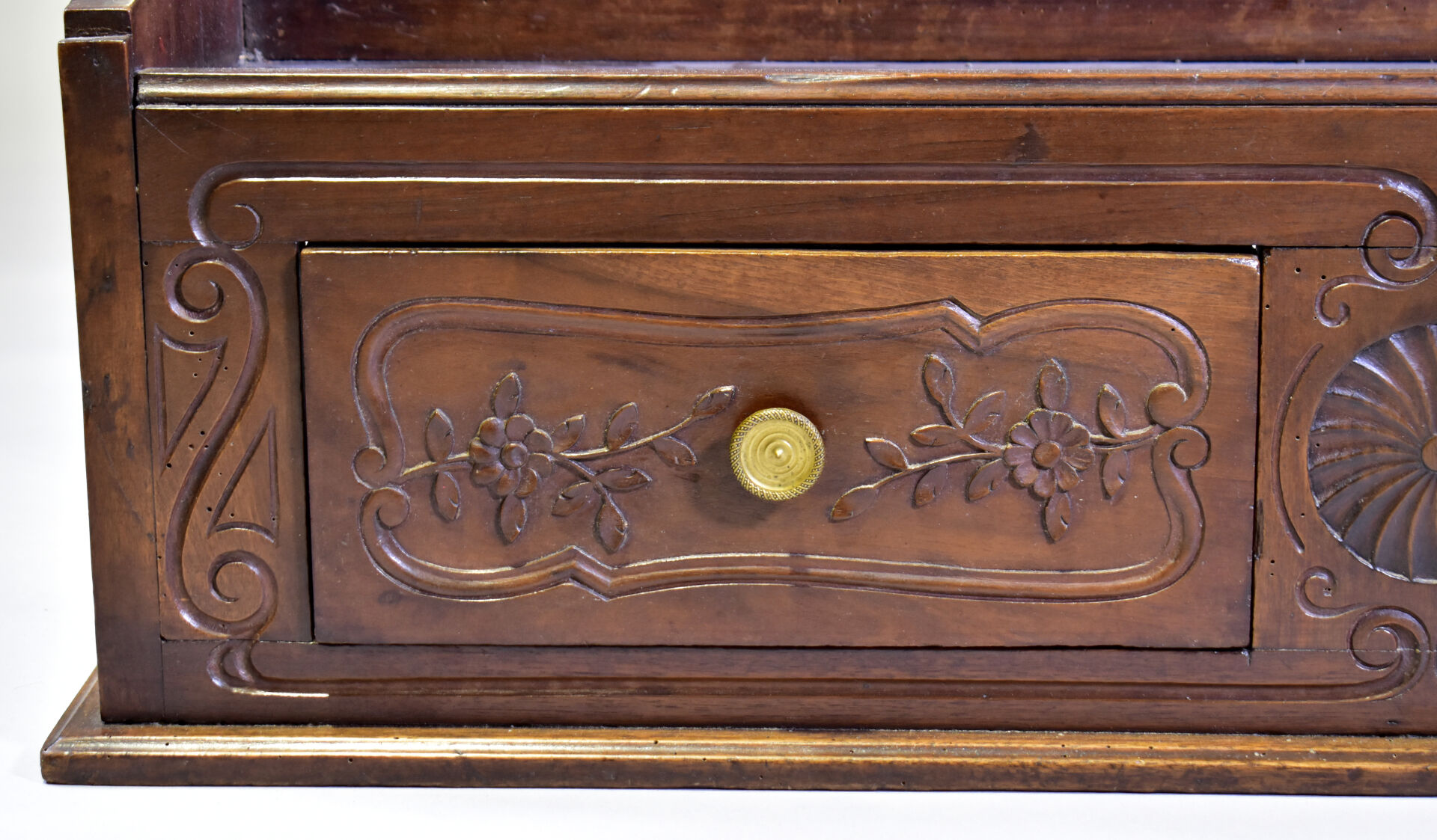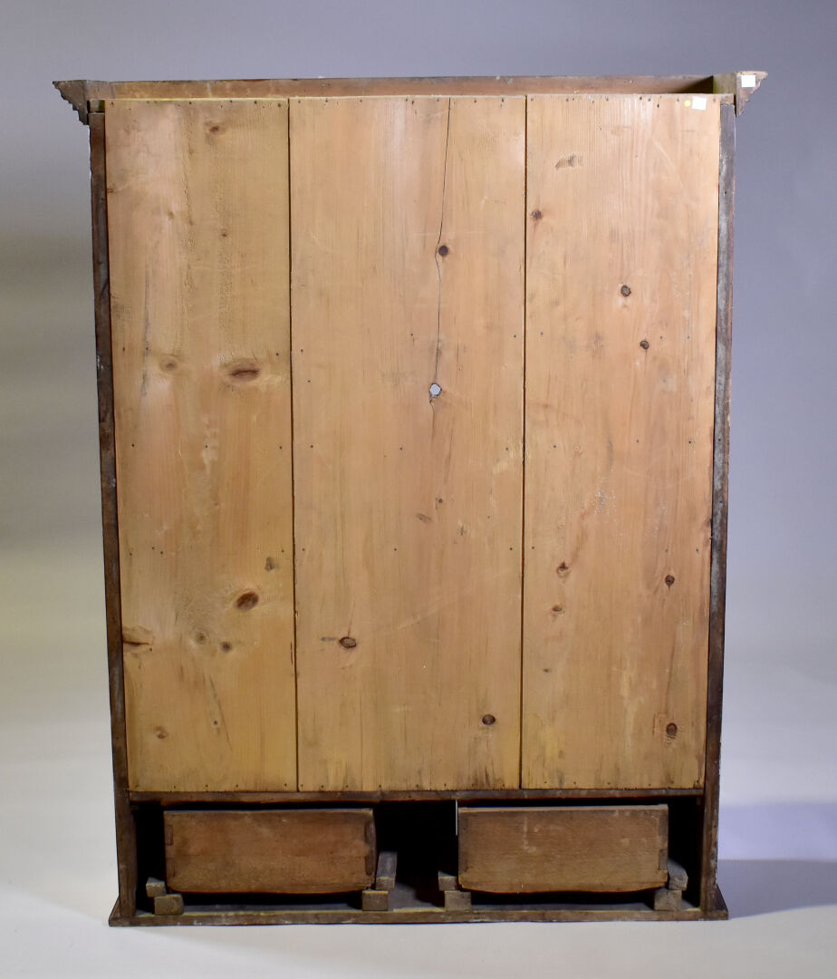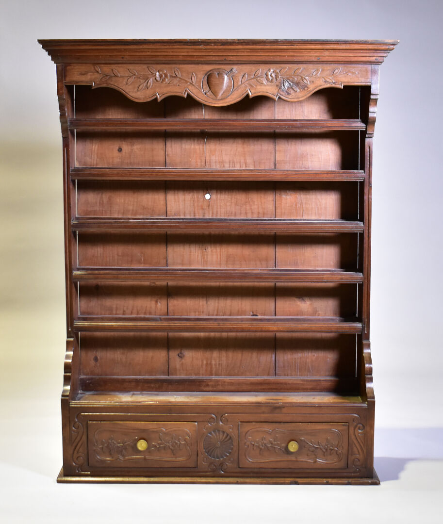 Vaisselier en noyer mouluré ouvrant à deux tiroirs en partie basse. XIXe siècle. Haut. : 138 cm – Larg. : 110 cm – Prof. : 27,5 cm.