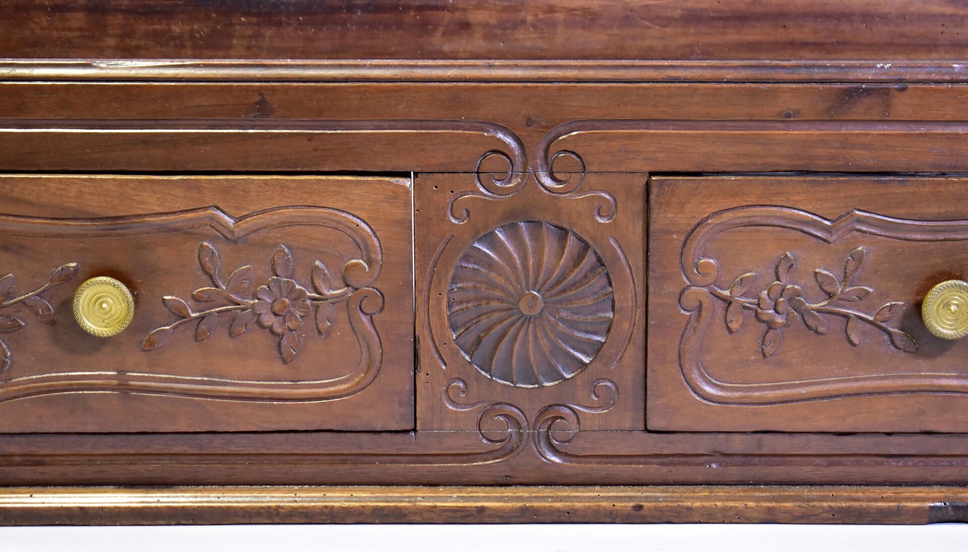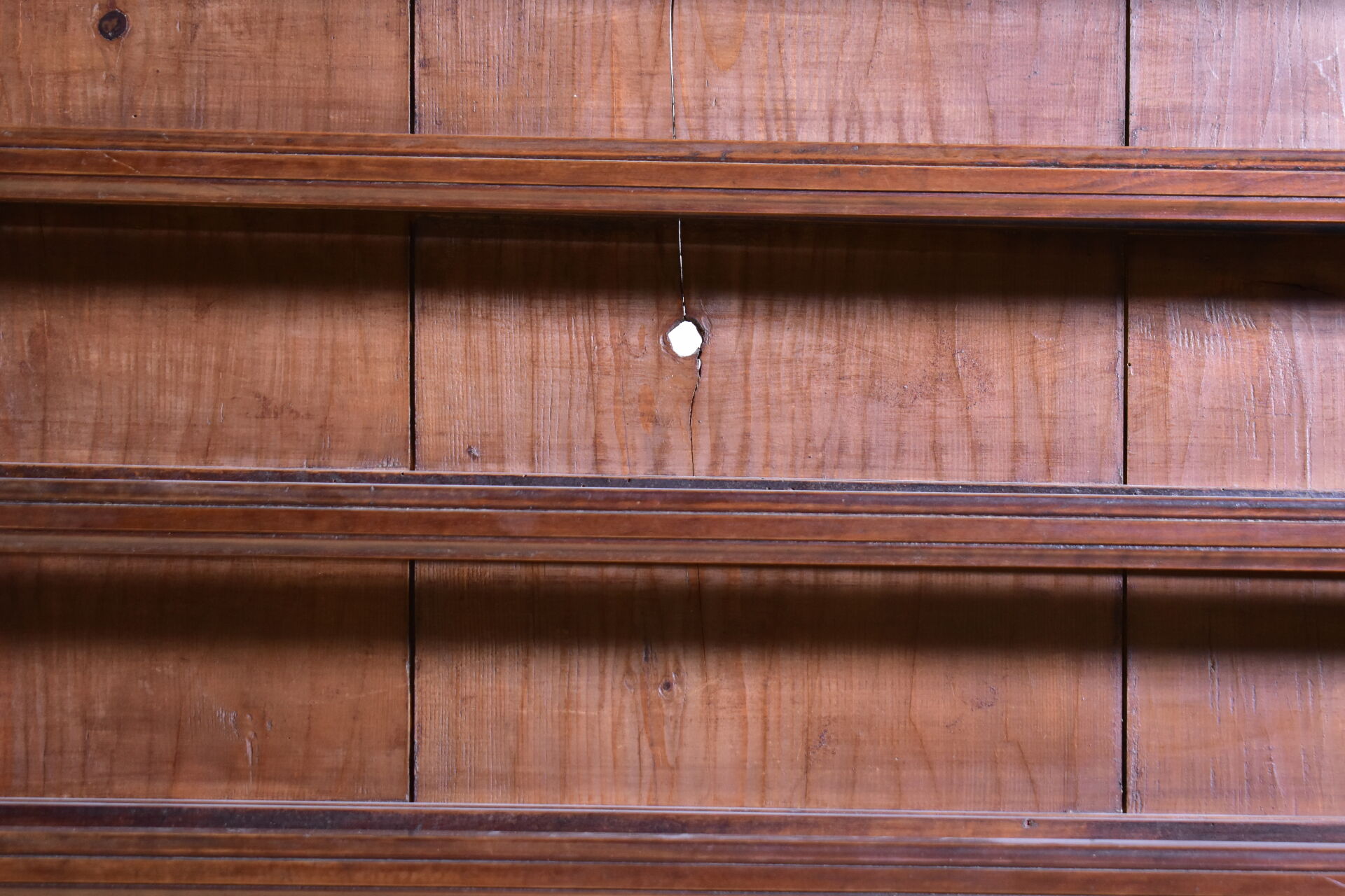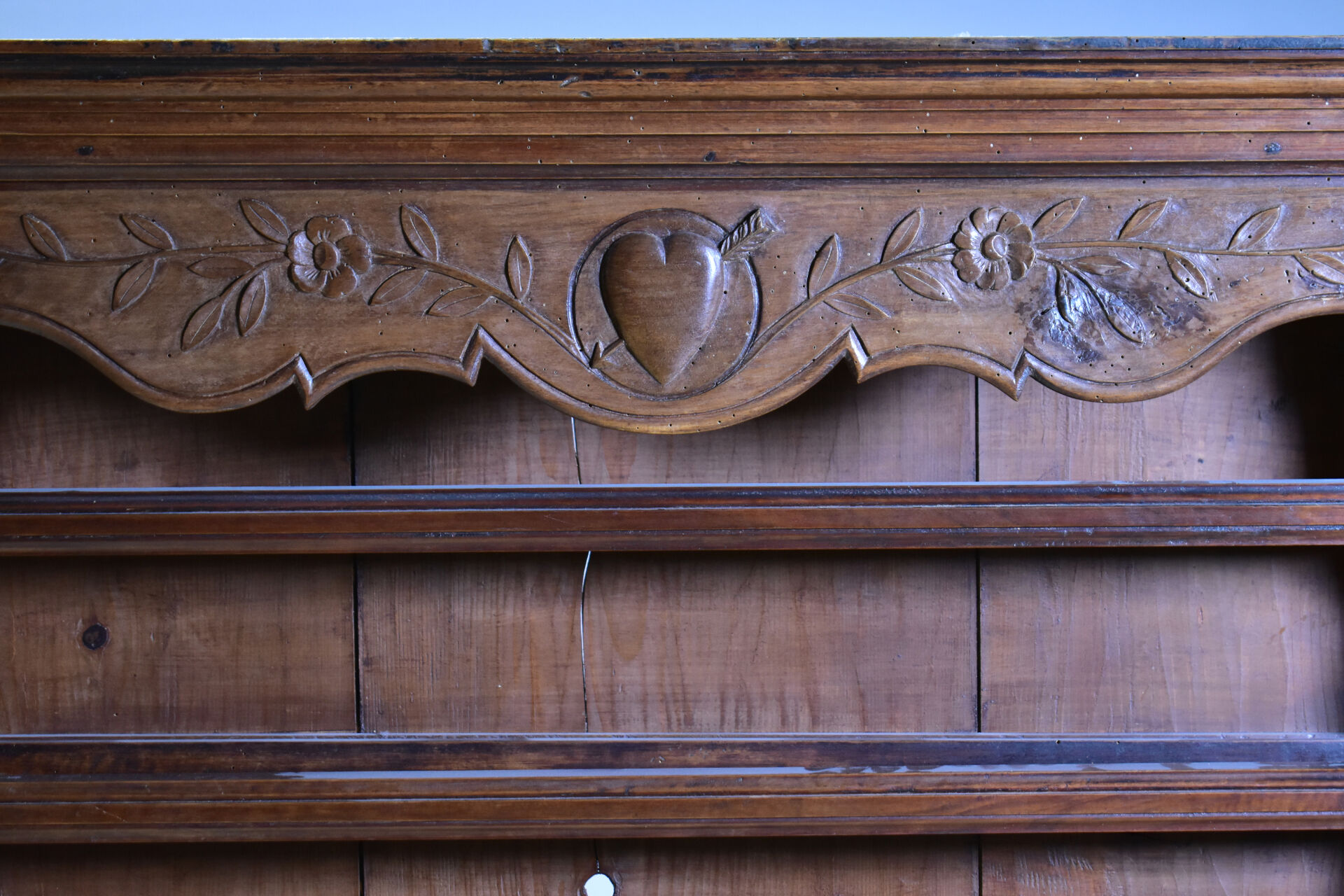 Vaisselier en noyer mouluré ouvrant à deux tiroirs en partie basse. XIXe siècle. Haut. : 138 cm – Larg. : 110 cm – Prof. : 27,5 cm.
