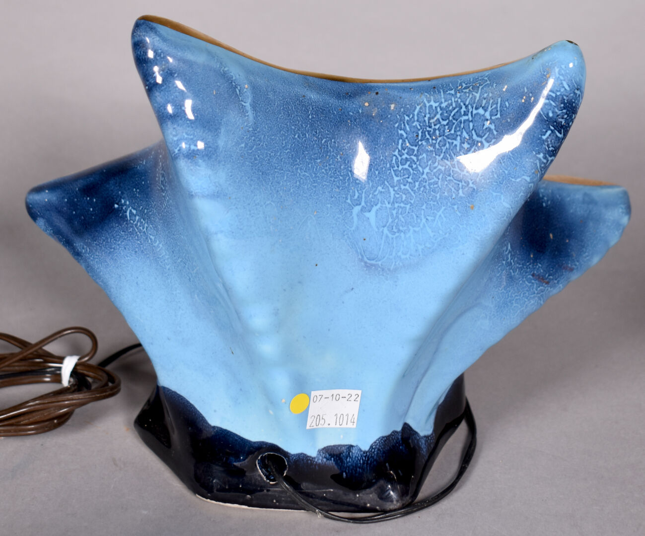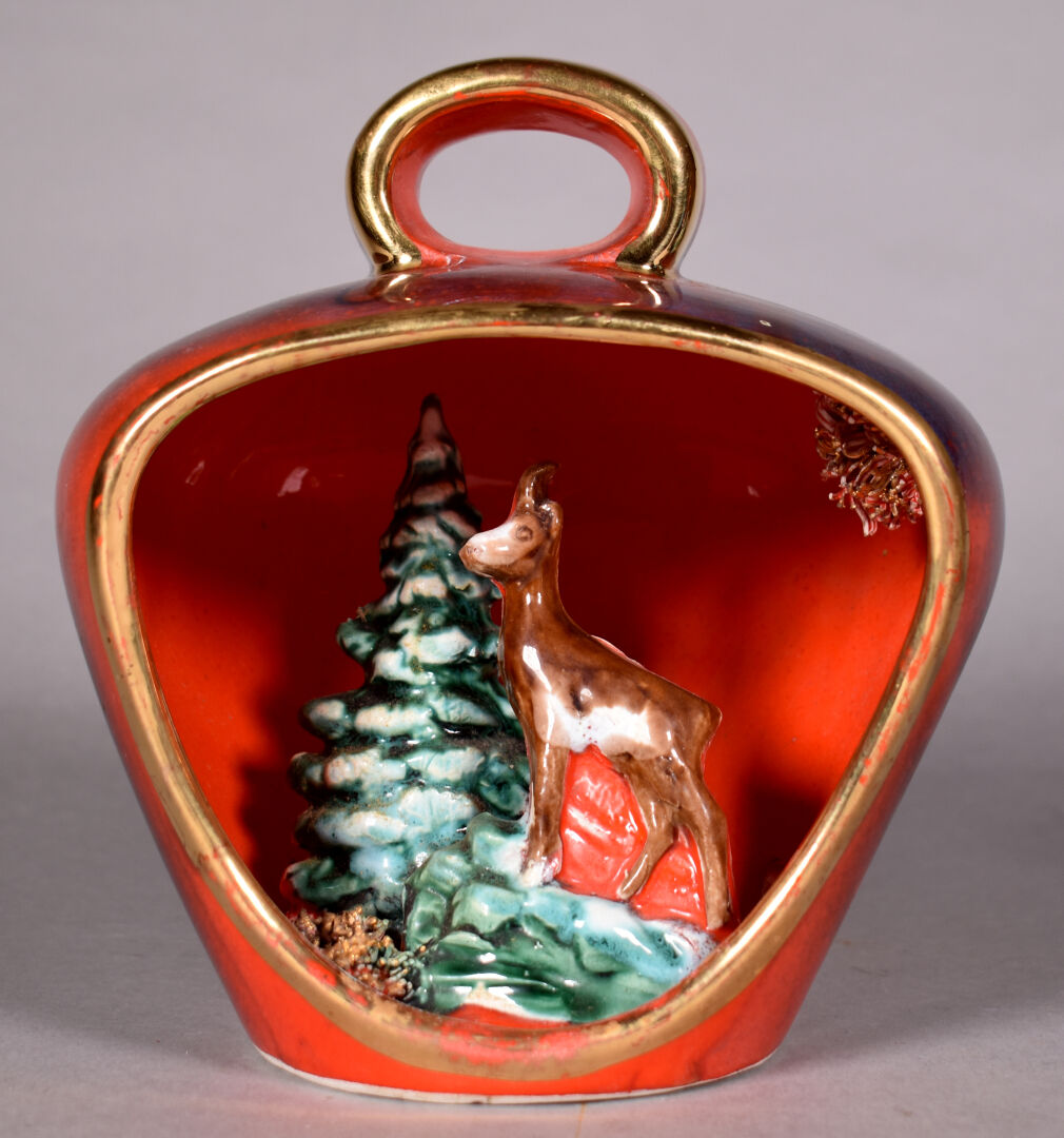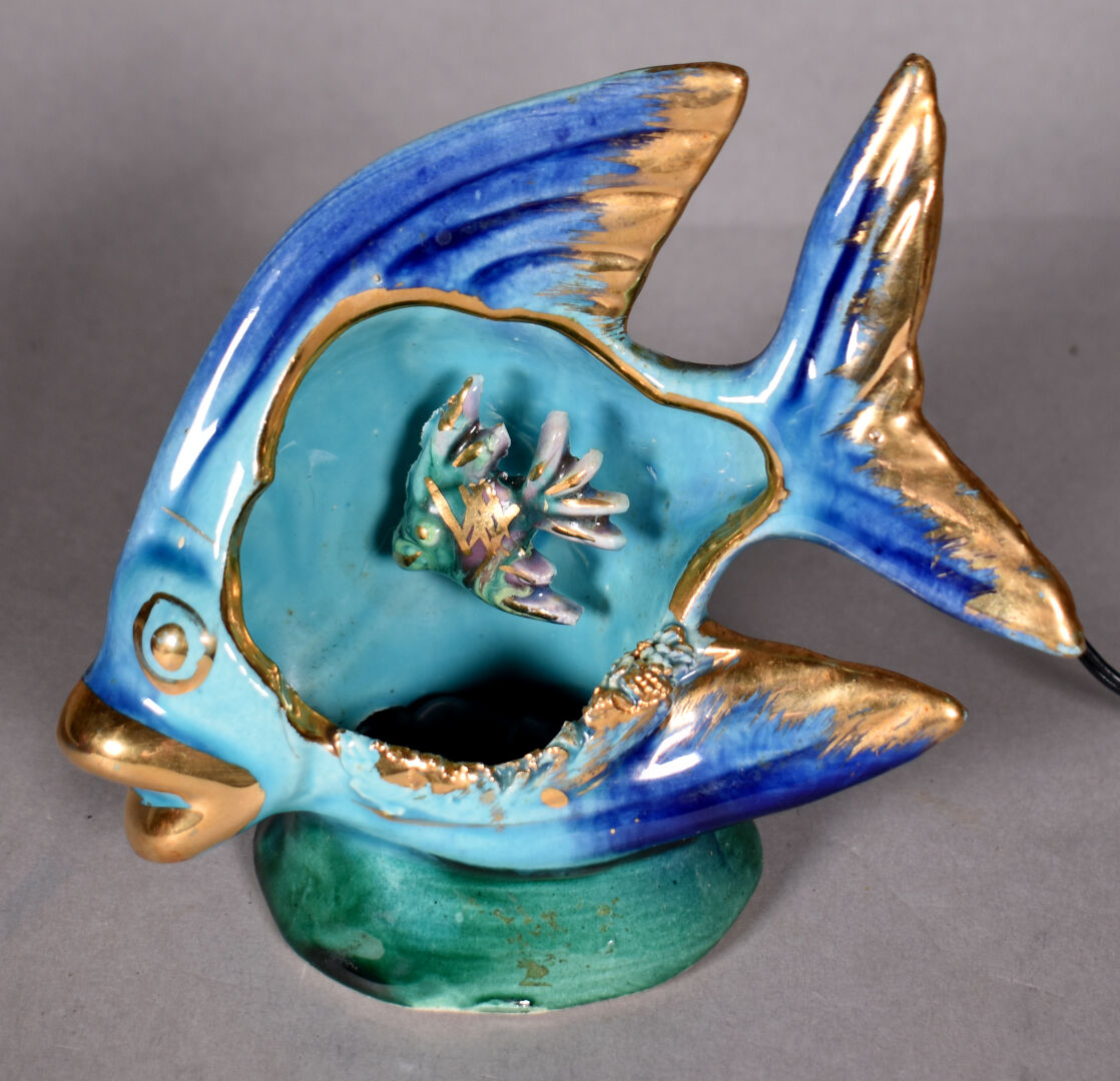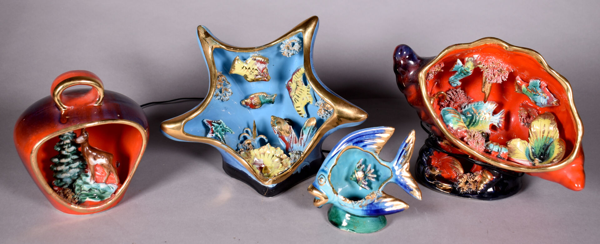 VALLAURIS. Ensemble de 4 lampes (une sans l’électricité) à décor de poissons et fonds marins dans des coquillages pour 3 et d’un chamois dans un paysage de neige. Vers 1950/1960. Haut. de l’étoile : 21 cm – Larg. : 26 cm.