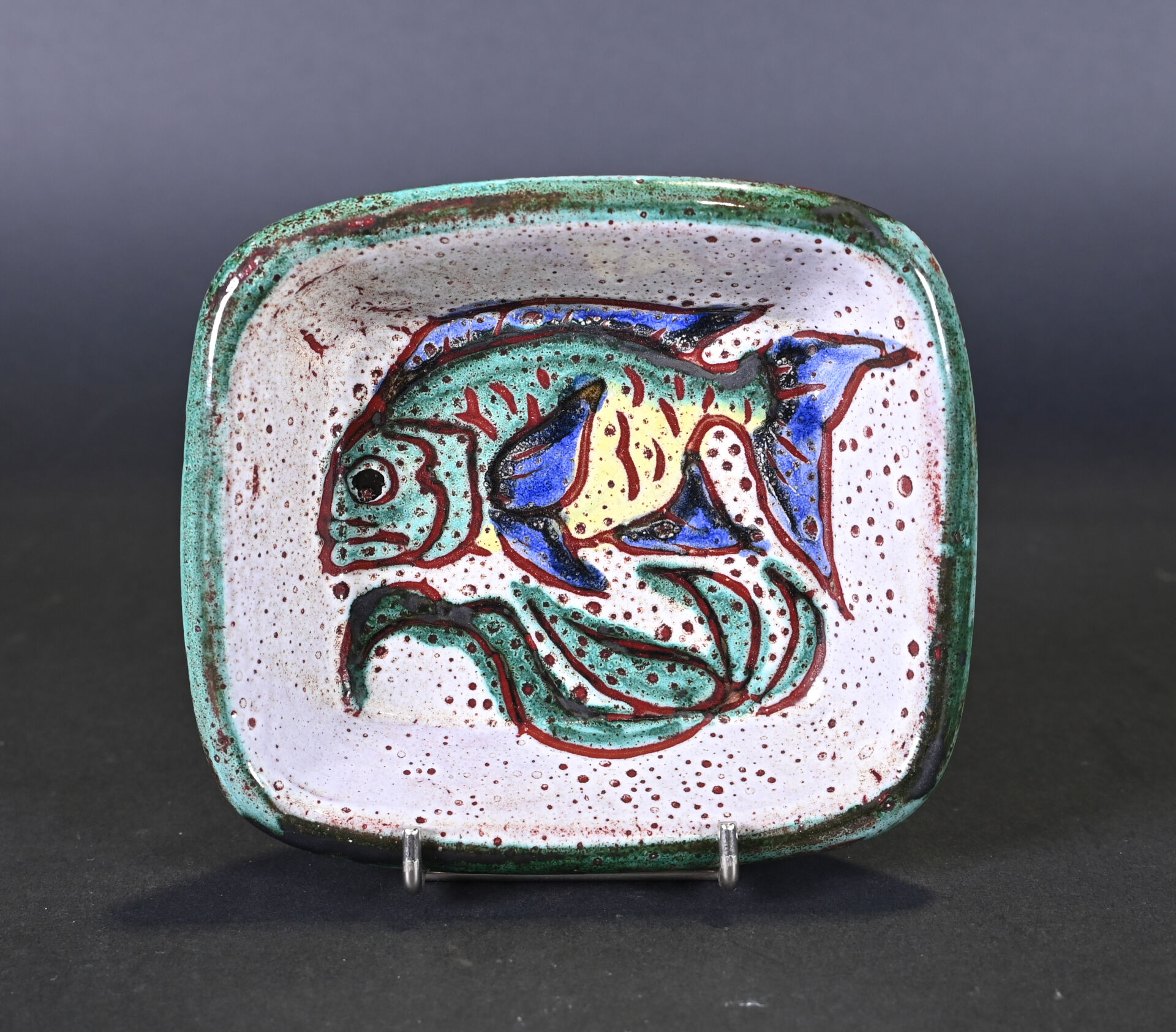VALLAURIS. Ensemble en céramique soit une coupe en forme de feuille en noir, jaune et or (usures, petits éclats), un vide-poche à décor d’un poisson et un petit vase à décor d’une cigale et d’une branche de pin (égrenures et un éclat). Marqués.