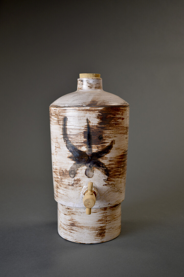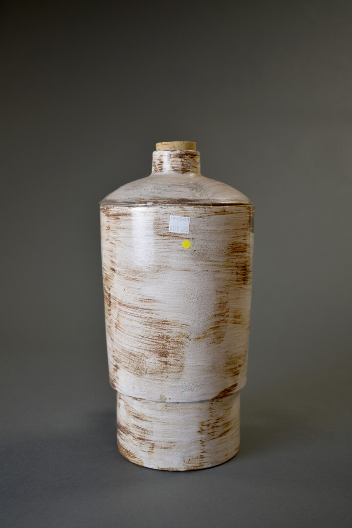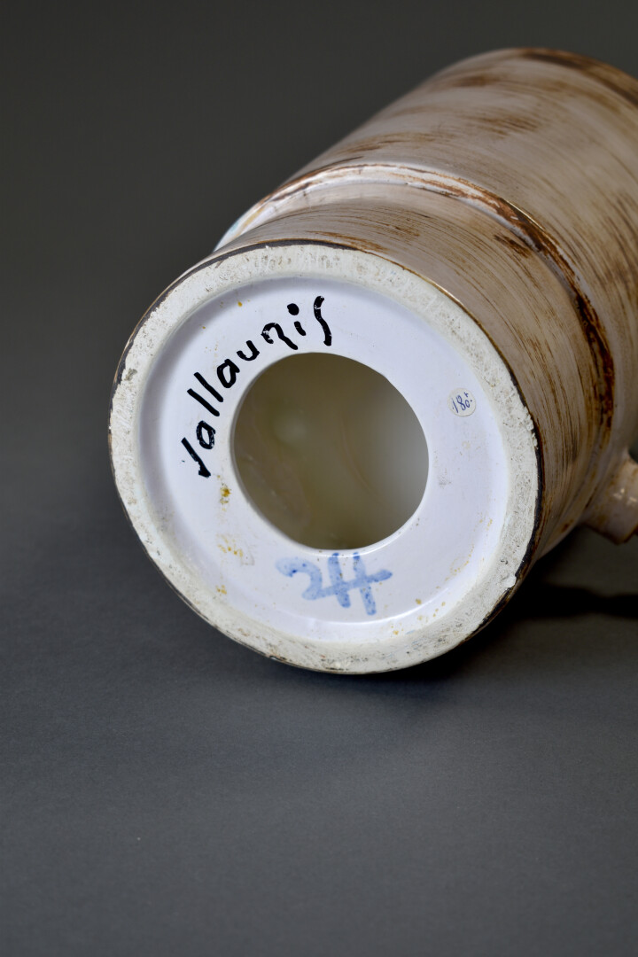 VALLAURIS. Fontaine à huile (?) ou vinaigrier en céramique émaillé crème et brun. Milieu du XXe siècle. Marqué au dessous. Haut. : 35 cm.
