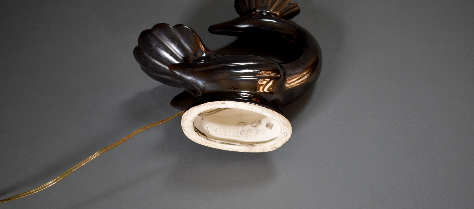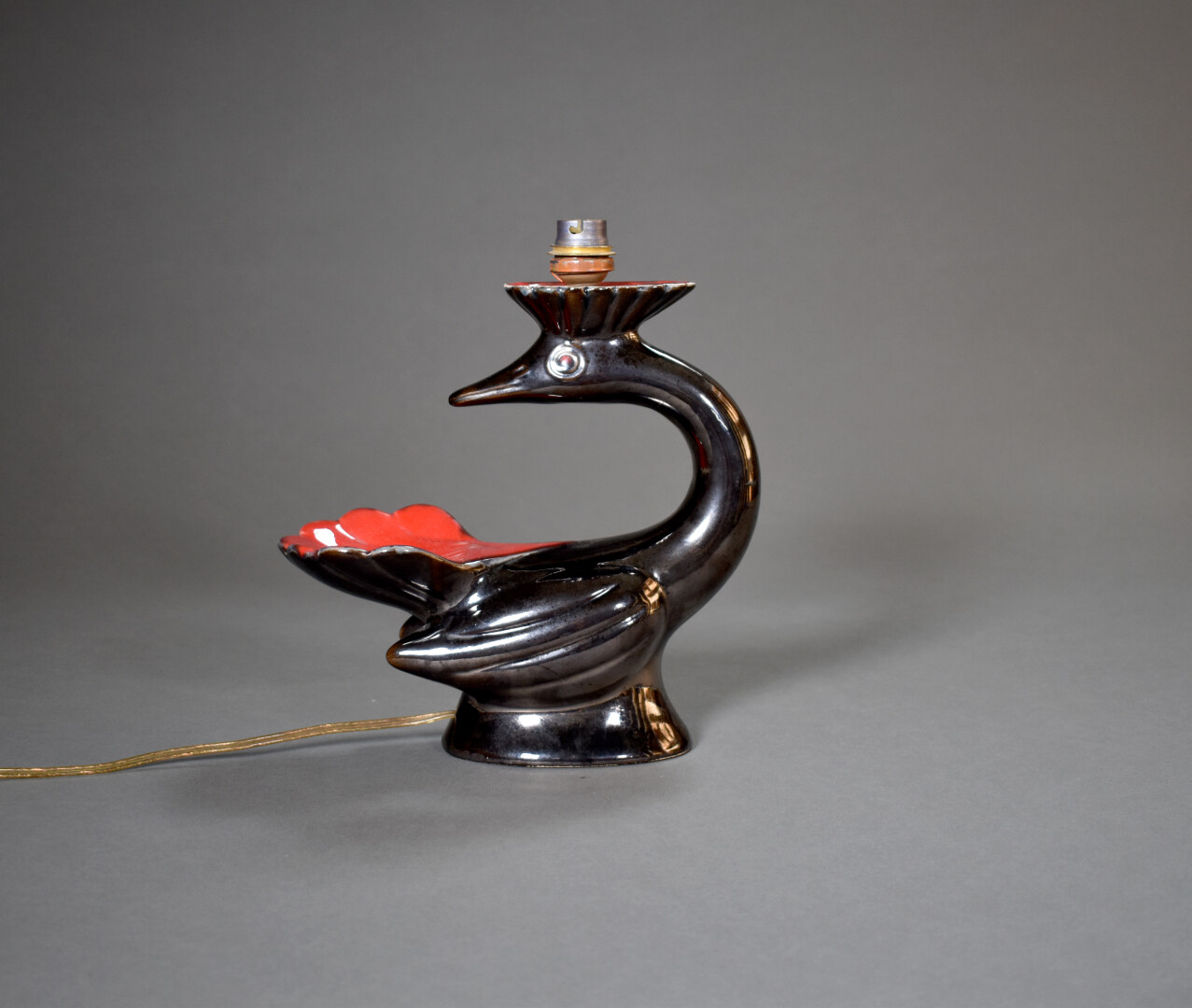 VALLAURIS. Pied de lampe en forme d’oiseau en céramique émaillée noir métallisé et rouge. Electrifié. Milieu du XXe siècle. Haut. : 26 cm