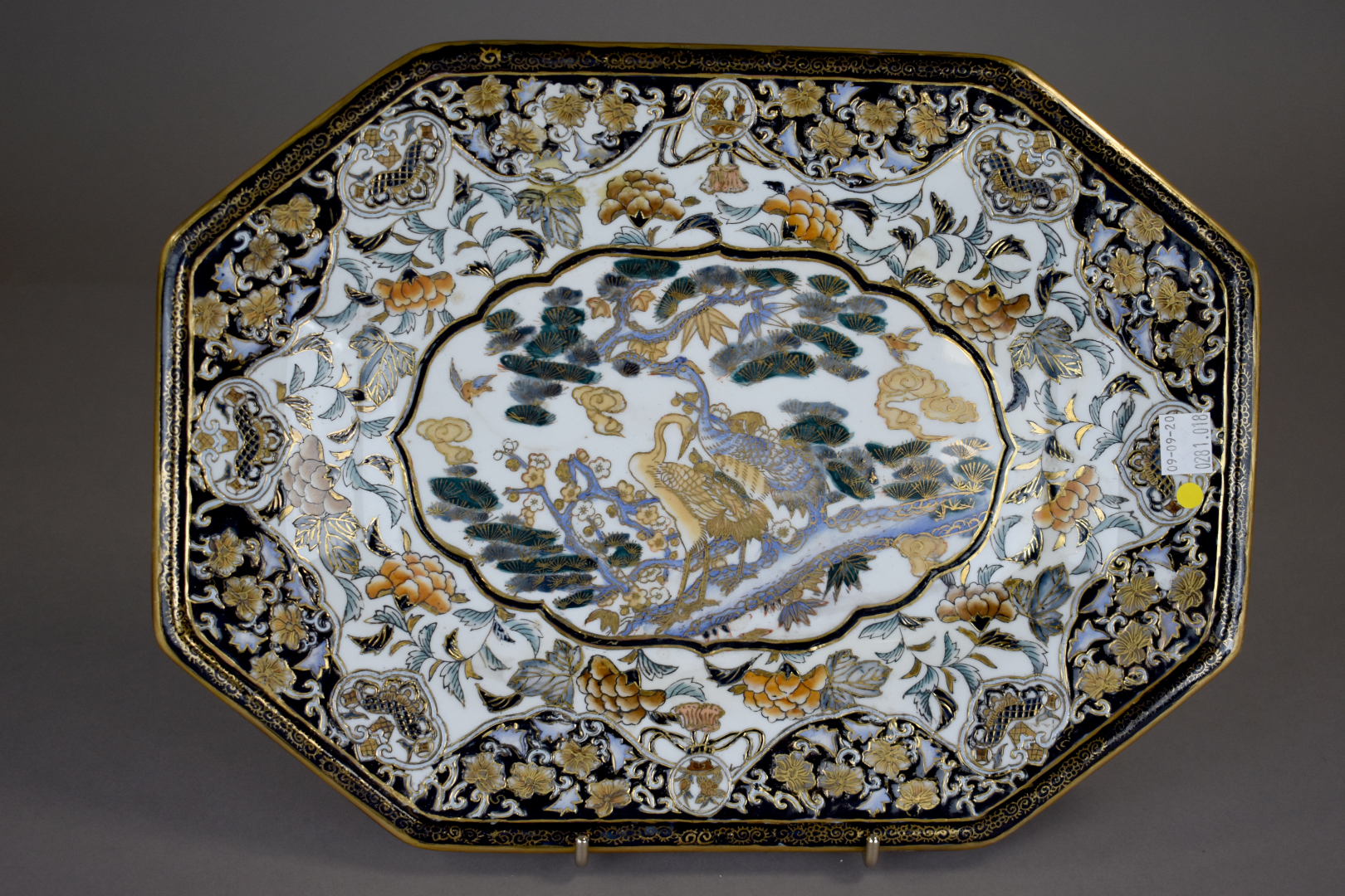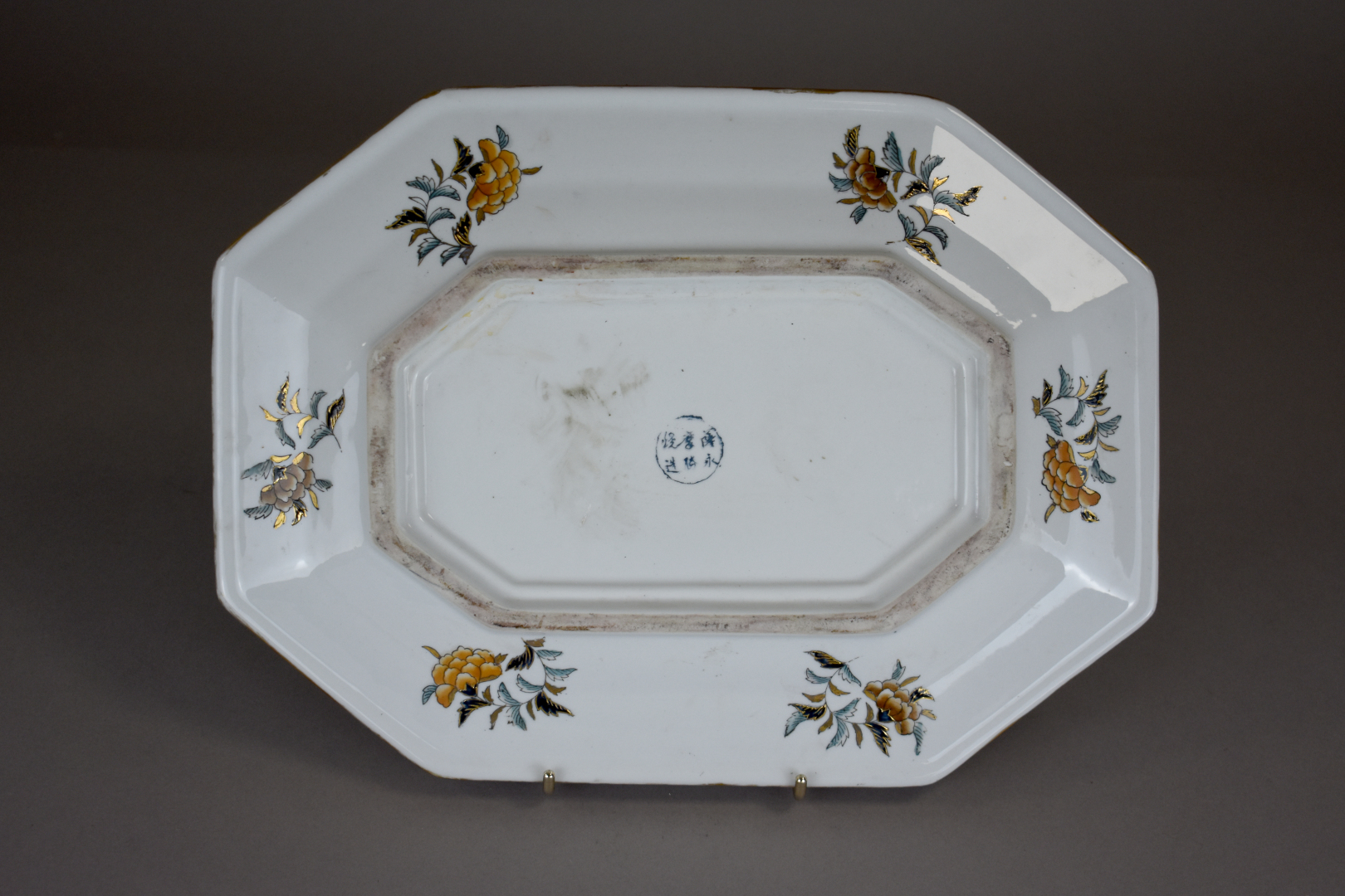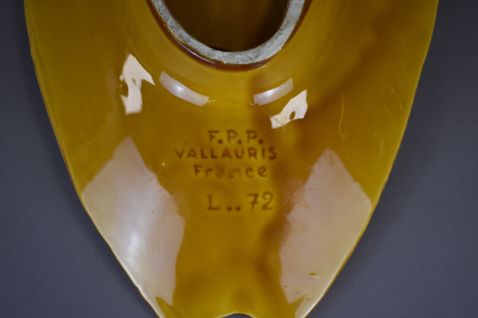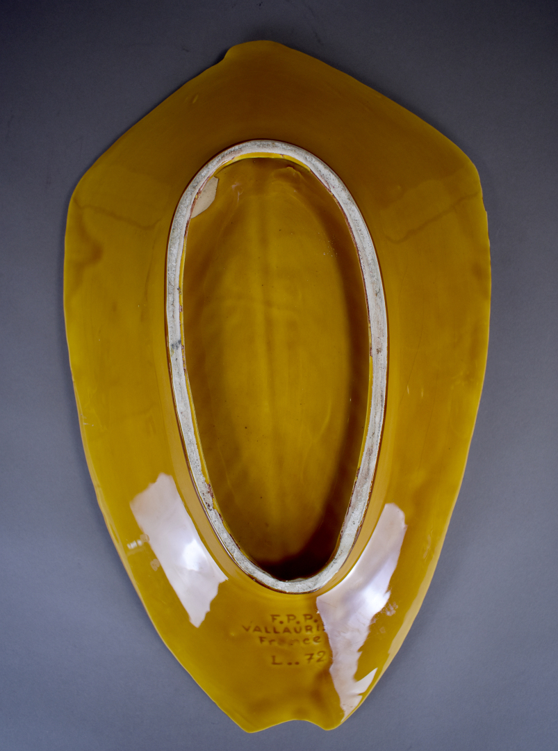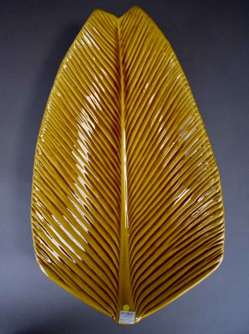VALLAURIS. Plat feuille en céramique ocre. Signé sous la base. Long. : 42 cm. On joint un plat en porcelaine de la Chine.