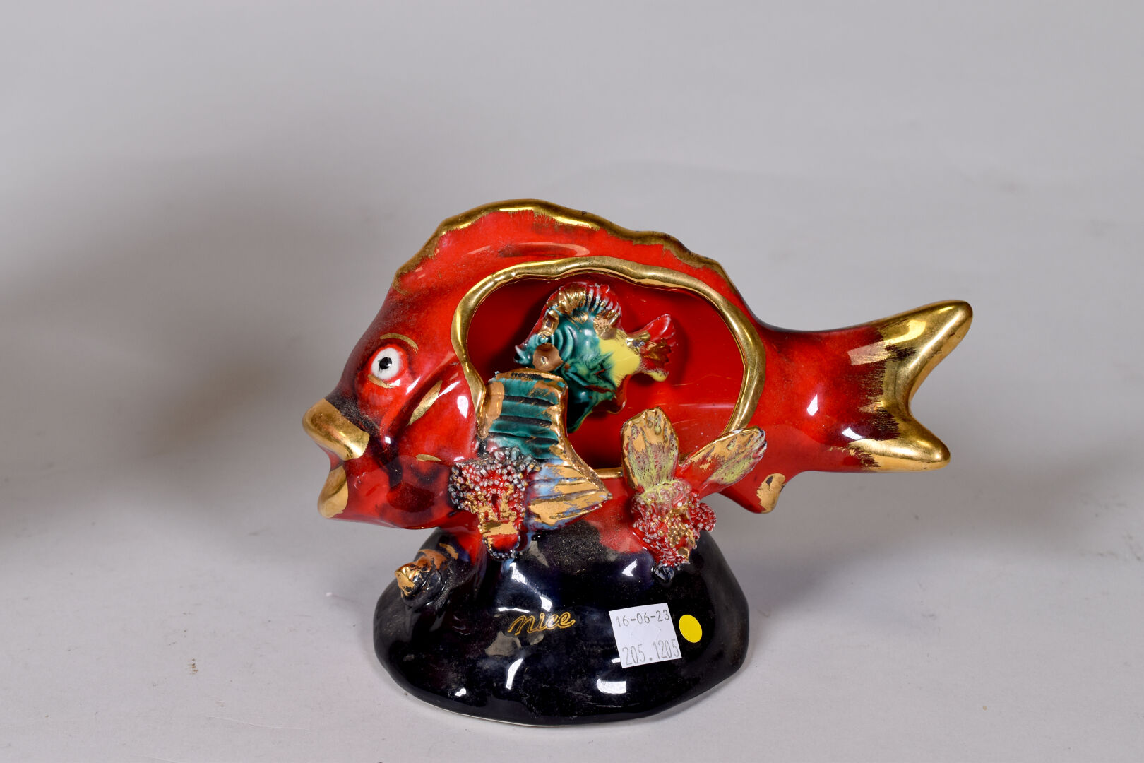 VALLAURIS. Une lampe à poser et une veilleuse en céramique émaillée. Une à reflets irisés et motifs de fonds marins, l’autre figurant un poisson. Haut. : 28 cm (avec un abat-jour) et 13 cm.