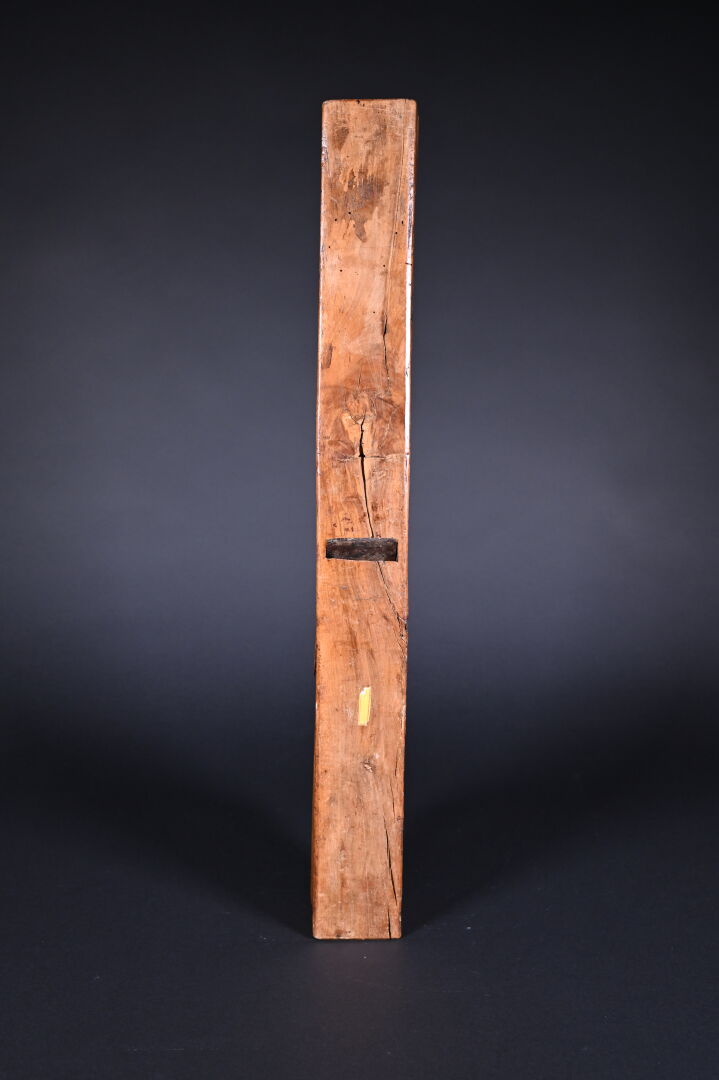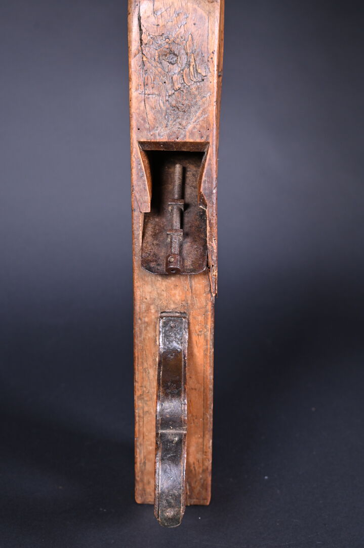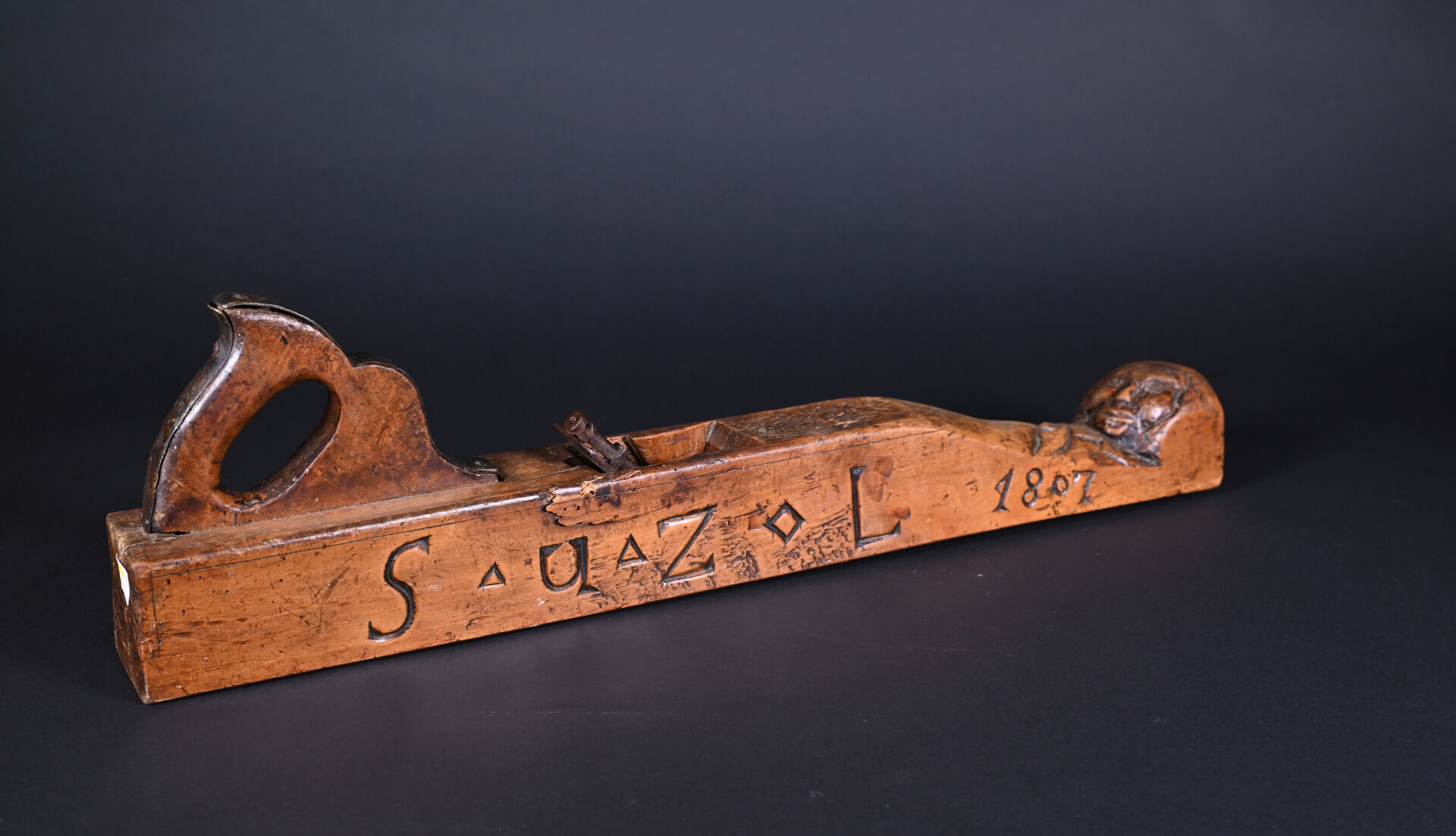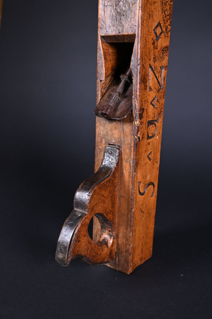 Varlope à décor sculpté d’une tête humaine, datée 1807. Long. : 66,5 cm.