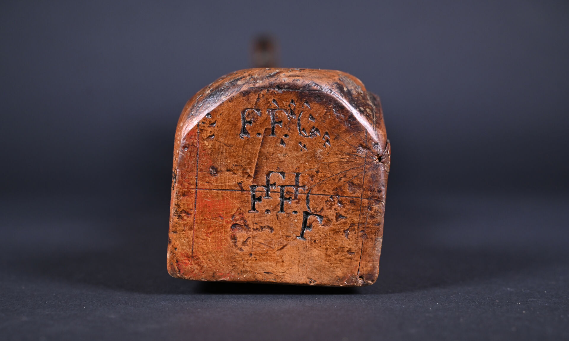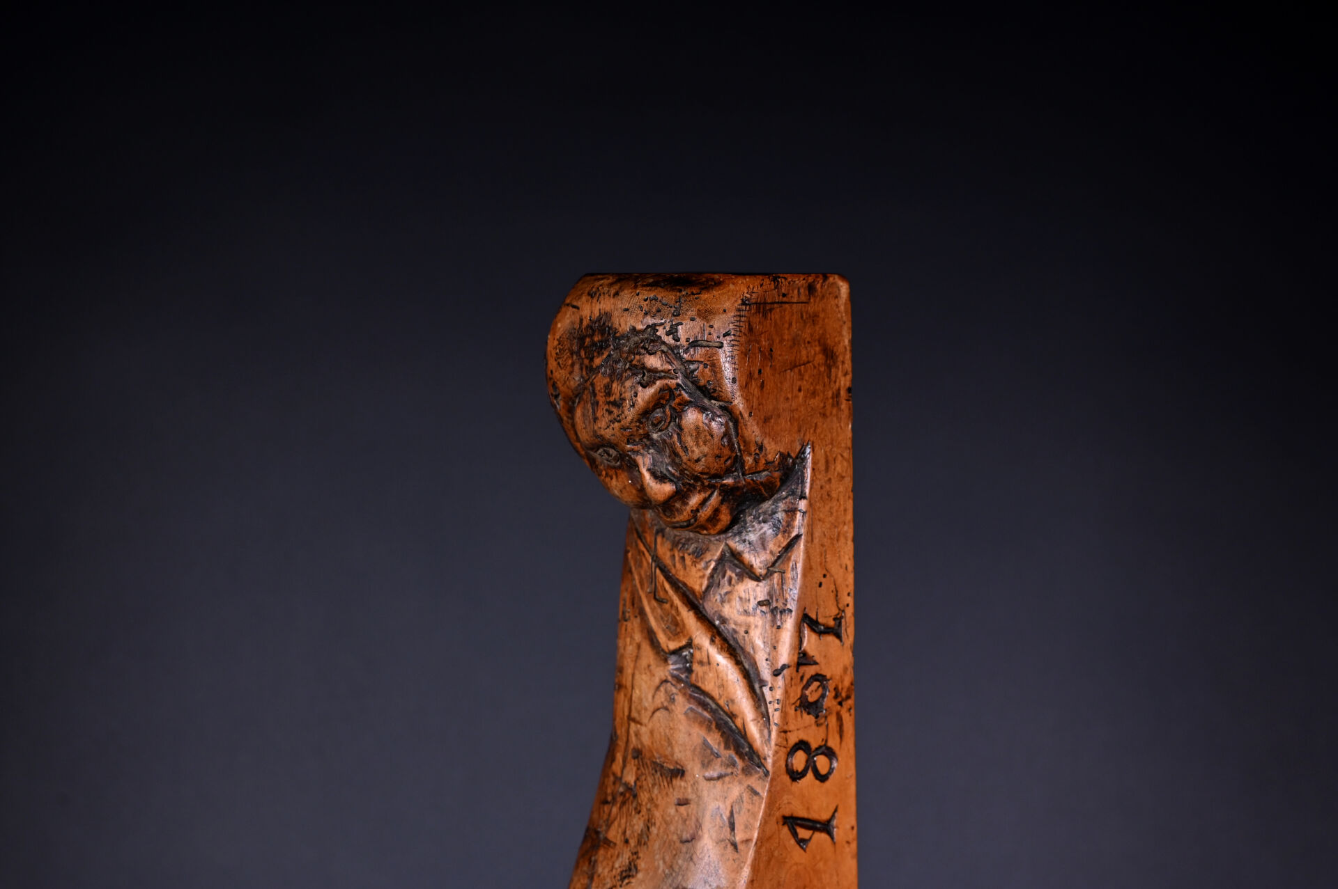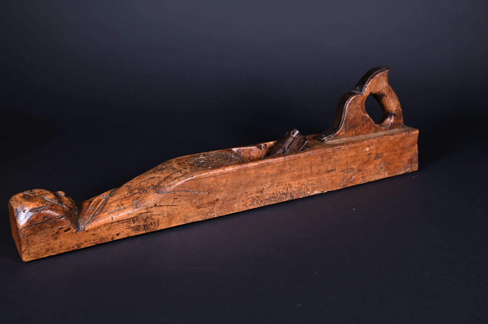 Varlope à décor sculpté d’une tête humaine, datée 1807. Long. : 66,5 cm.
