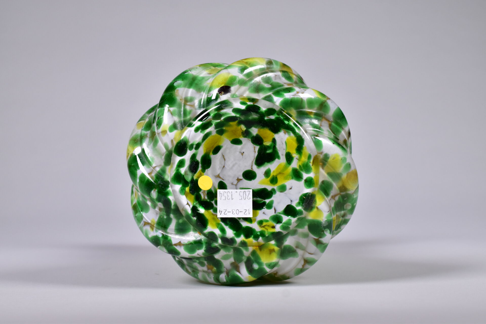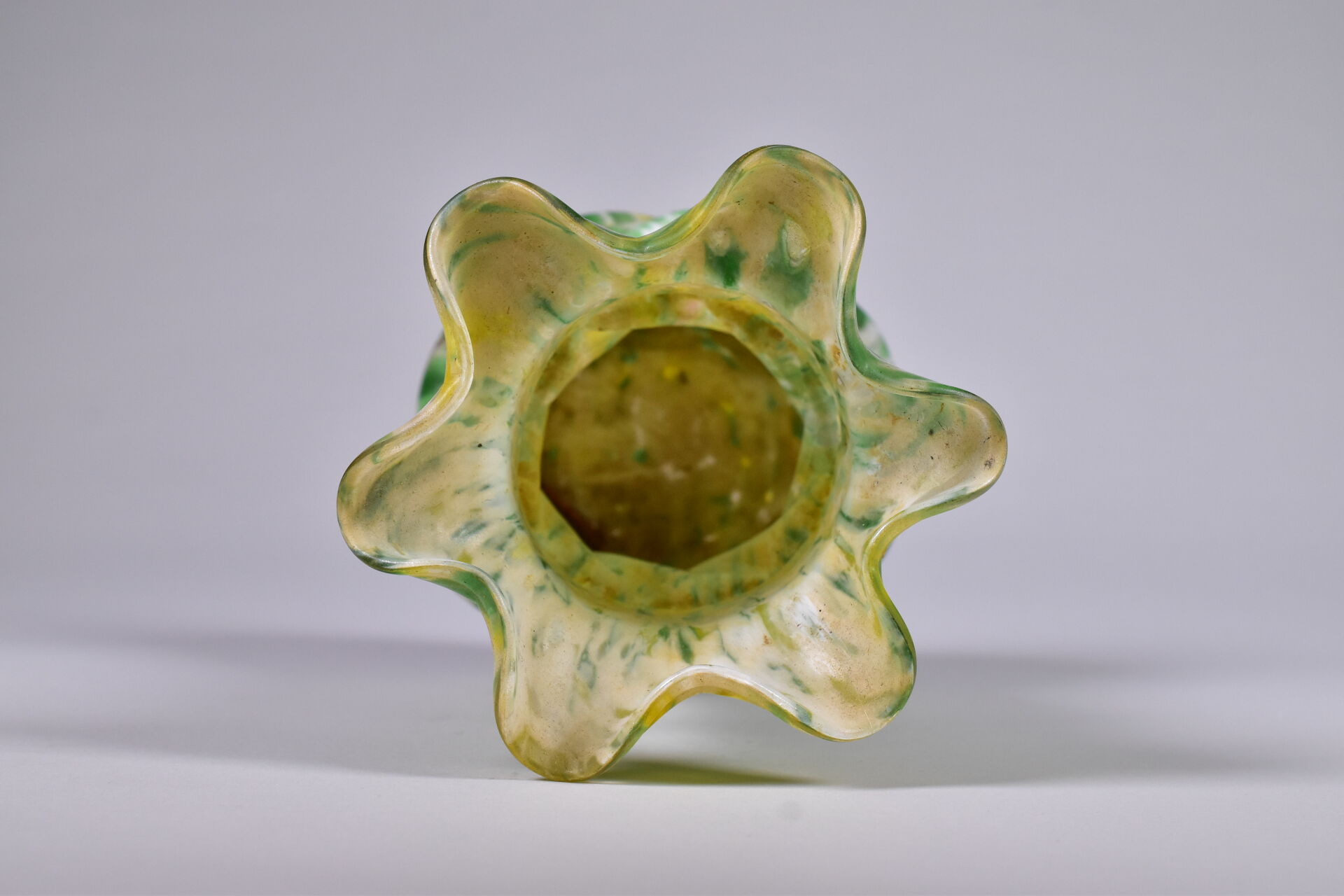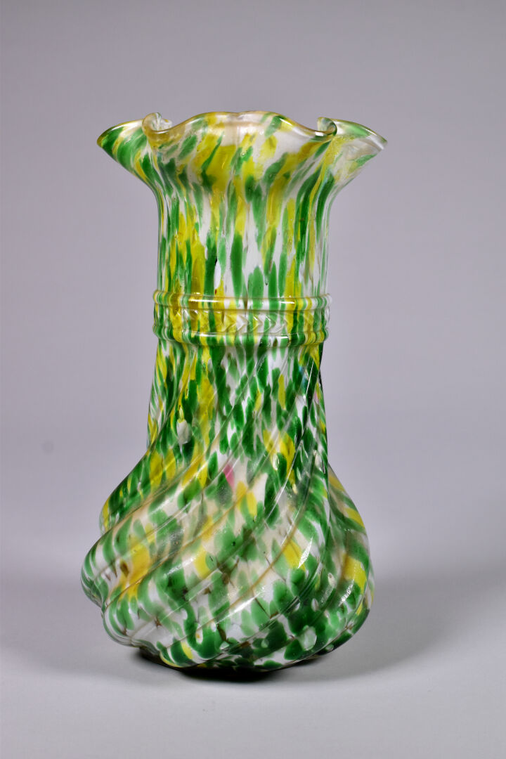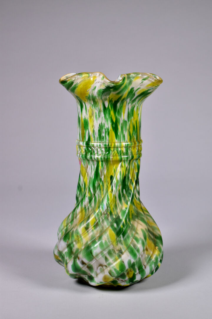 Vase à larges godrons et col en corole en verre marmoréen vert, jaune et crème. Dans le goût de Clichy. Haut. : 26 cm.