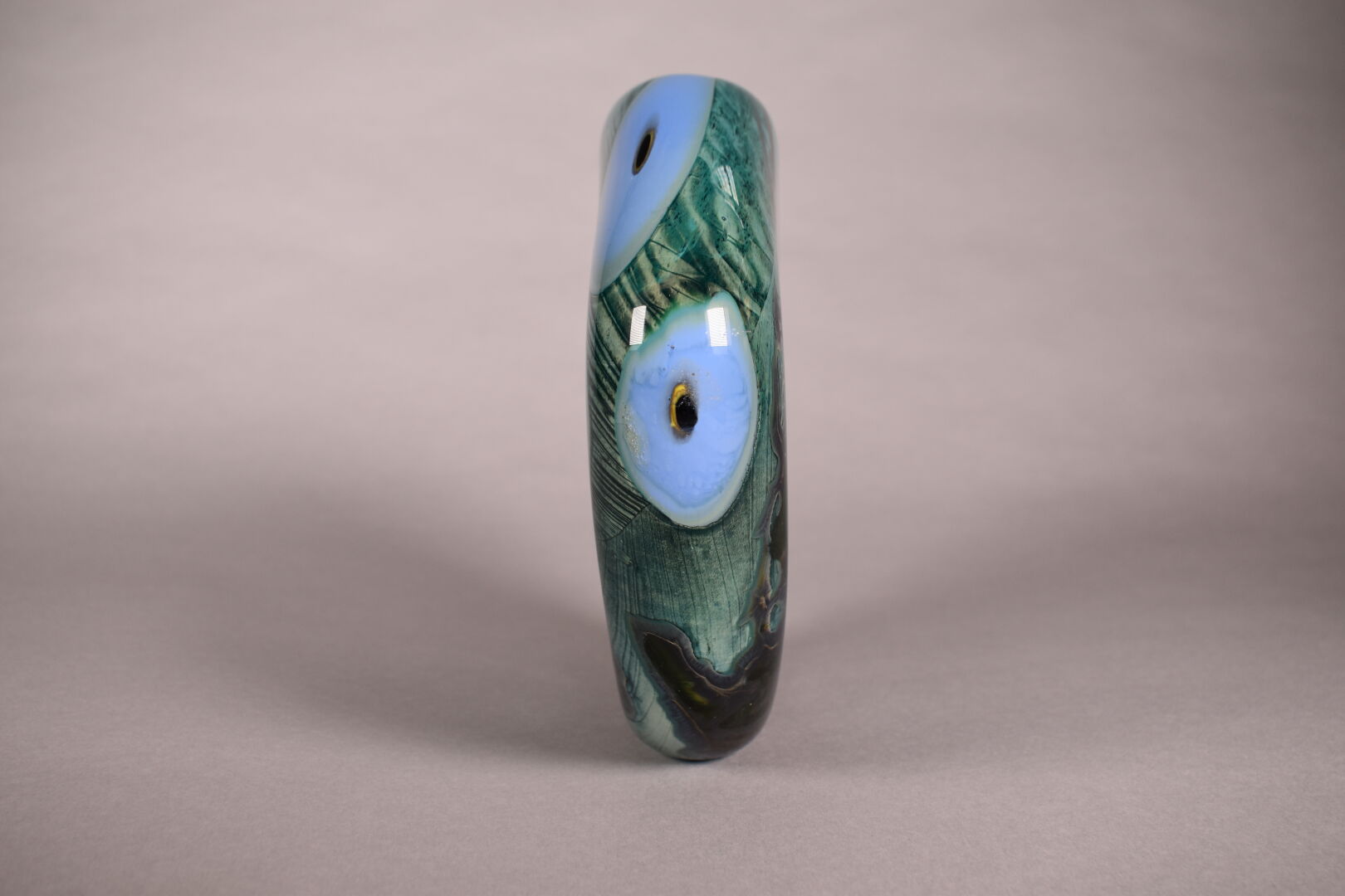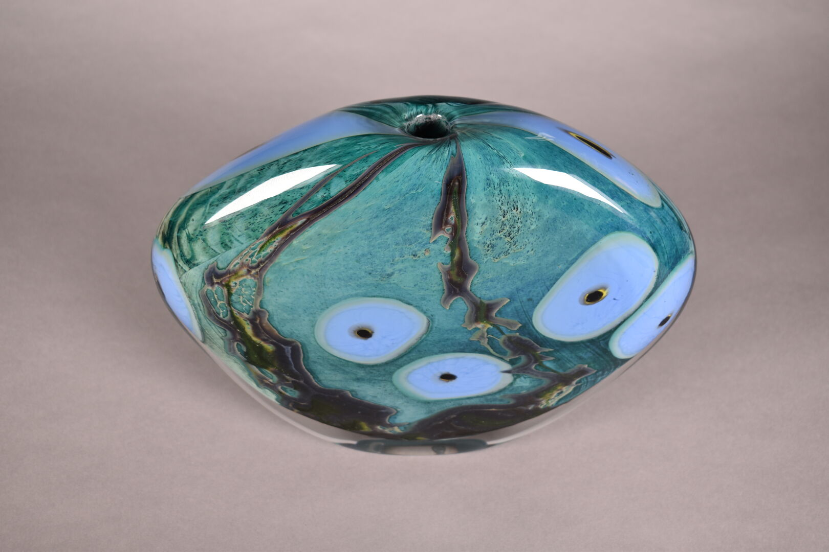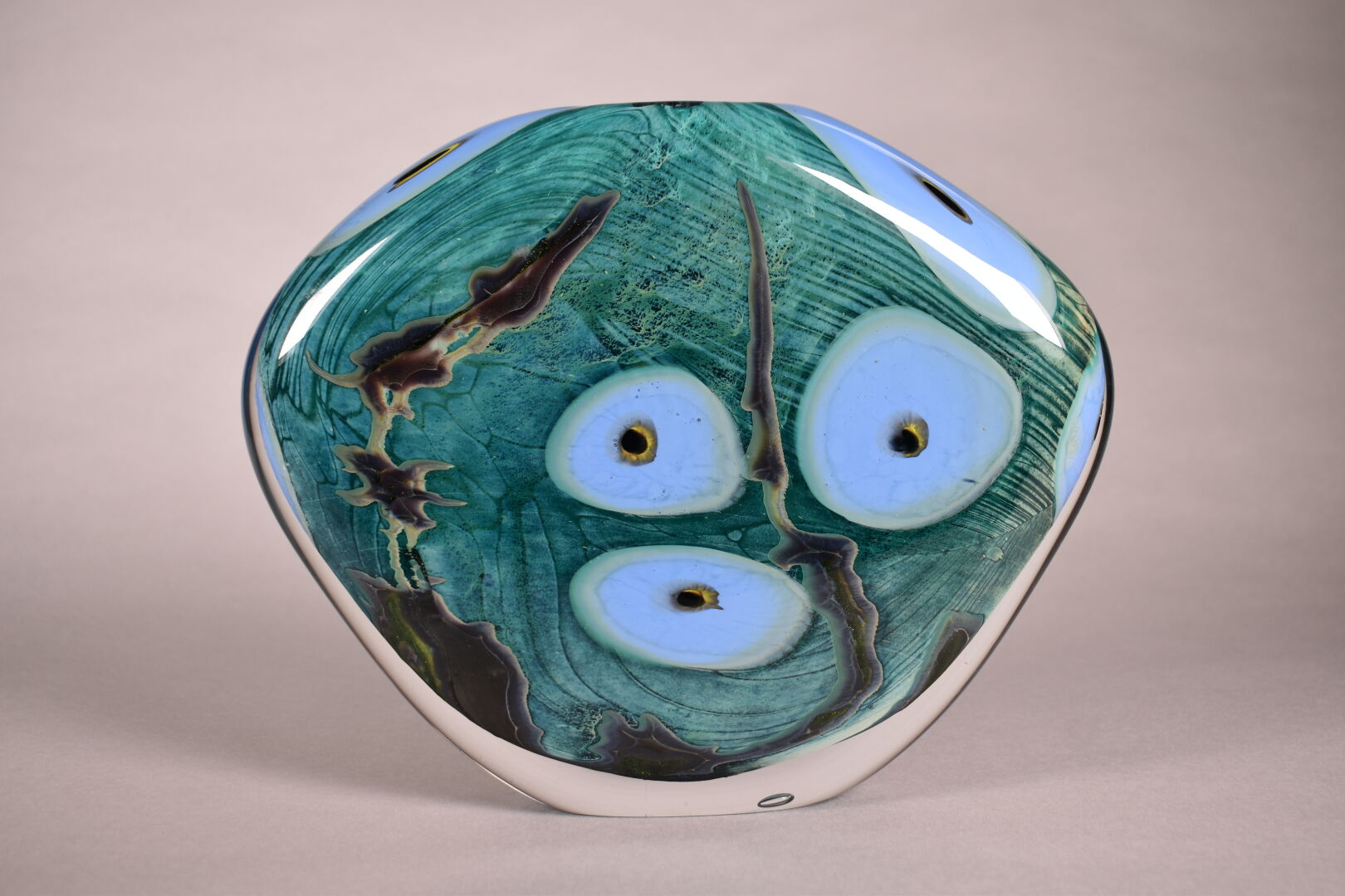 Vase à panse aplatie en verre vert et bleu. Murano, XXe siècle. Haut. : 22 cm.