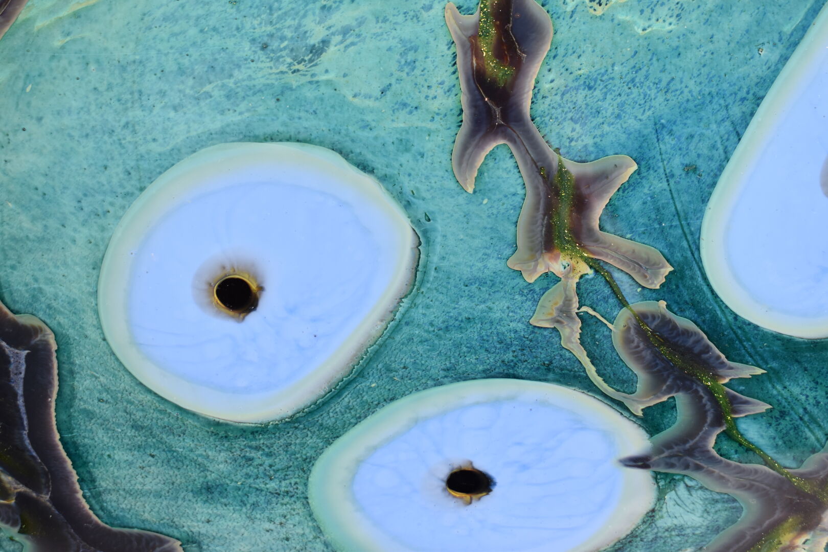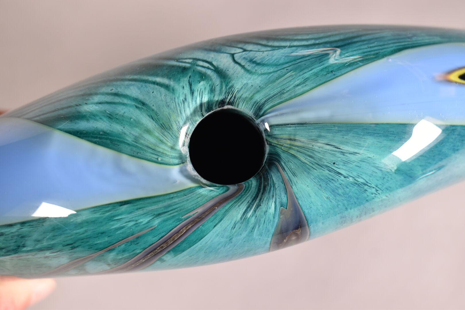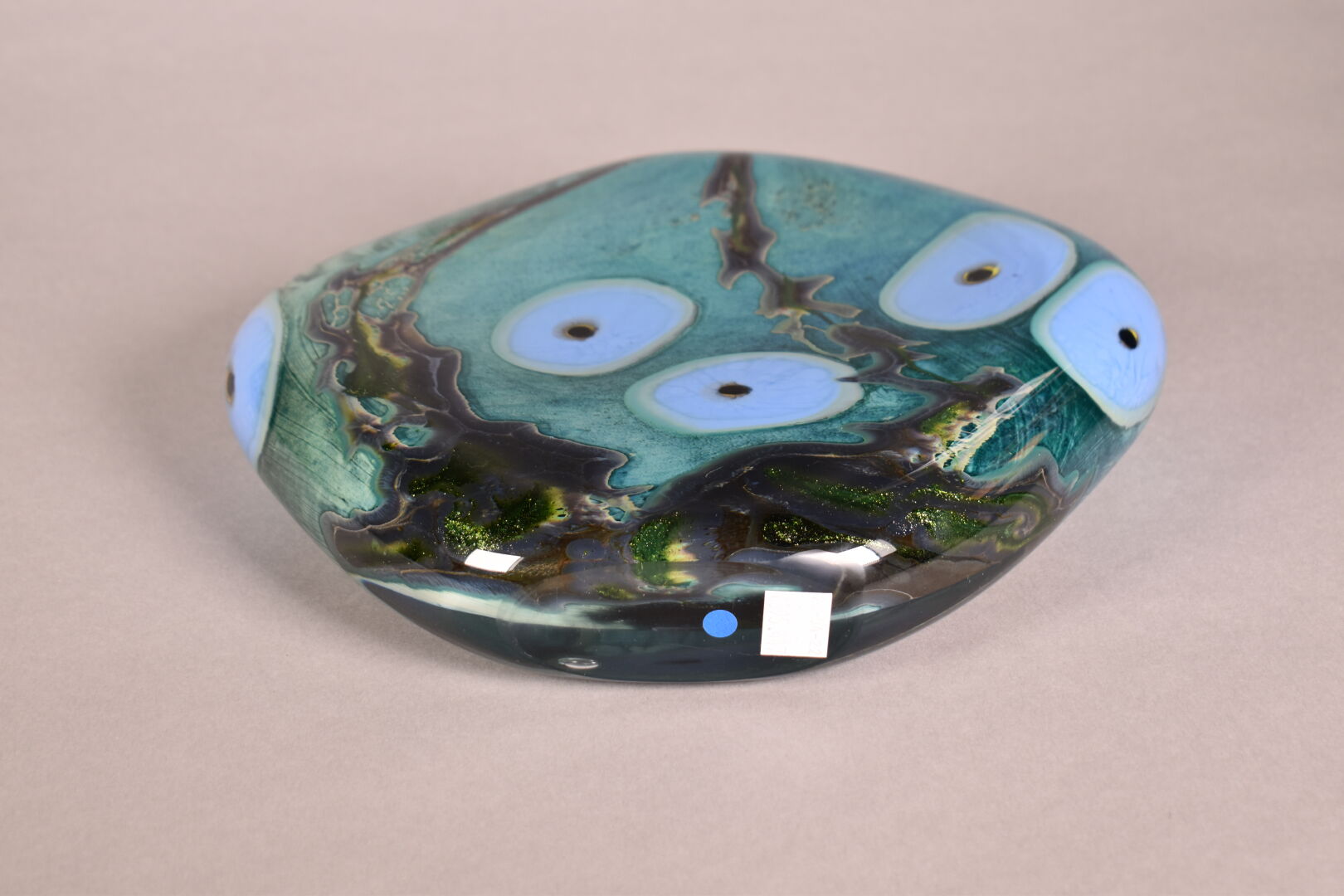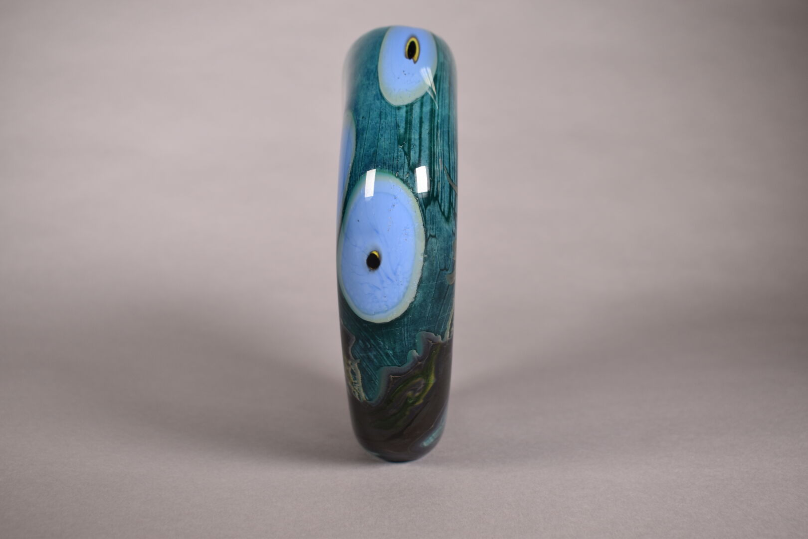 Vase à panse aplatie en verre vert et bleu. Murano, XXe siècle. Haut. : 22 cm.