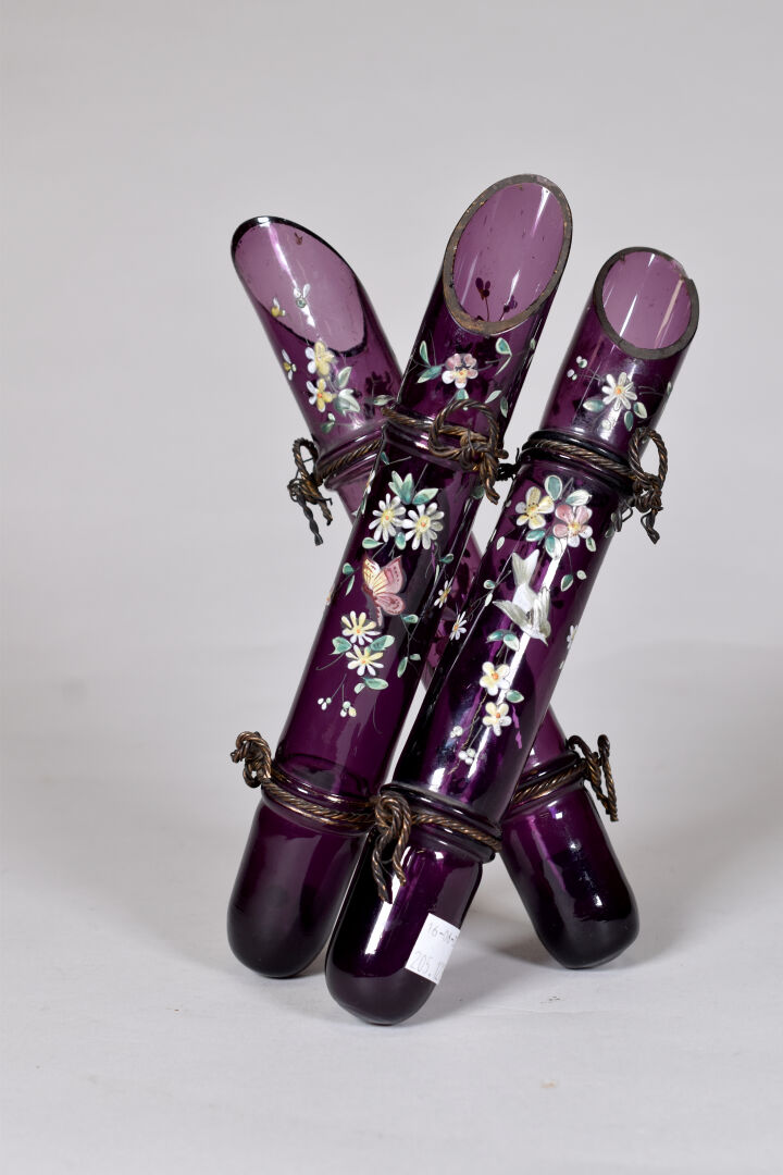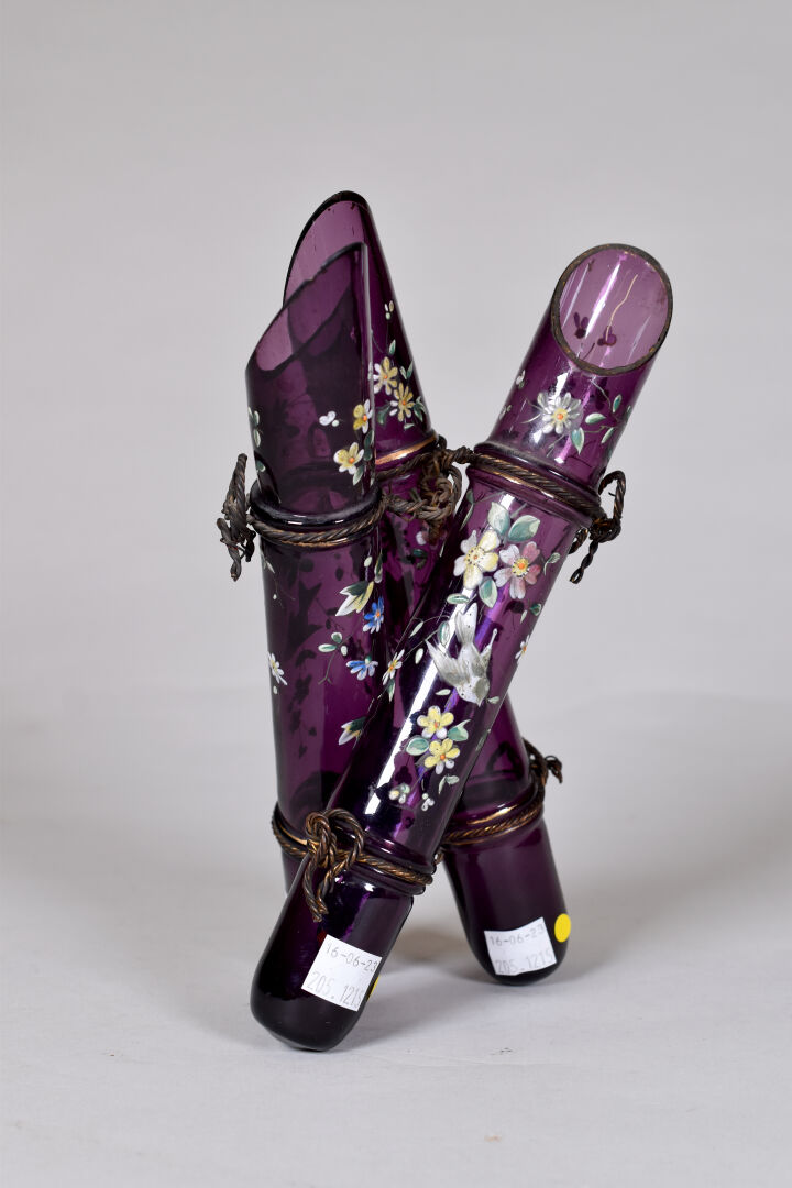 Vase à trois fuseaux en verre mauve émaillé en polychromie de fleurs et oiseaux (deux petits éclats). Ils sont retenus entre eux par des fils métalliques. Haut. : 25,5 cm.