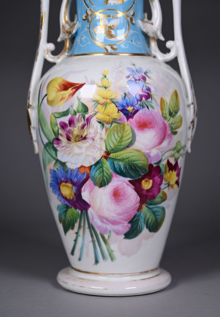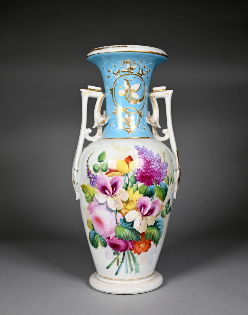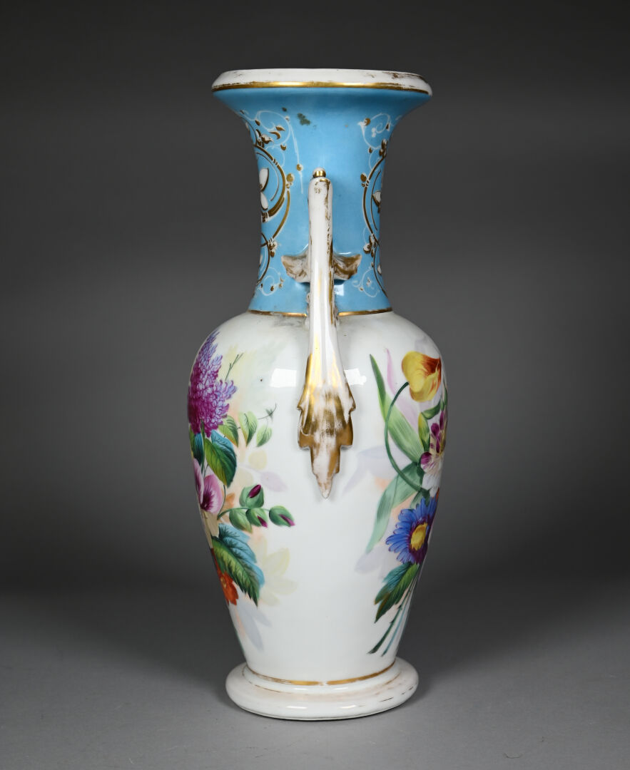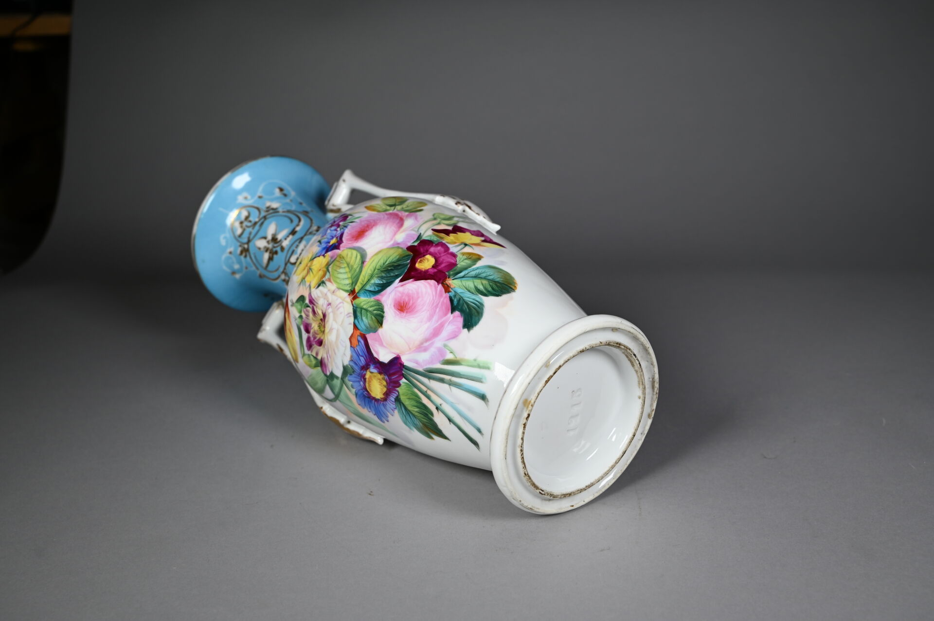 Vase balustre à anses en porcelaine à décor émaillé peint en polychromie d’un bouquet de fleur, le col à fond bleu ciel, dorure (usures). BAYEUX ? vers 1900. Haut. : 45 cm.
