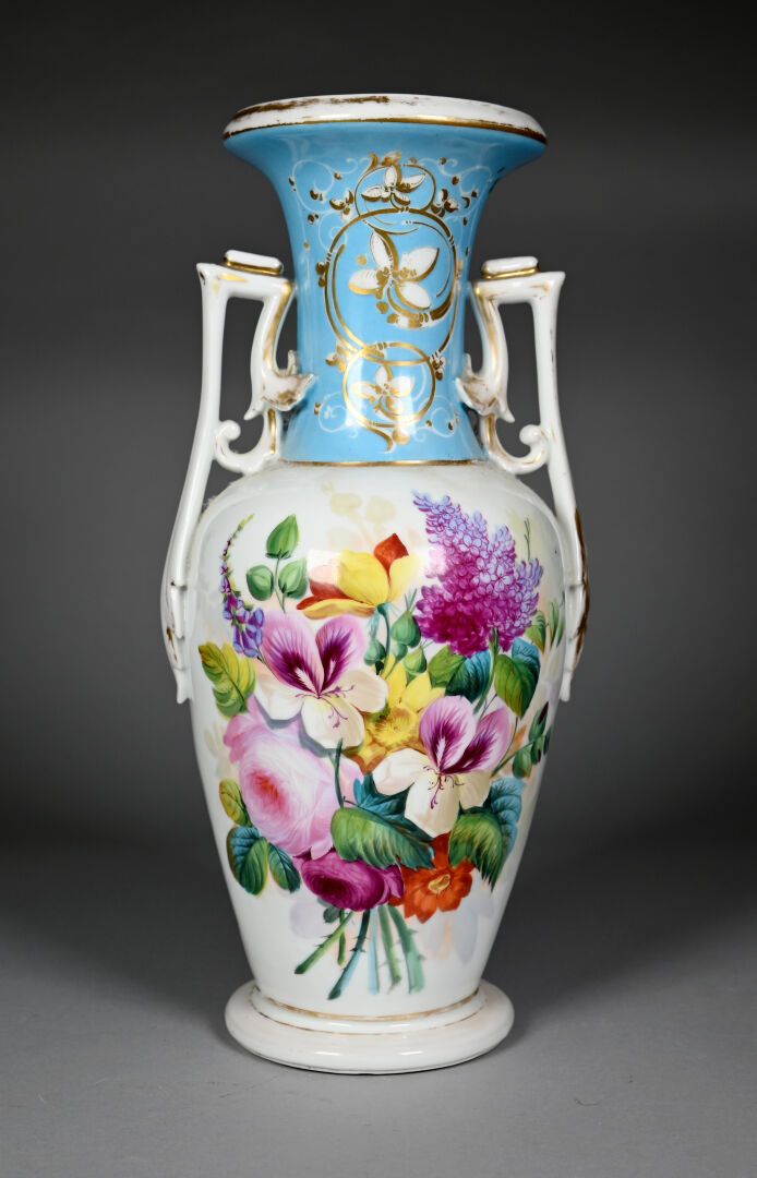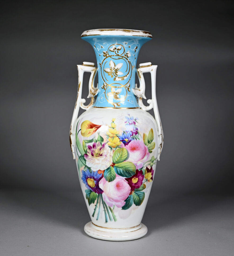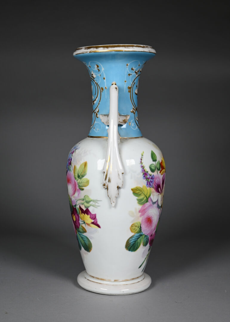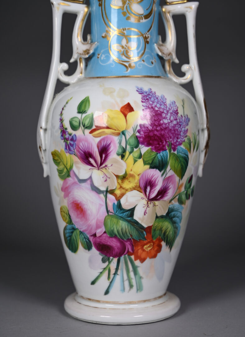 Vase balustre à anses en porcelaine à décor émaillé peint en polychromie d’un bouquet de fleur, le col à fond bleu ciel, dorure (usures). BAYEUX ? vers 1900. Haut. : 45 cm.