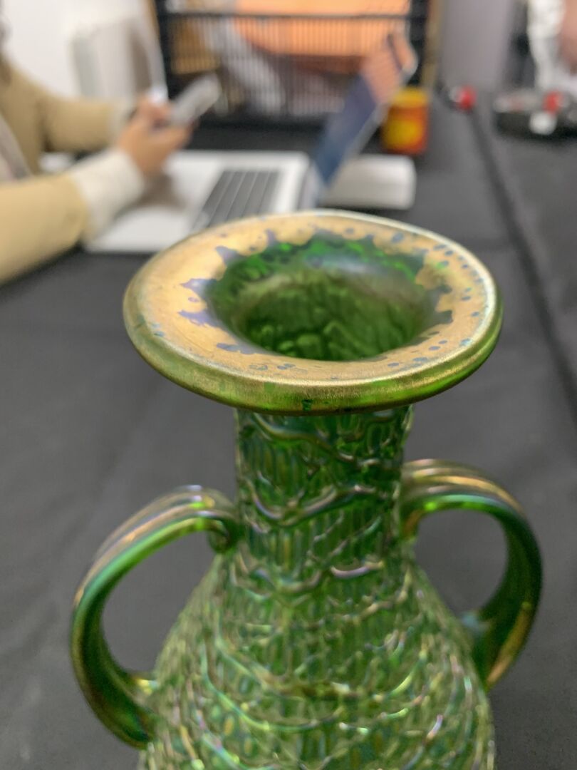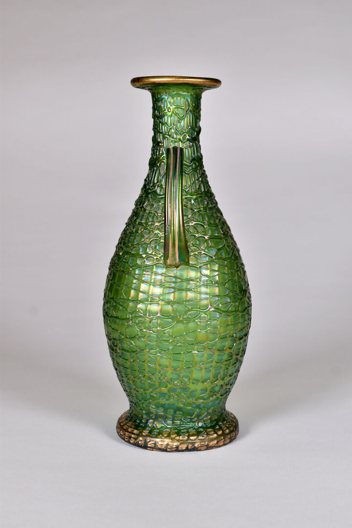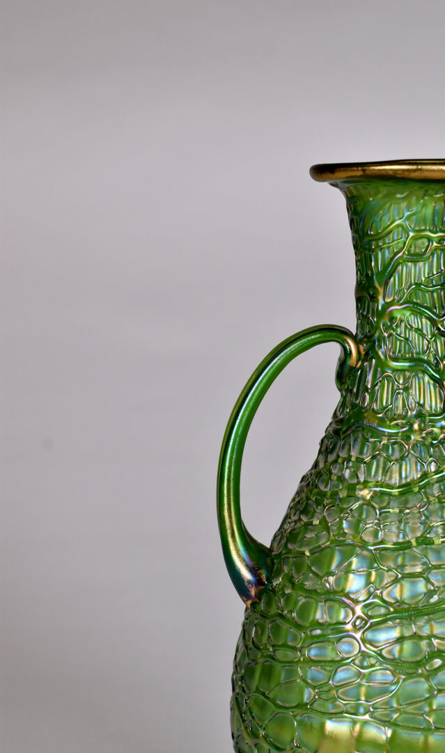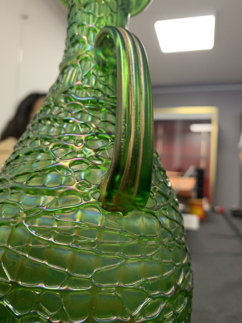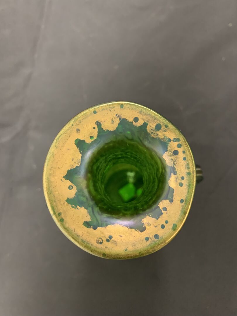 Vase balustre à anses en verre vert à reflets irisés (usures à la dorure, égrenure au col et égrenures au niveau des anses). Dans le goût de Loetz. Haut. : 28 cm.