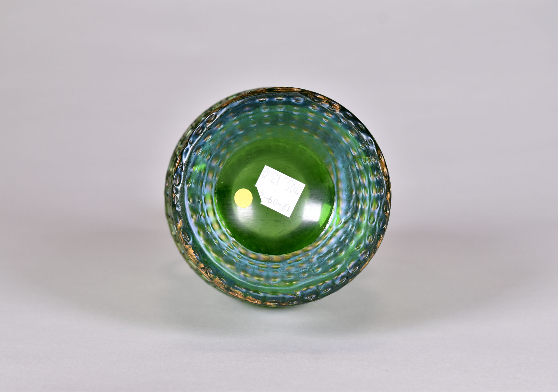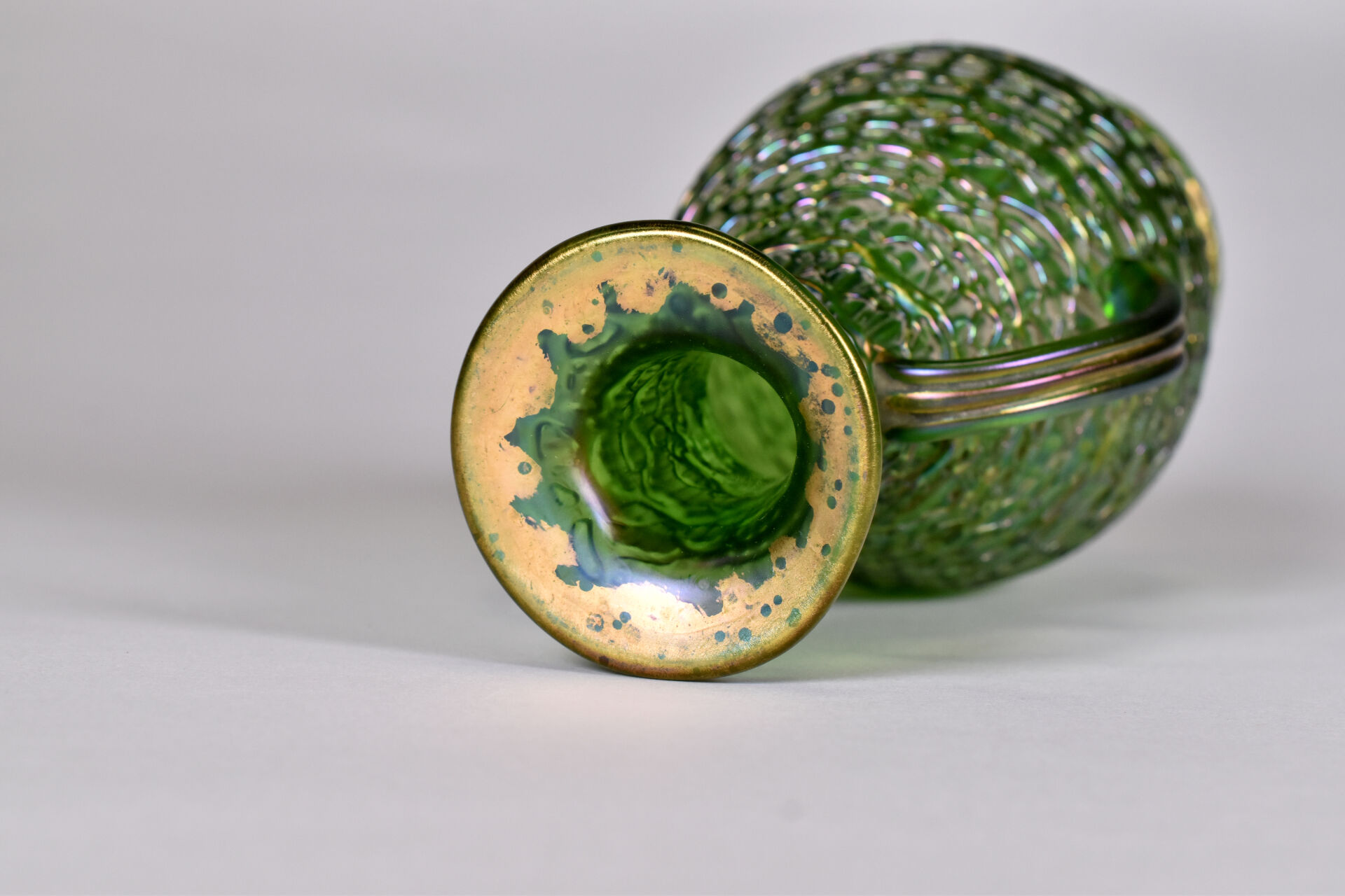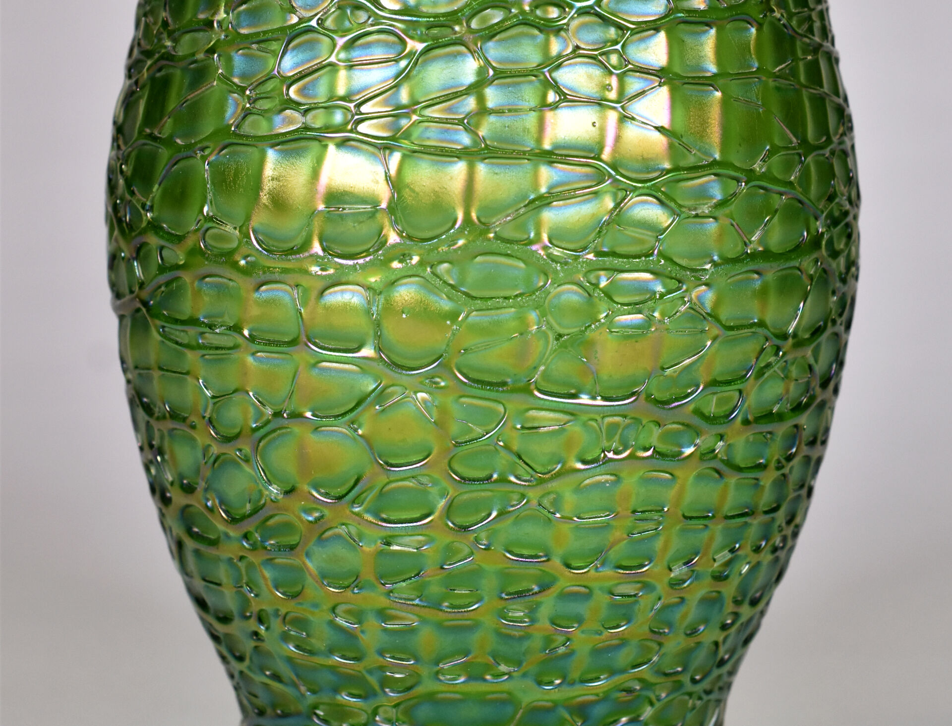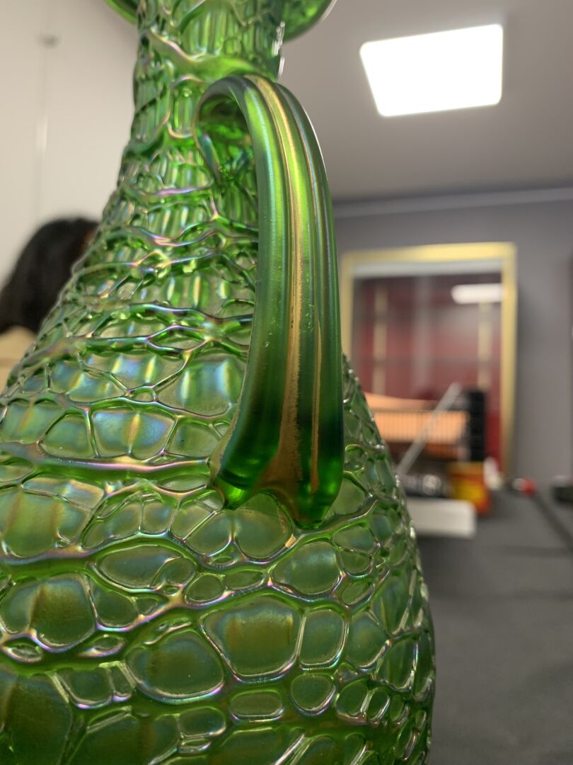 Vase balustre à anses en verre vert à reflets irisés (usures à la dorure, égrenure au col et égrenures au niveau des anses). Dans le goût de Loetz. Haut. : 28 cm.