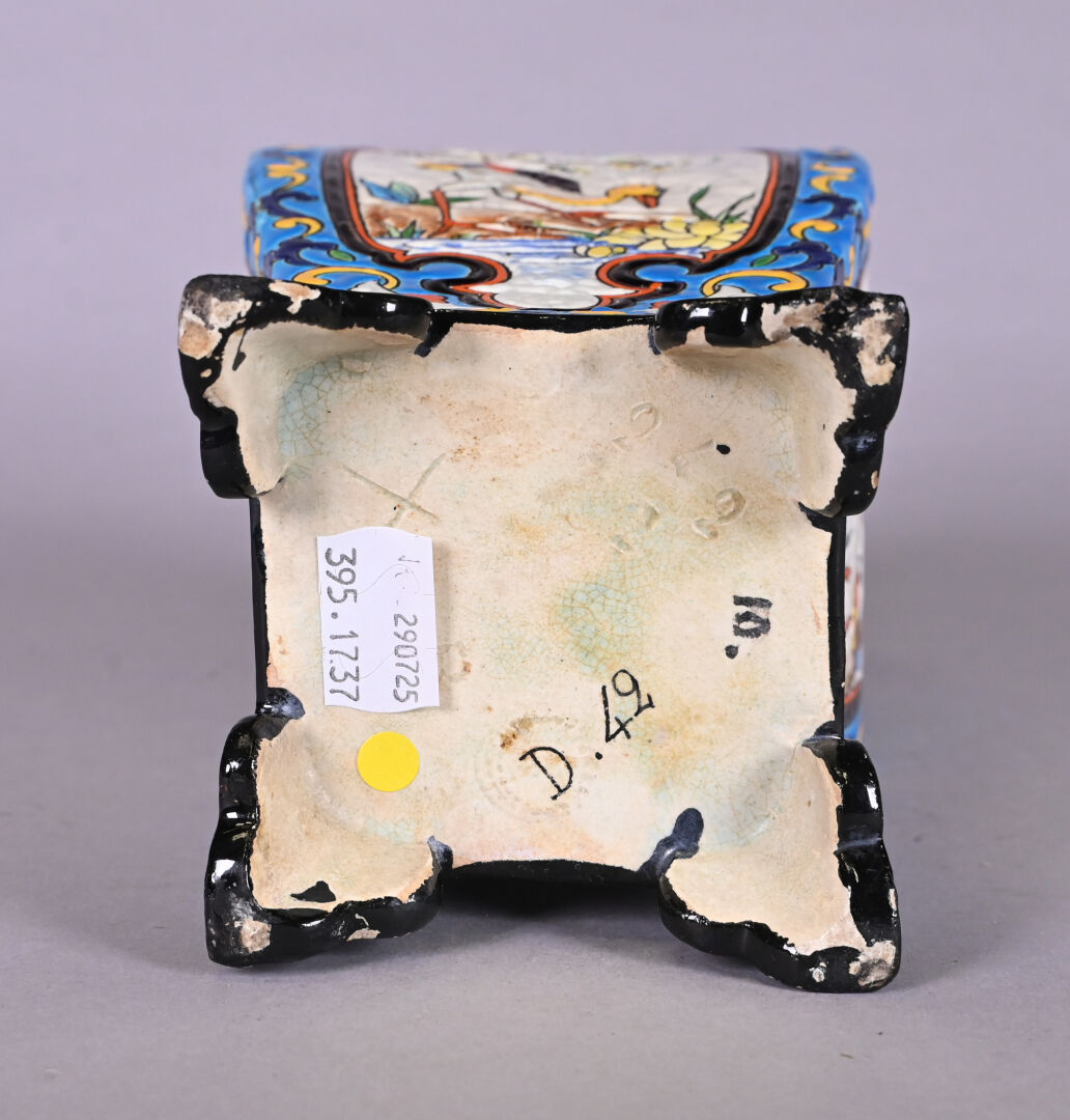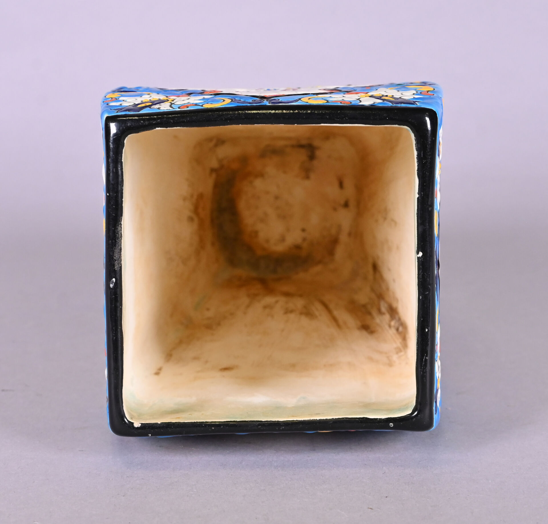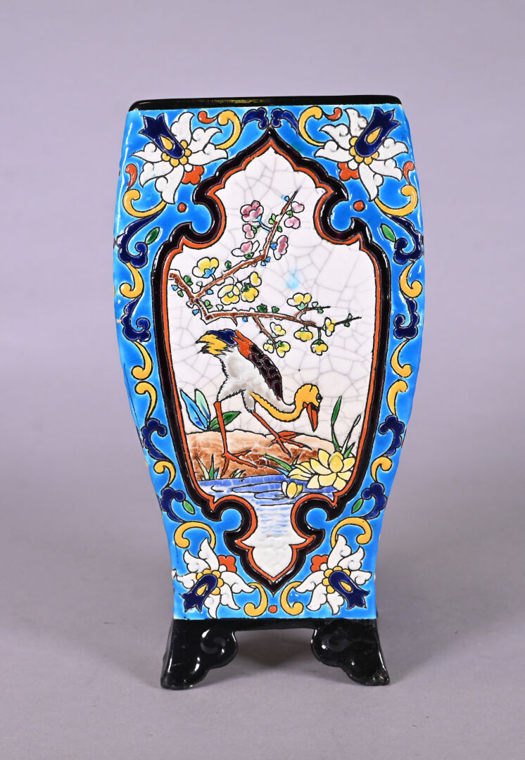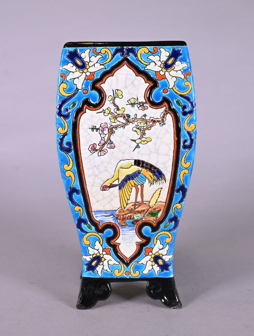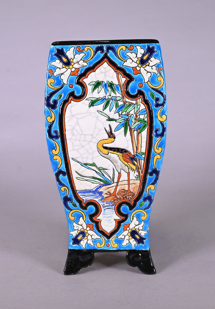 Vase balustre à col carré et cotes pincées en faïence émaillée d’oiseaux dans des cartouches, les bordures à fleurs sur fond turquoise. Le piètement en noir d’inspiration extrême orient. dans le goût de la manufacture de Bordeaux. Haut. : 22,5 cm.