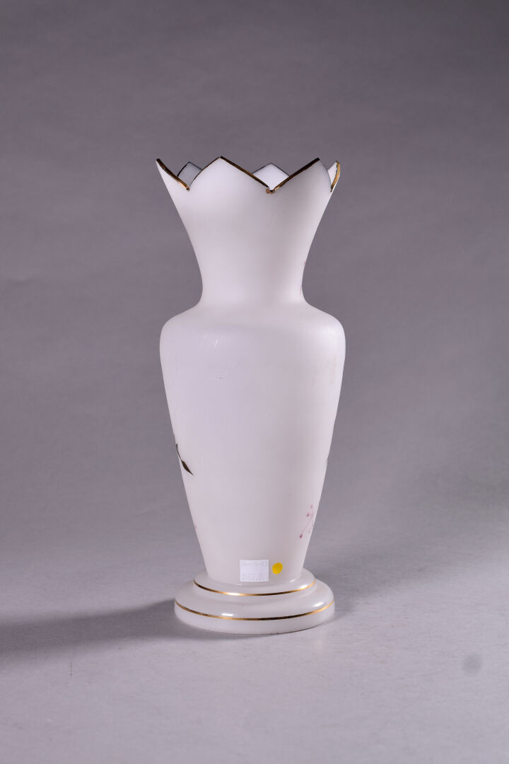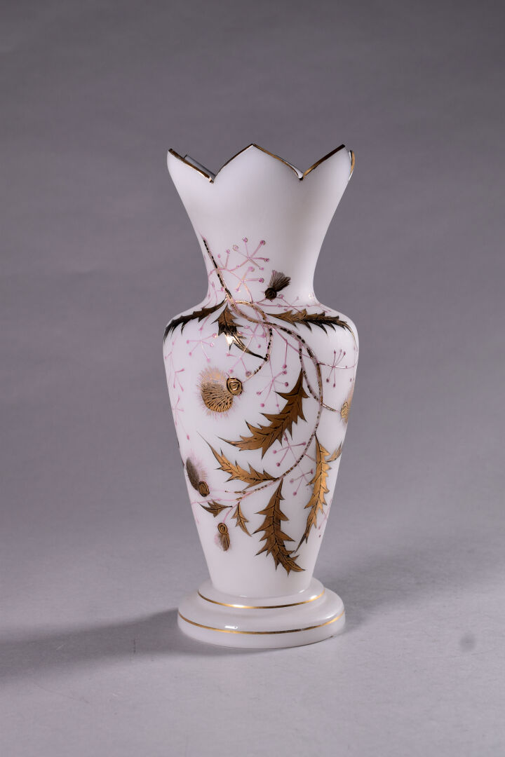 Vase balustre à col découpé en opaline à décor émaillé de chardons en dorure et rose. Haut. : 32 cm.