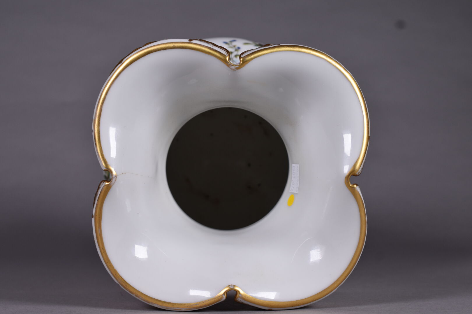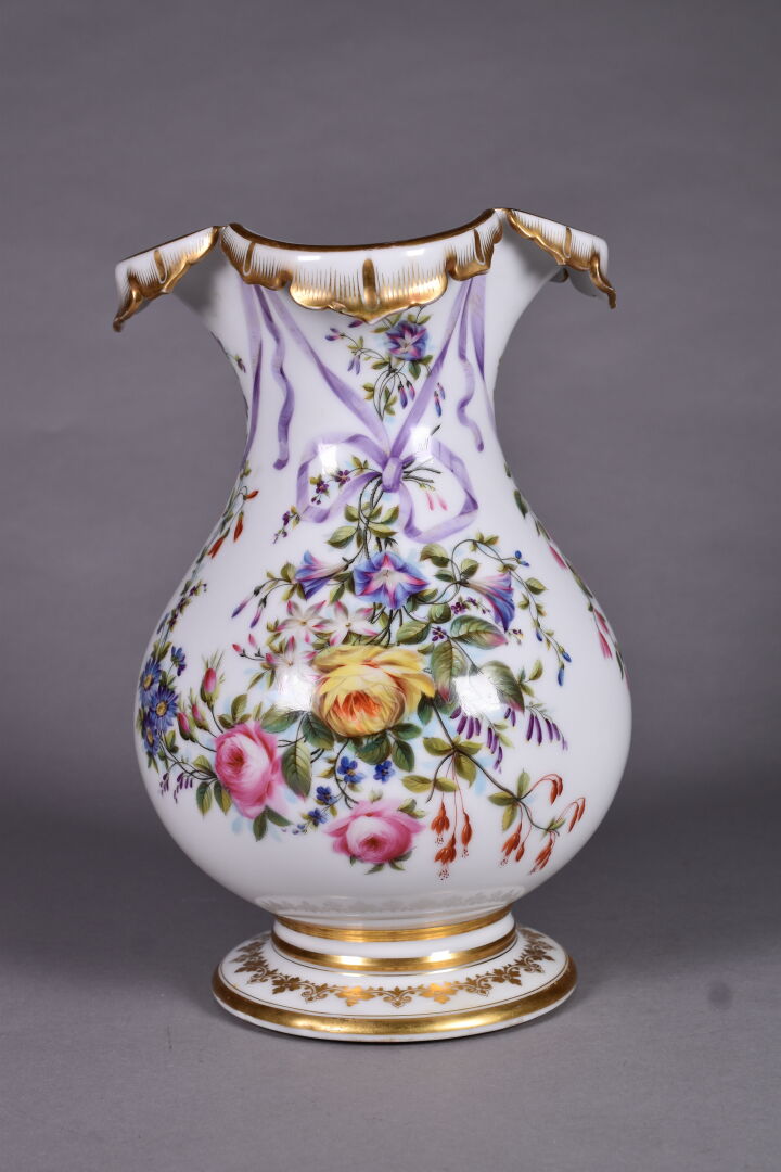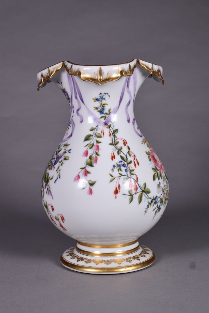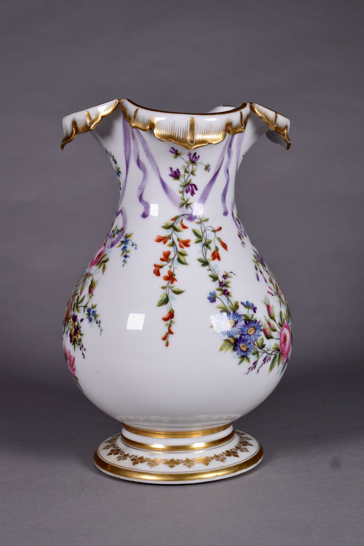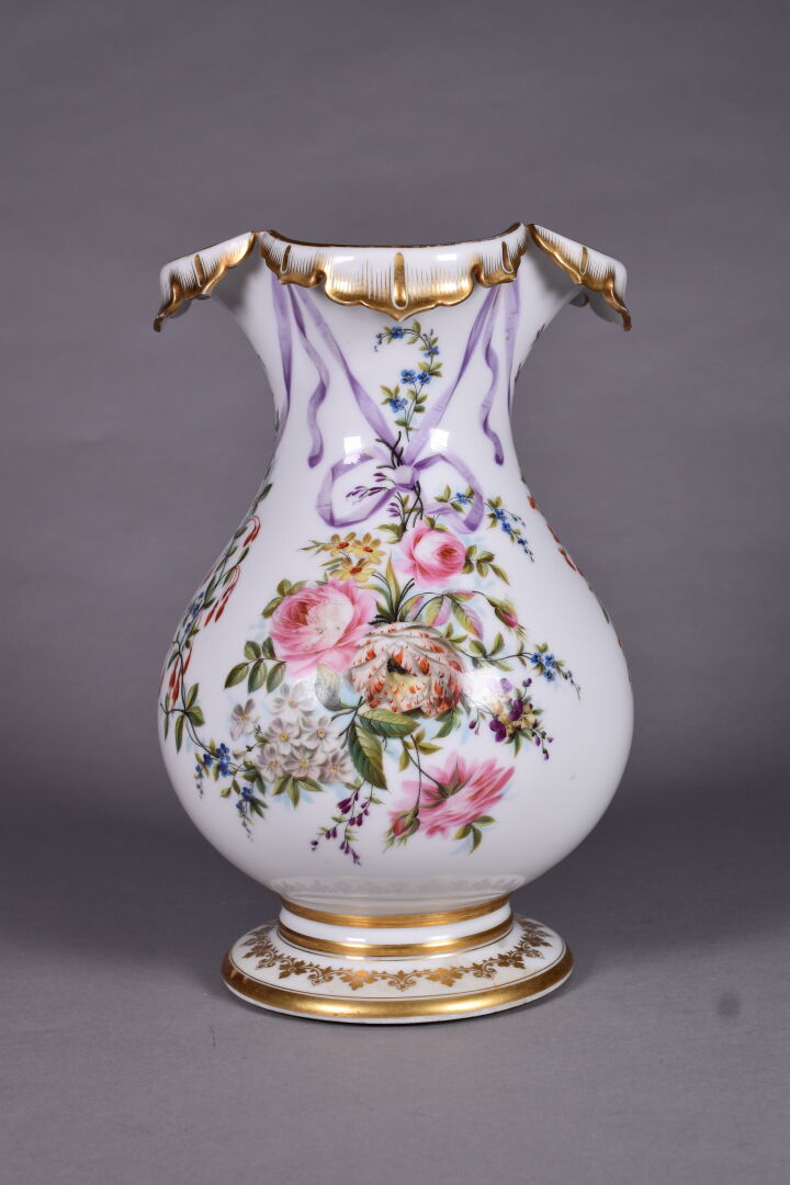Vase balustre à col drapé en porcelaine à décor en polychromie de fleurs et rubans mauves (un fèle). Haut. : 33 cm.