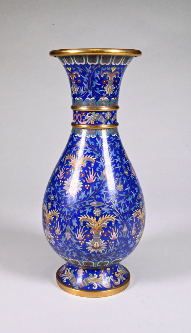 Vase balustre à décor en émaux cloisonnés de rinceaux feuillagés et fleurs sur fond bleu roi. Travail dans le goût perse, début du XXe siècle. Haut. : 31 cm.