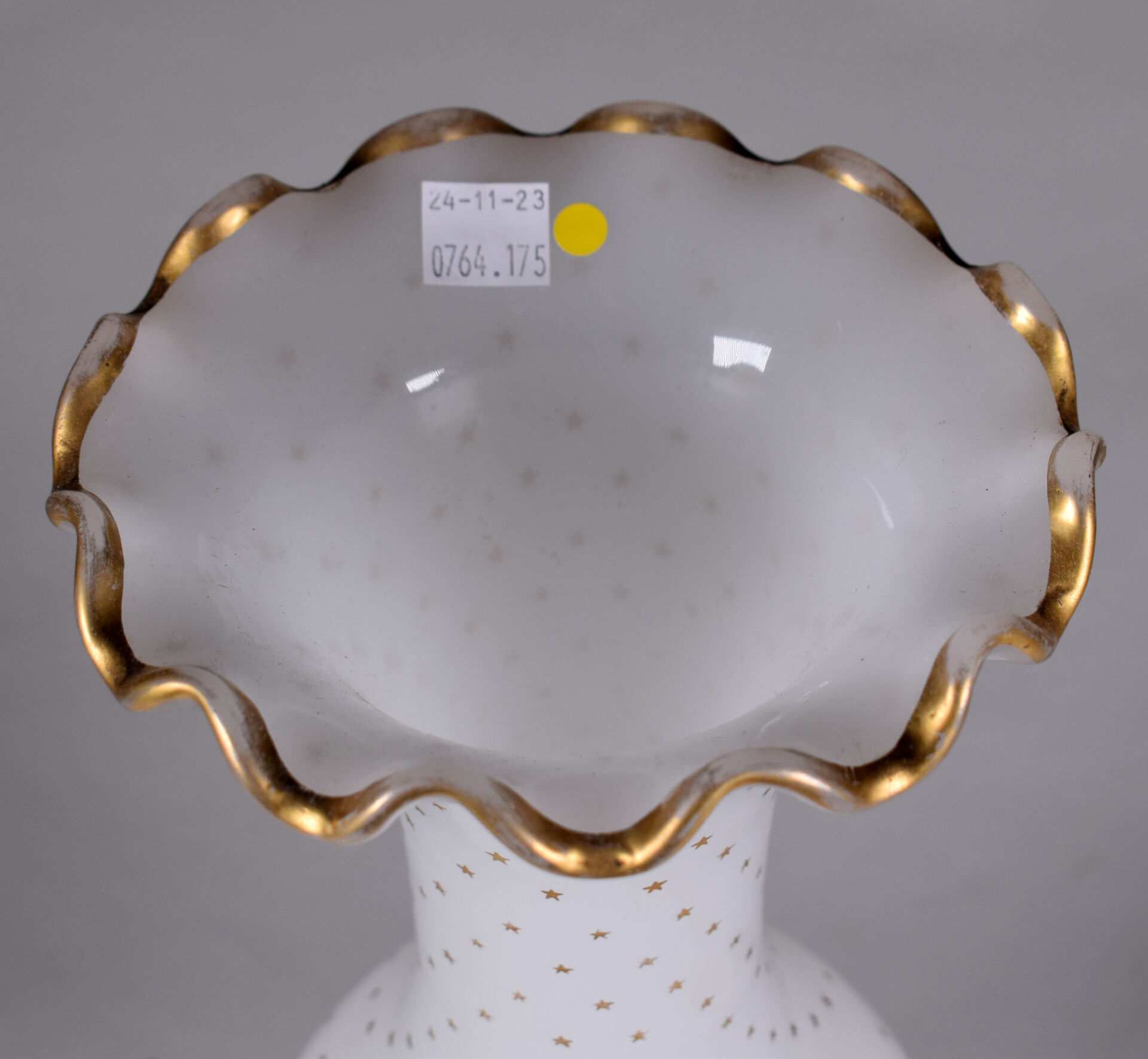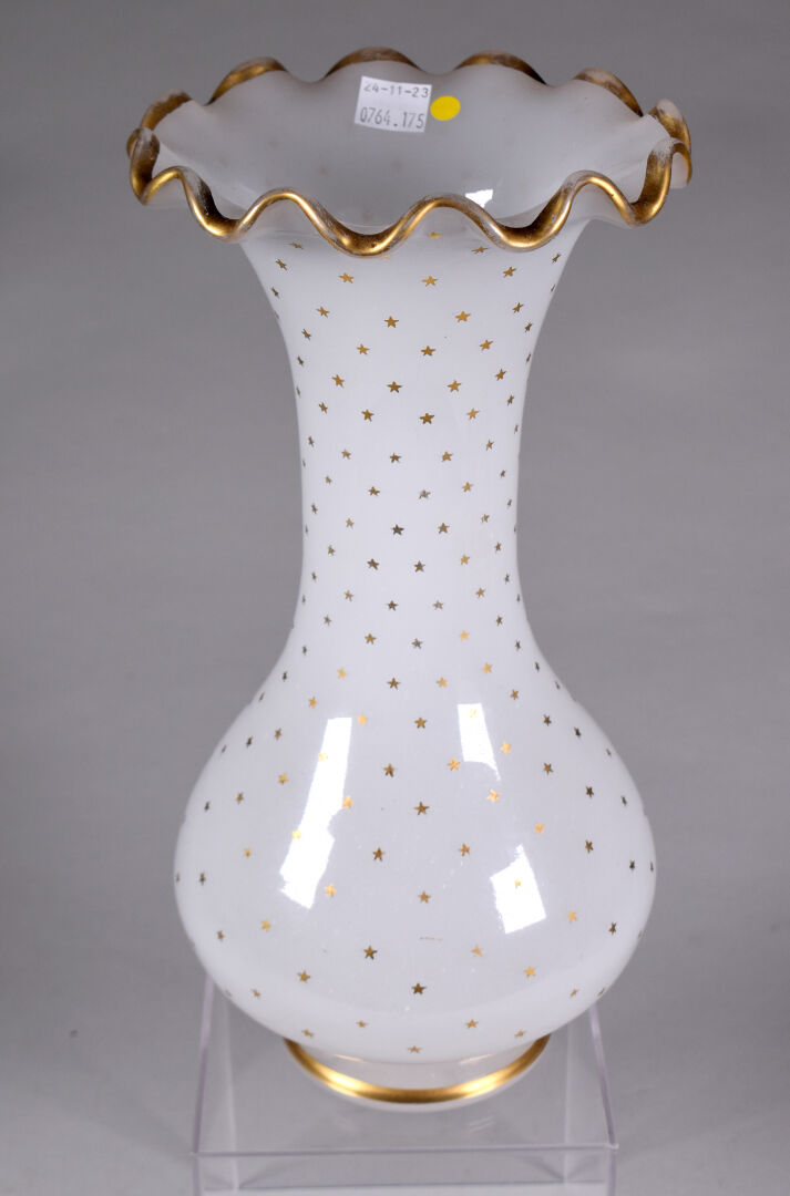 Vase balustre à haut col mouvementé en opaline blanche à décor de semi d’étoiles et liseré or. Fin du XIXe siècle. Haut. : 30 cm.