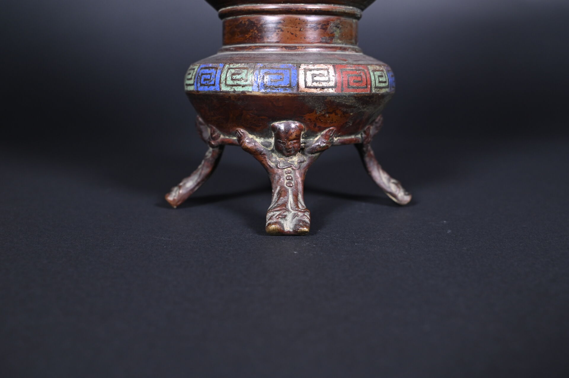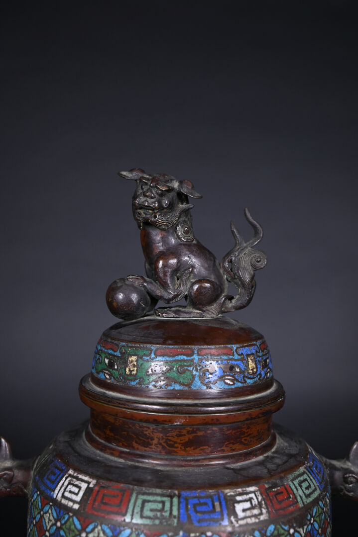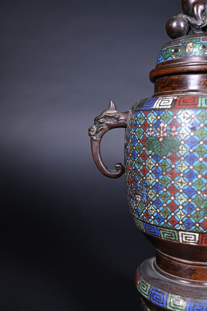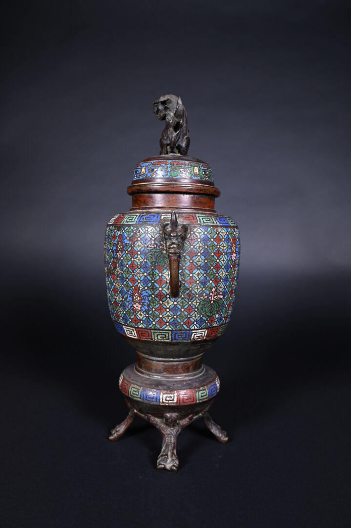 Vase balustre couvert reposant sur un socle en bronze patiné à décor en émaux champlevé, à décors polychromes géométriques et de fleurettes. Des frises grecques complètent l’ornementation. La prise du couvercle ornée d’un chien de phö, les anses à tête de dragons. Cachet au dessous. Japon, vers 1900. Haut. : 47 cm.
