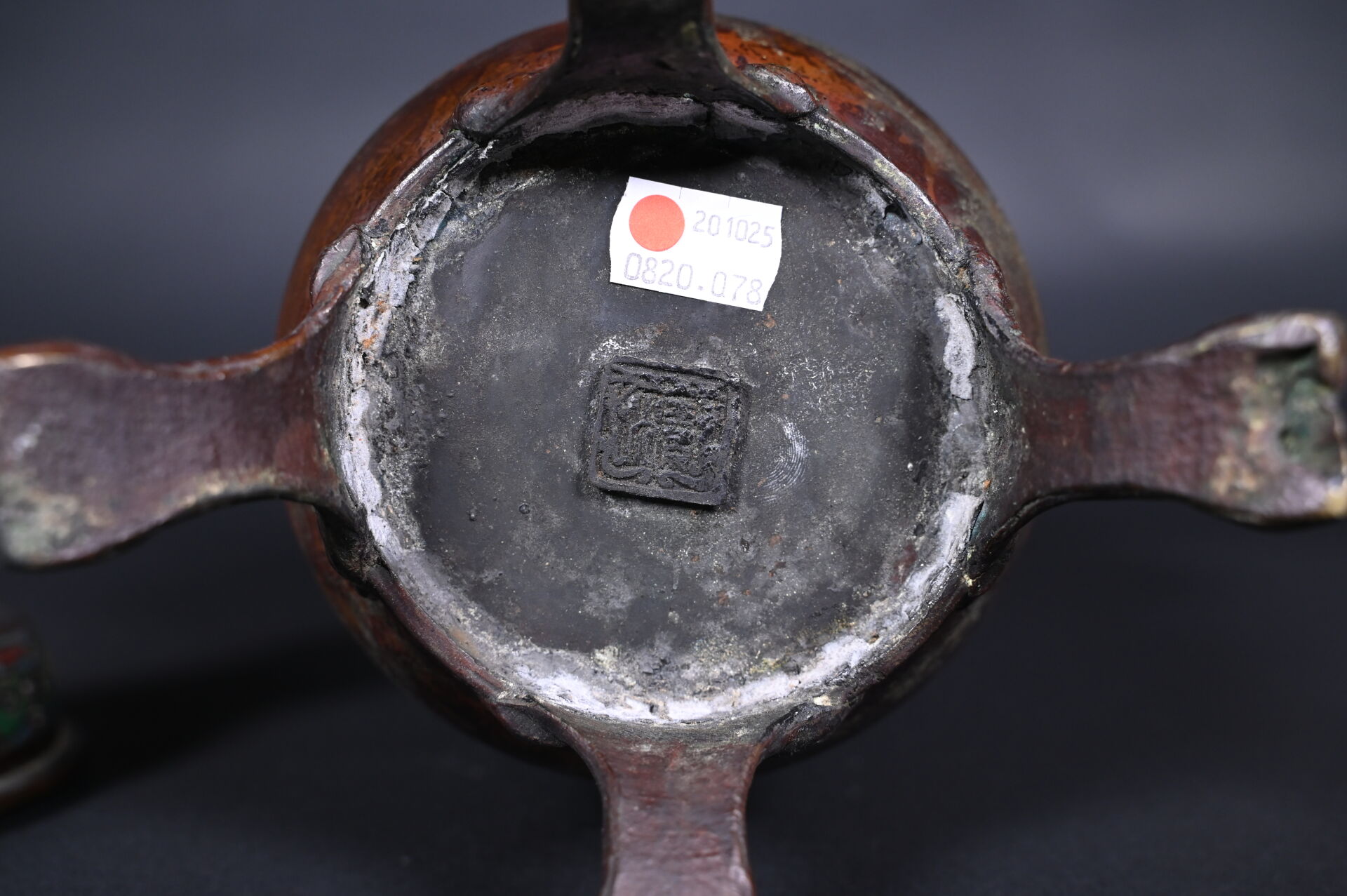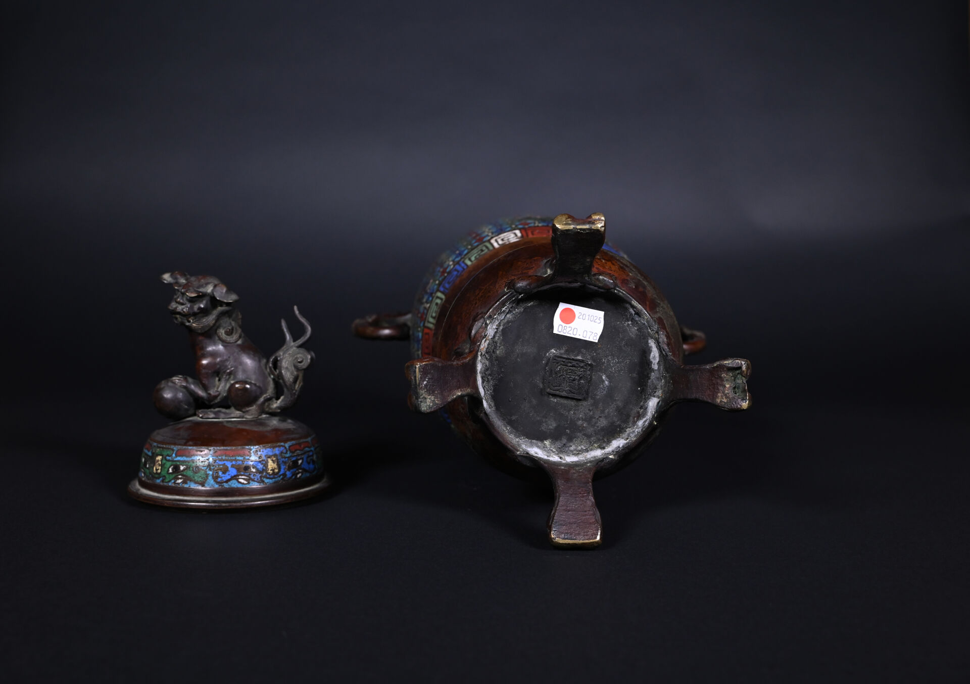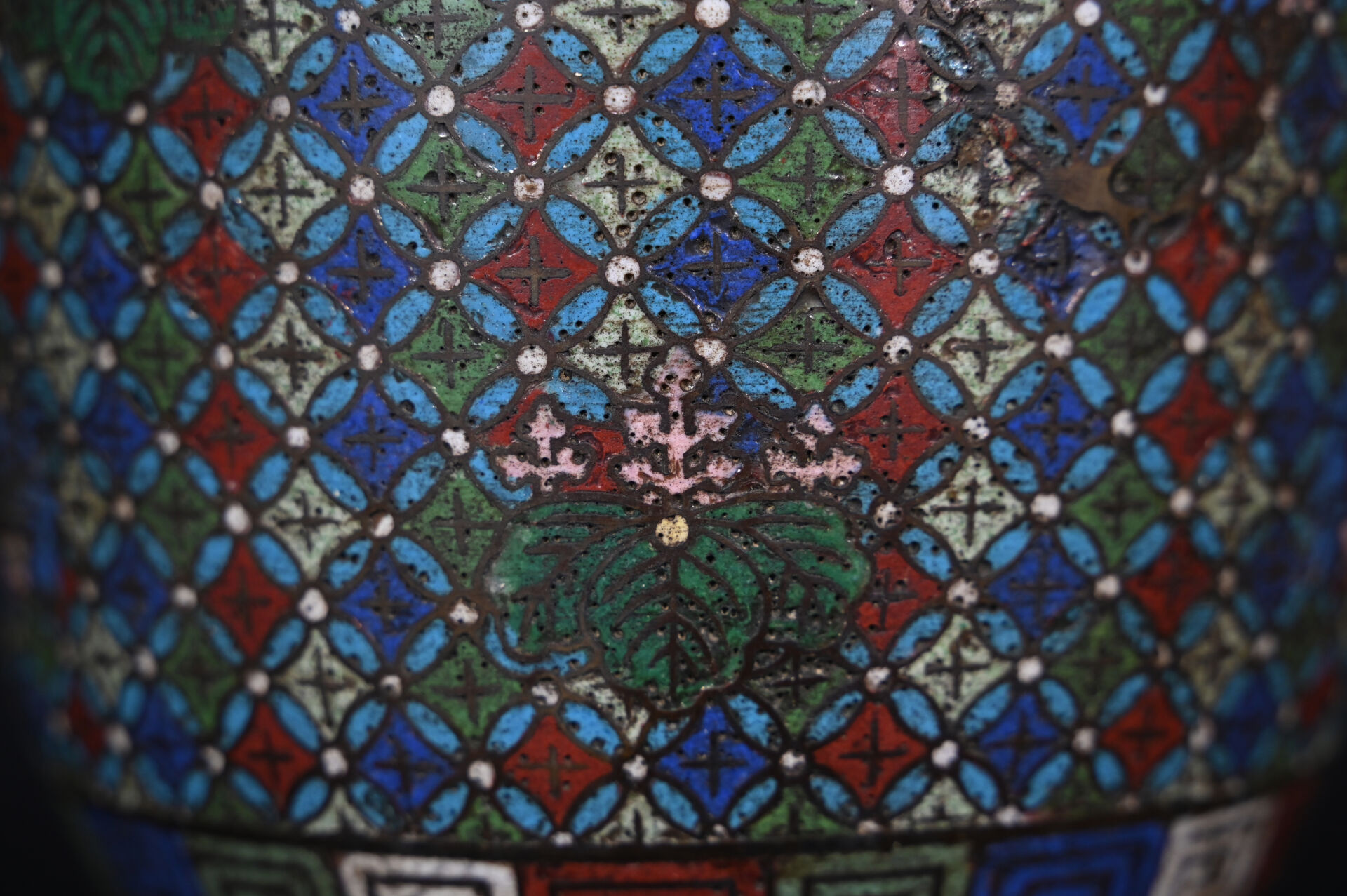 Vase balustre couvert reposant sur un socle en bronze patiné à décor en émaux champlevé, à décors polychromes géométriques et de fleurettes. Des frises grecques complètent l’ornementation. La prise du couvercle ornée d’un chien de phö, les anses à tête de dragons. Cachet au dessous. Japon, vers 1900. Haut. : 47 cm.