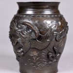 Vase balustre en bronze patiné brun à décor en relief d’oiseaux et branchages (usures à la patine, quelques rayures). Probablement Japon, fin du XIXe ou début du XXe siècle. Haut. : 14,5 cm.