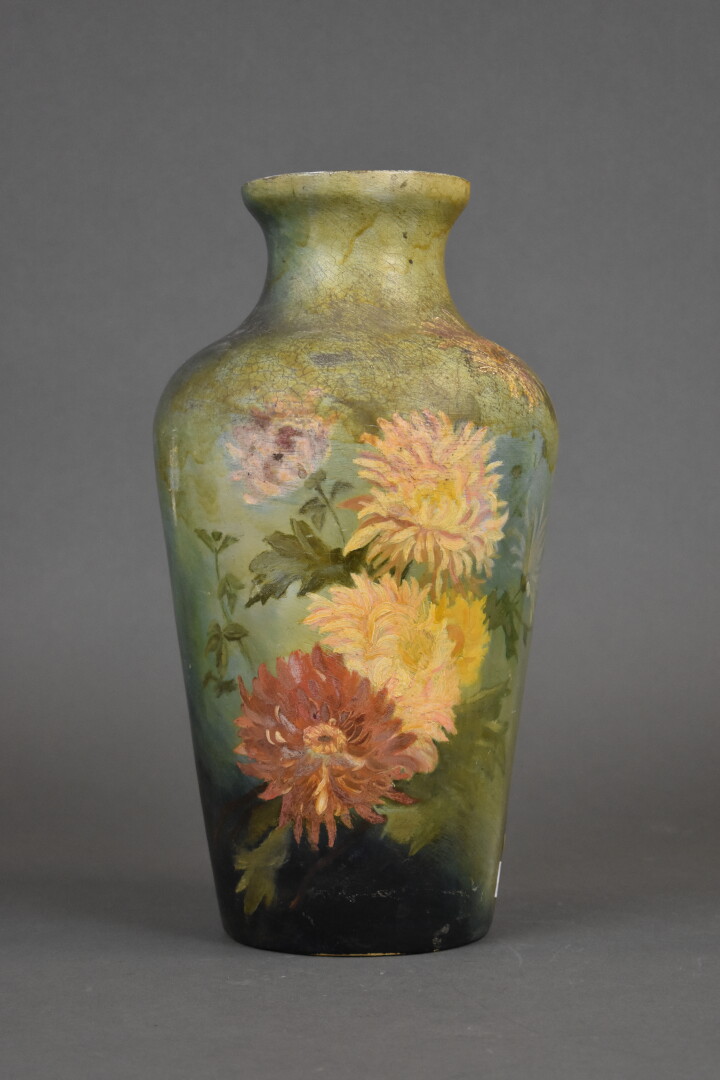 Vase balustre en céramique peinte de fleurs de chrysanthèmes en polychromie sur fond bleu. Vers 1900. Haut. : 35 cm.