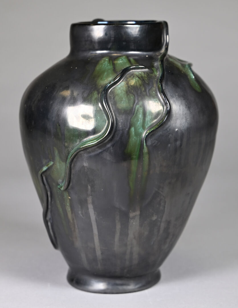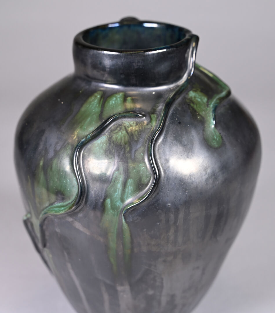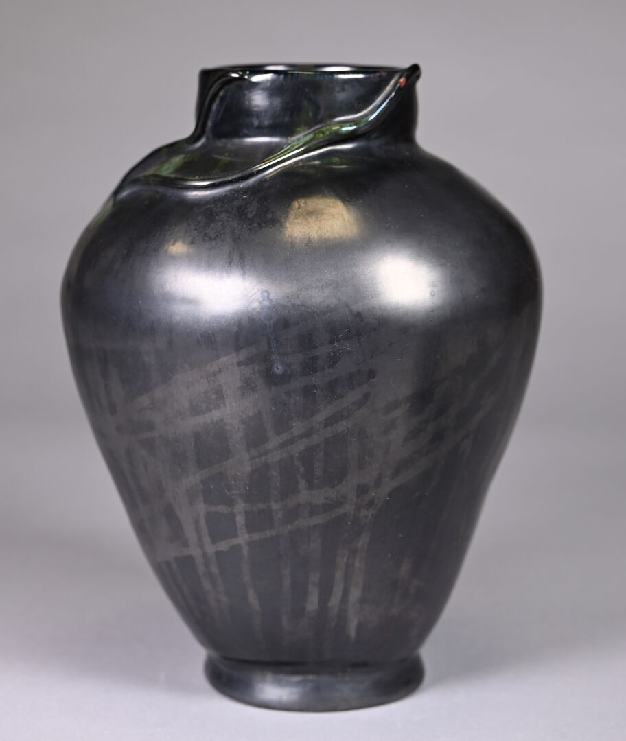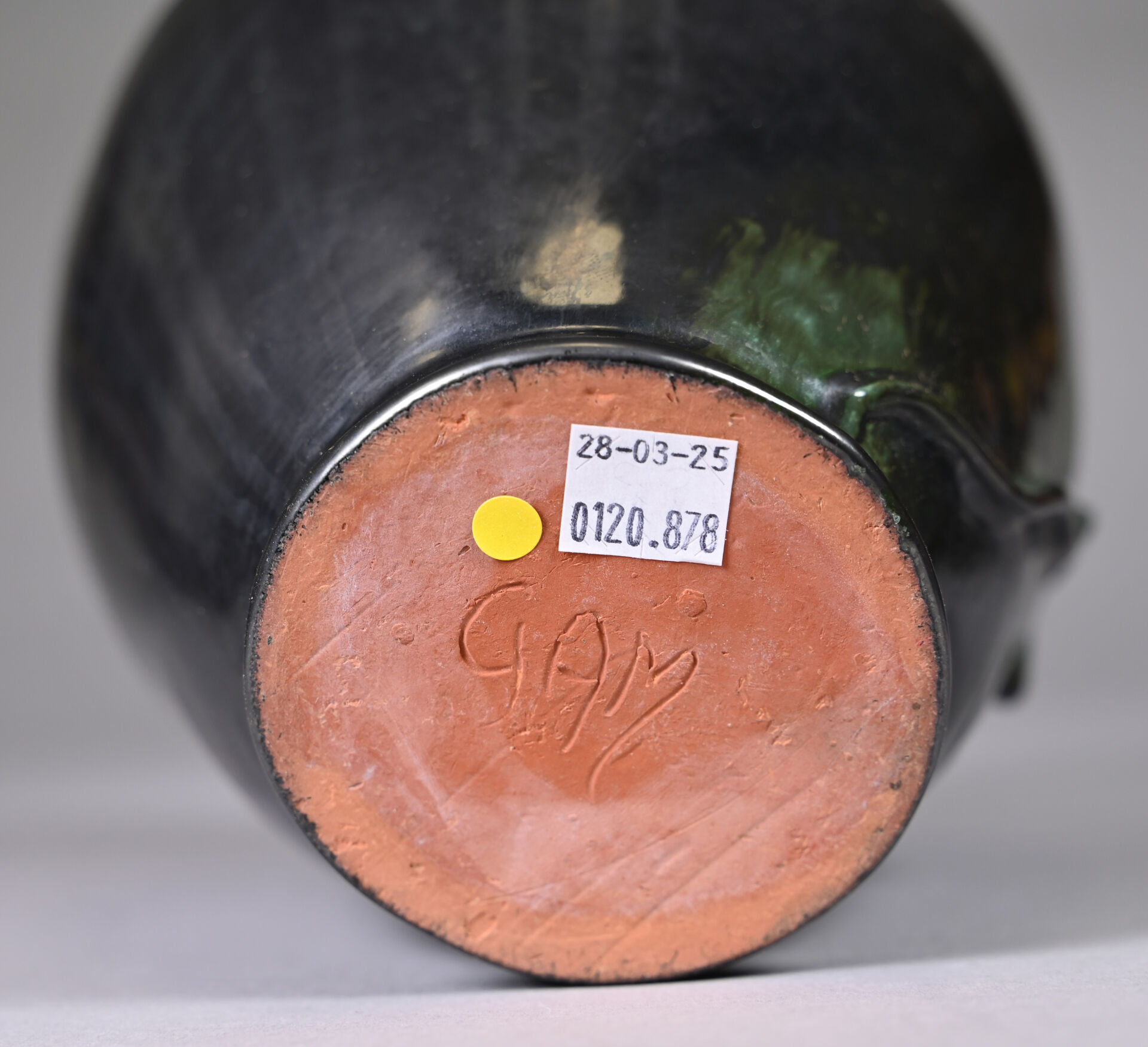 Vase balustre en terre cuite émaillée noir et vert irisés (petit éclat au col). Marqué au dessous GAM. Haut. : 24,5 cm.