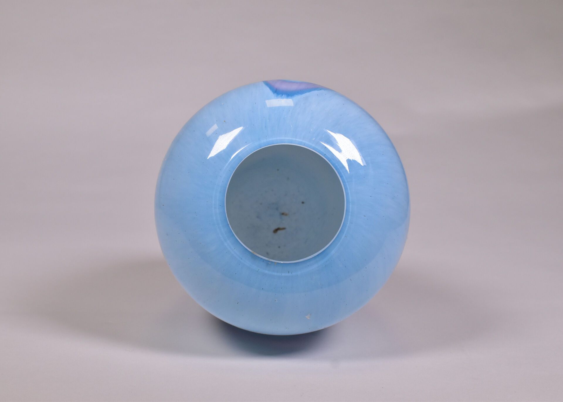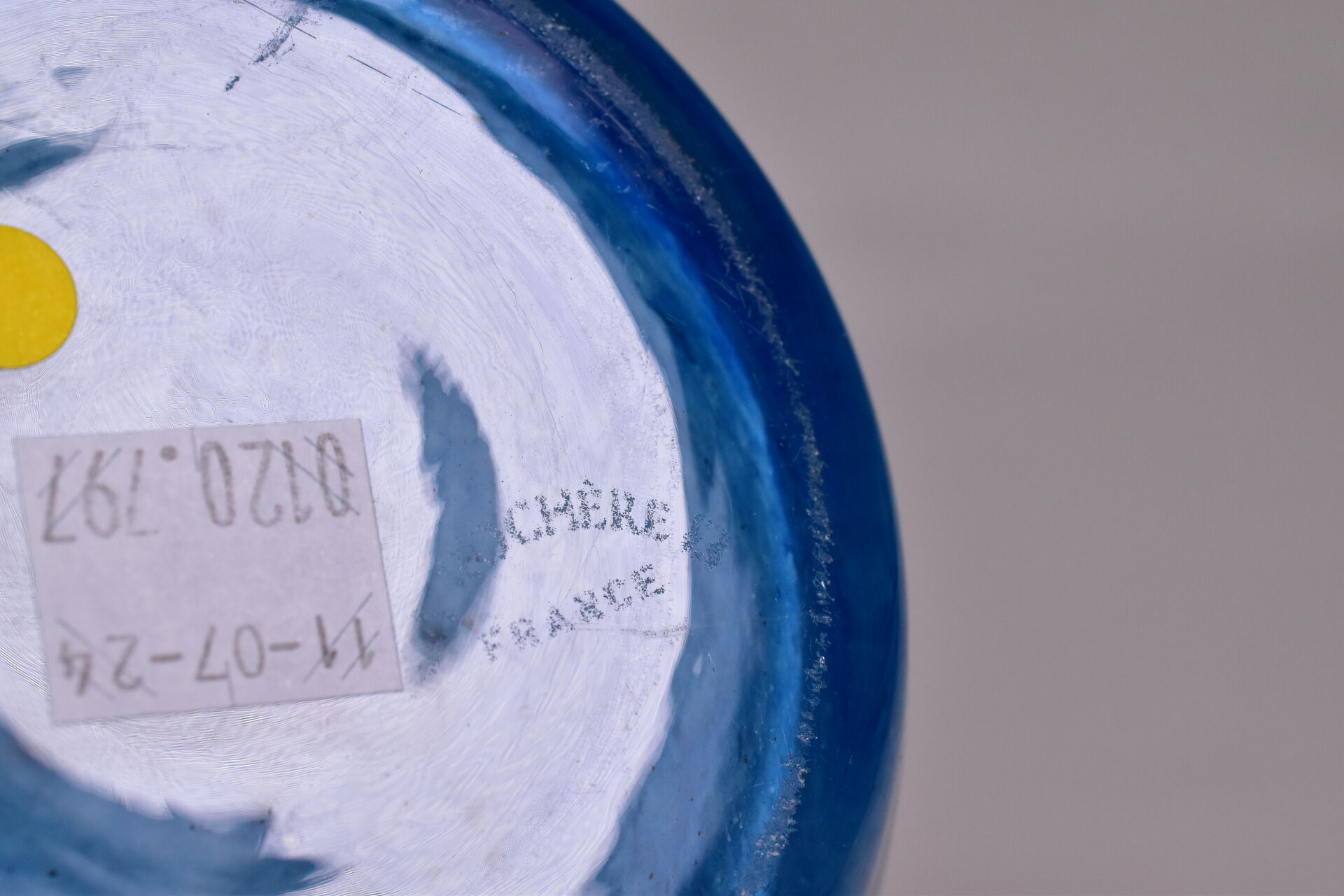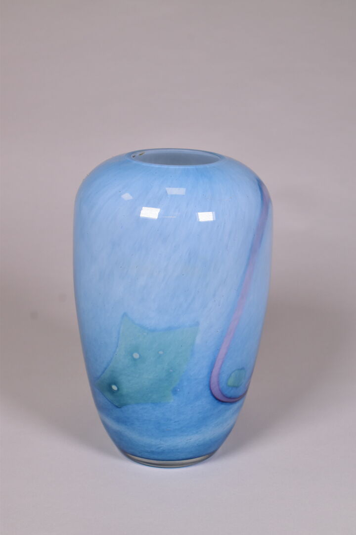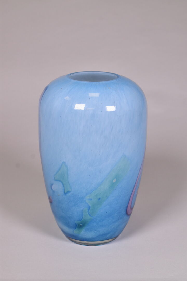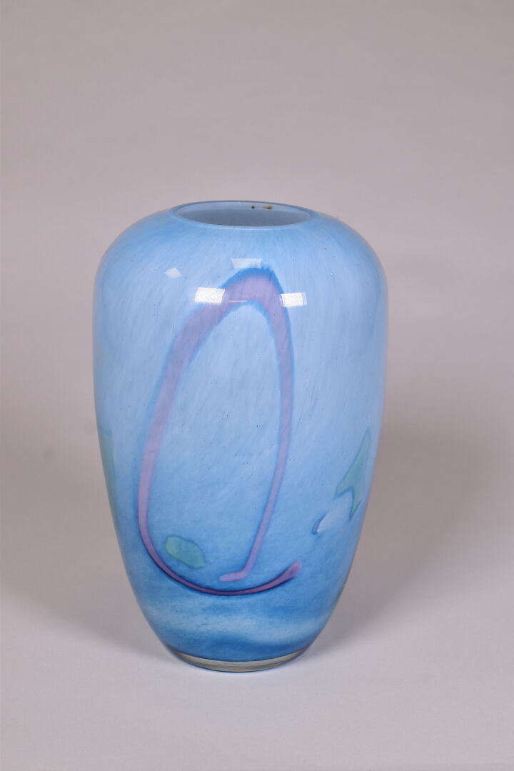 Vase balustre en verre multicouche bleu à rubans rose et verts. LA ROCHERE Marqué. Haut. : 26 cm.