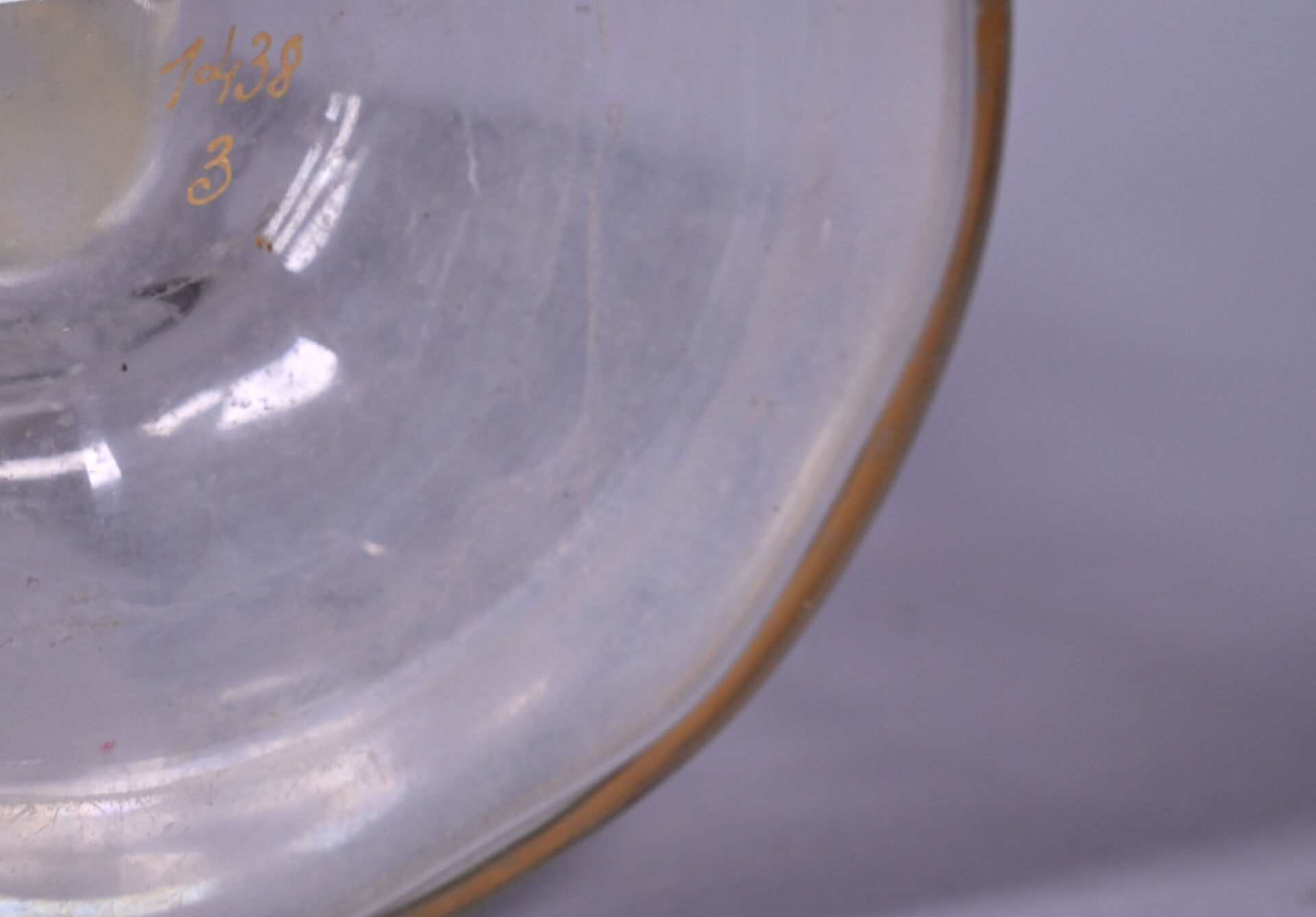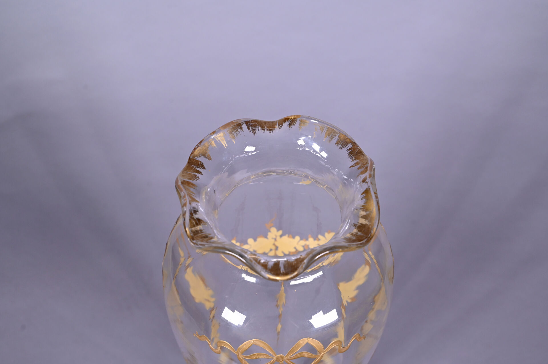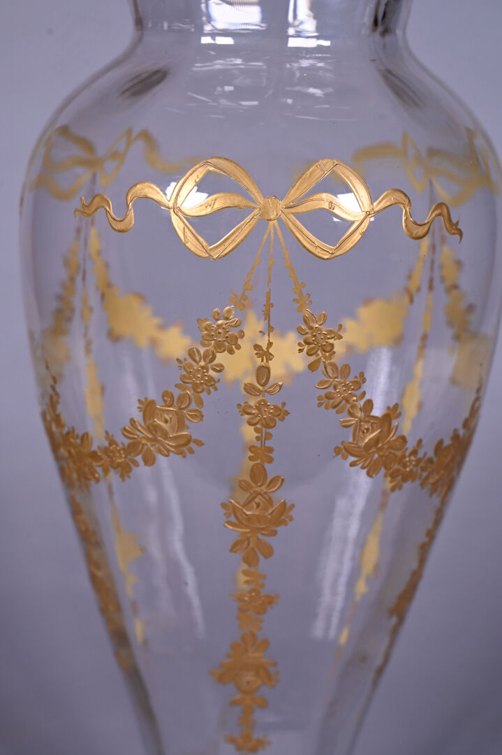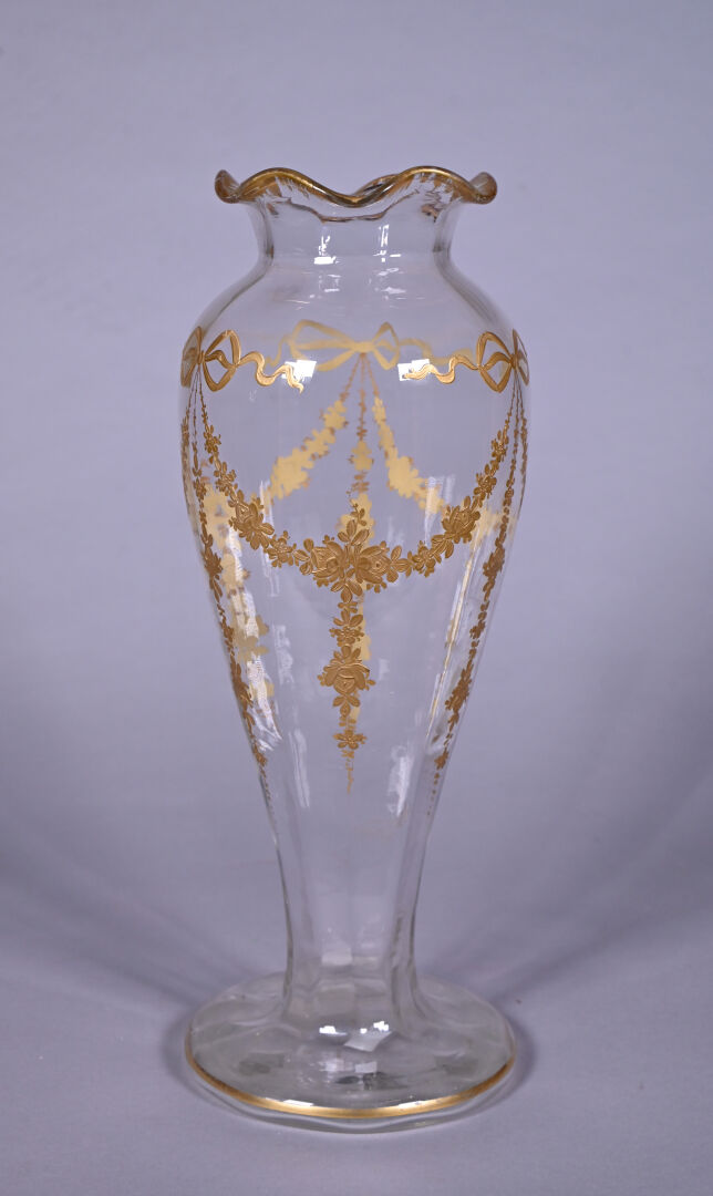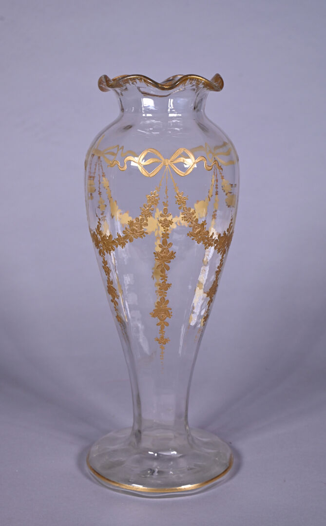 Vase balustre sur piédouche en verre à décor en dorure de guirlandes de fleurs nouées et liseré or. Haut. : 40 cm.