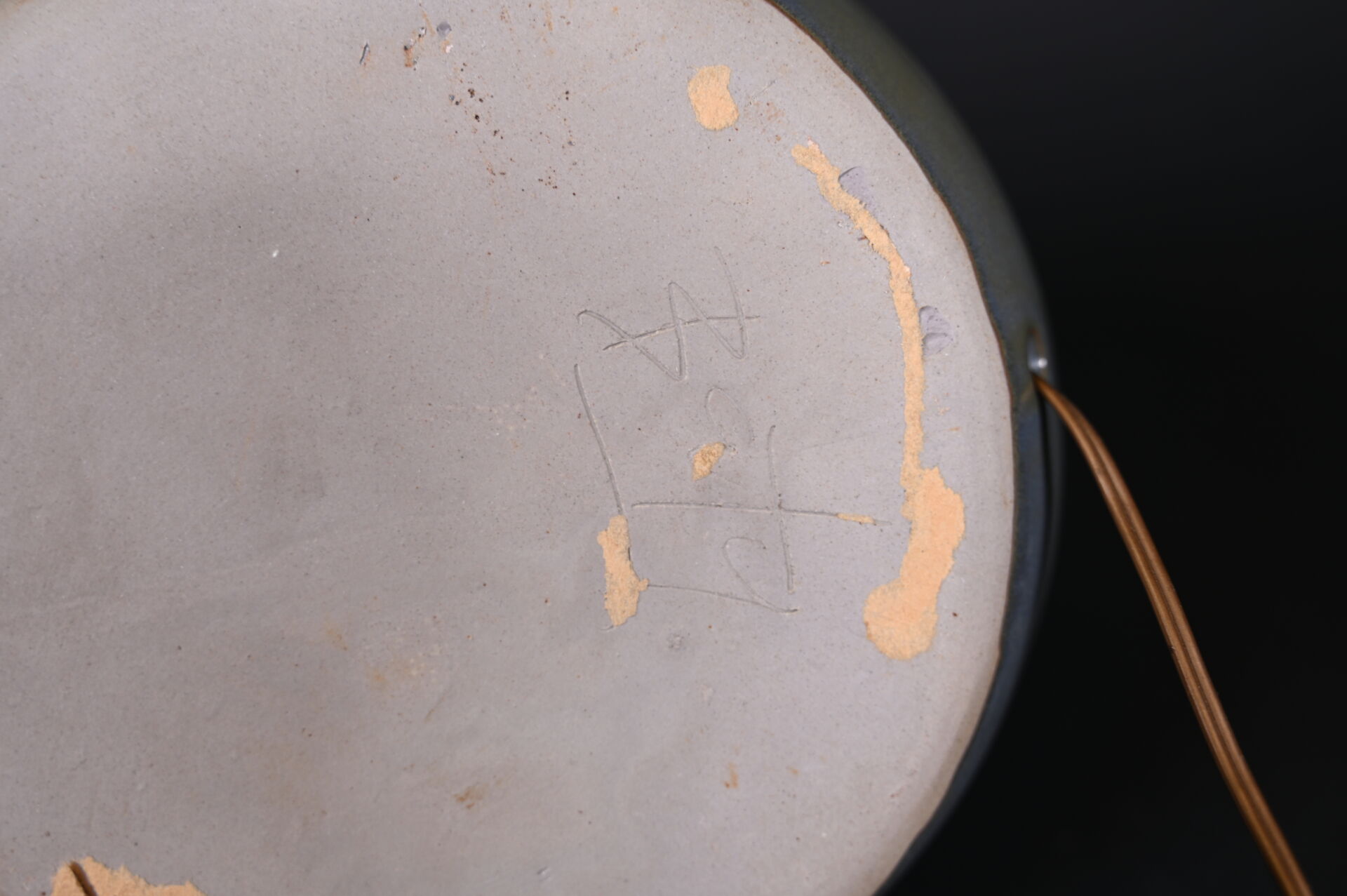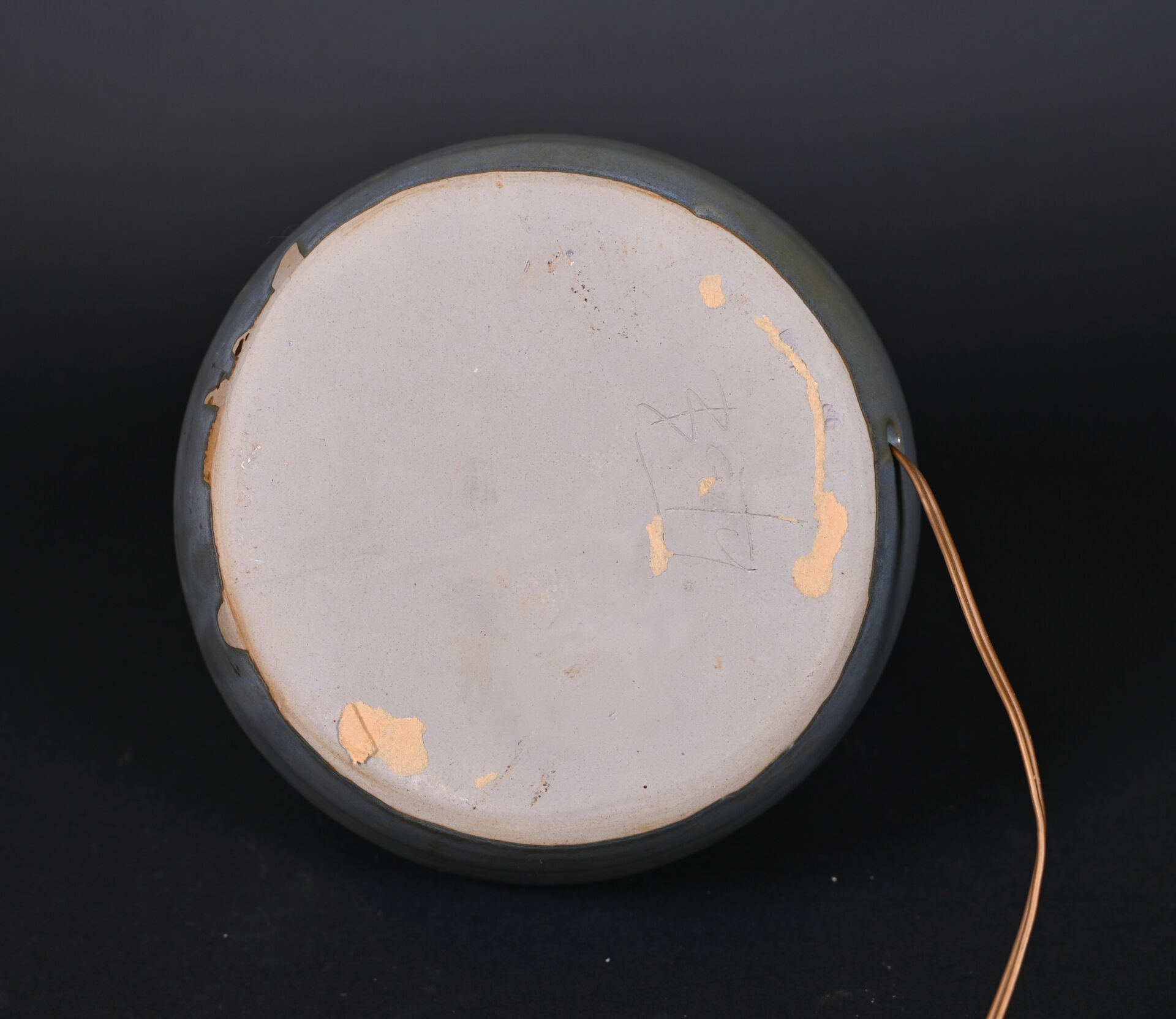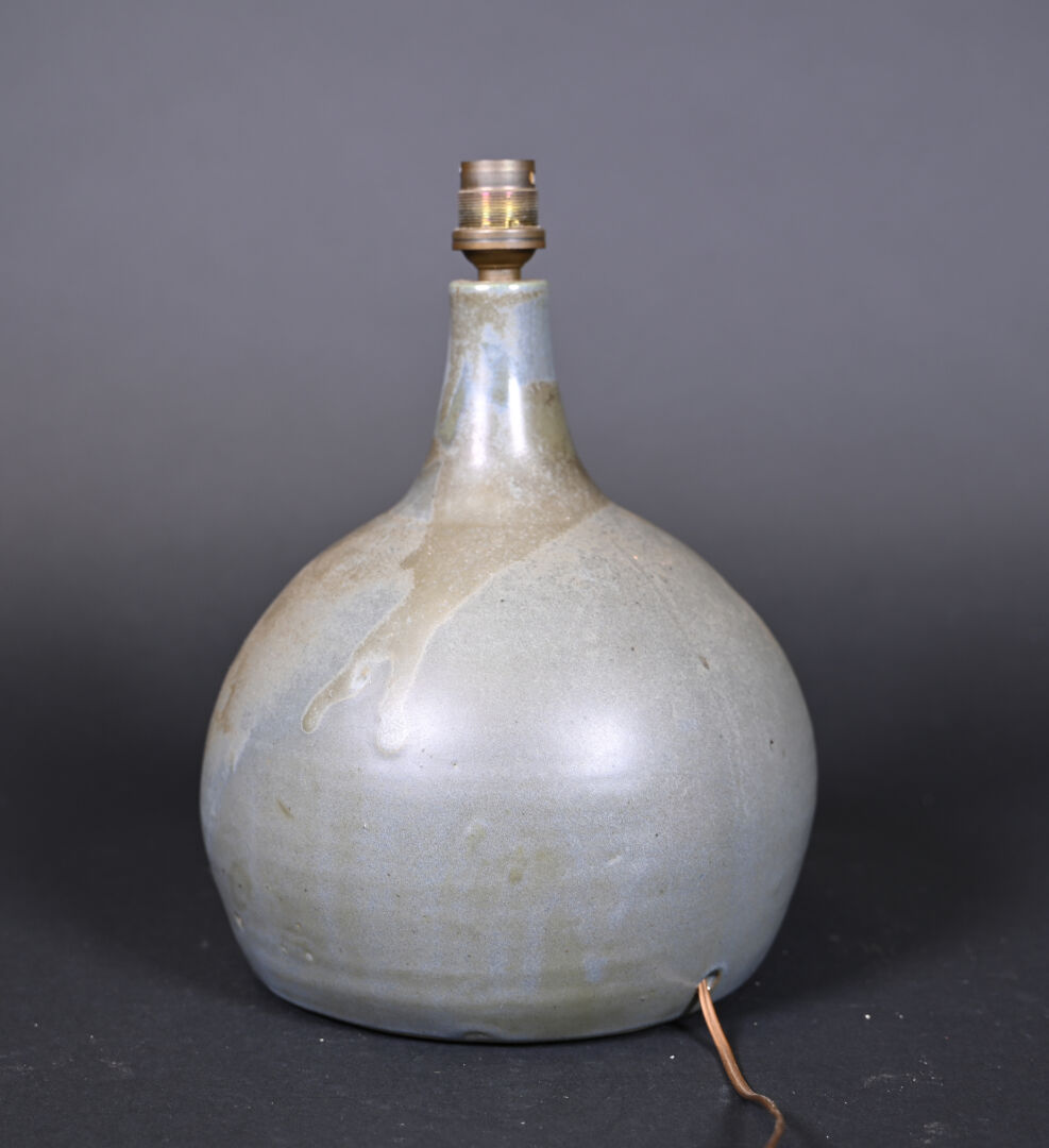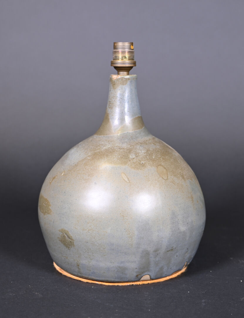Vase boule à haut col en grès émaillé bleu gris. Monté en lampe. Signé BATY ? au dessous. Haut. sans abat-jour : 28 cm.