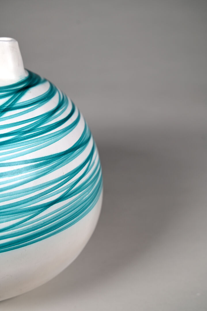 Vase boule à trois cols en terre cuite émaillée crème à rayures turquoise. Milieu du XXe siècle. Haut. : 28 cm.