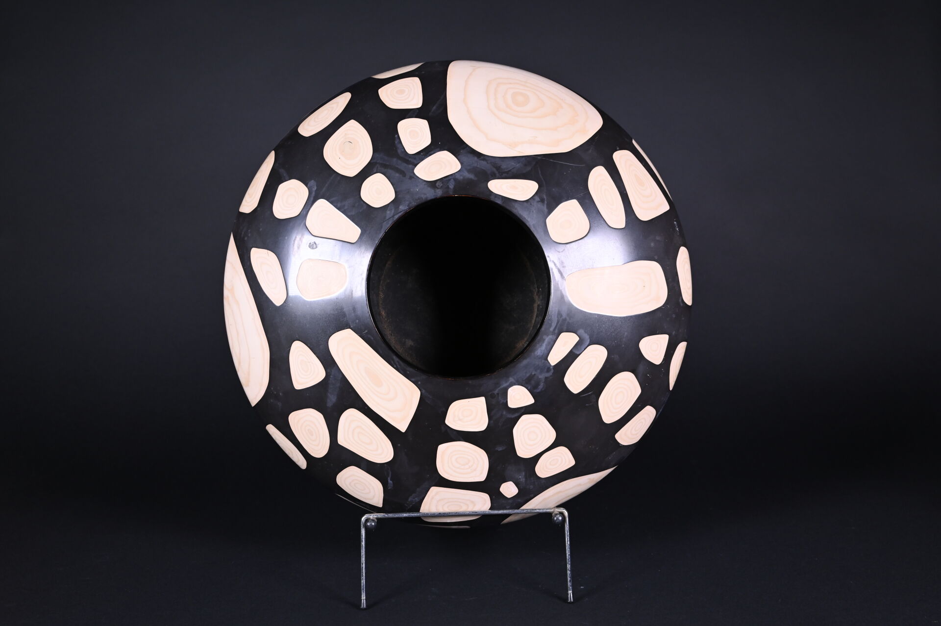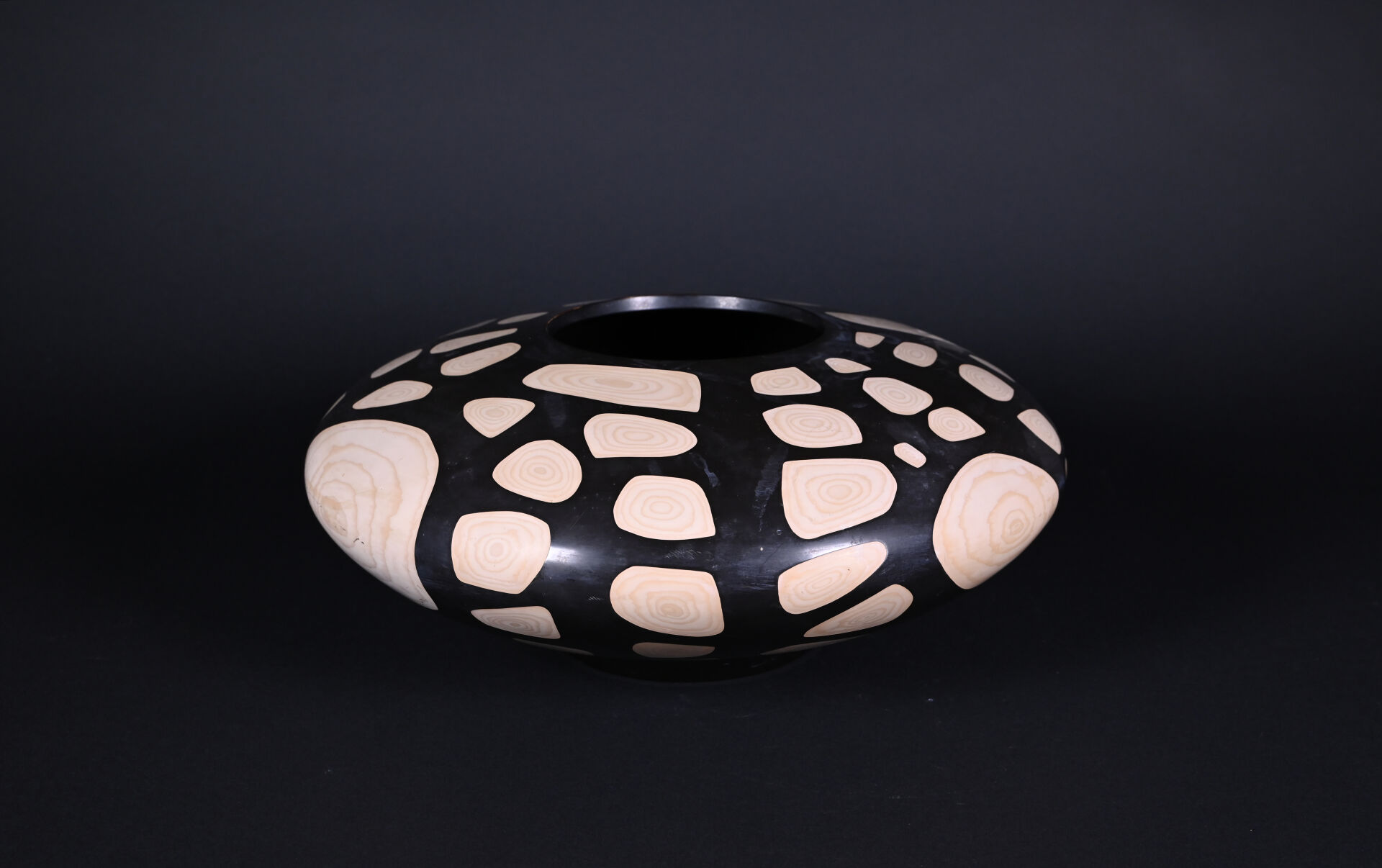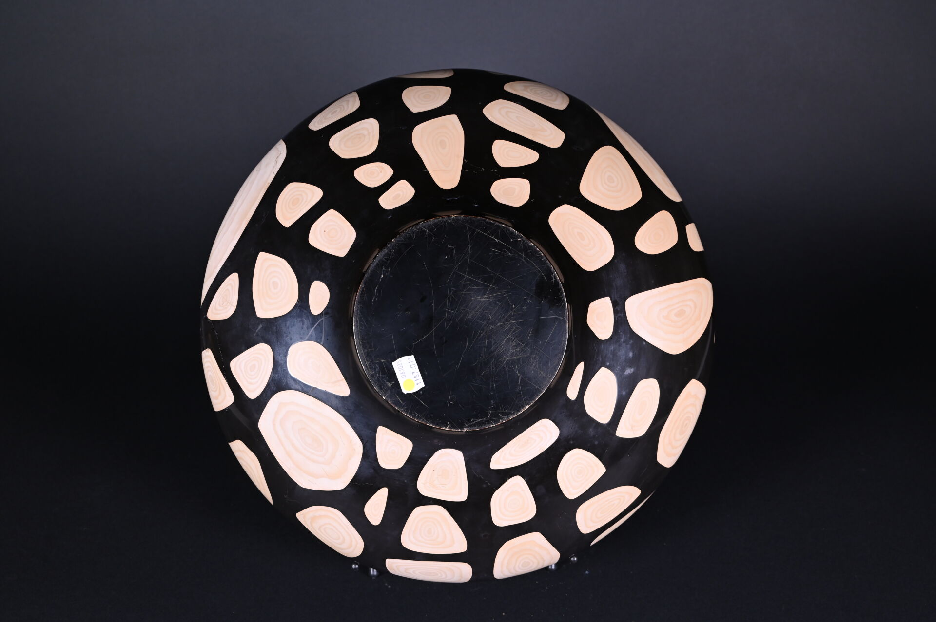 Vase boule aplatie en matériaux composite partiellement laqué noir à décor à l’imitation du bois (usures et frotements). Seconde moitié du XXe siècle. Haut. : 17,5 cm – Diam. : 43 cm.