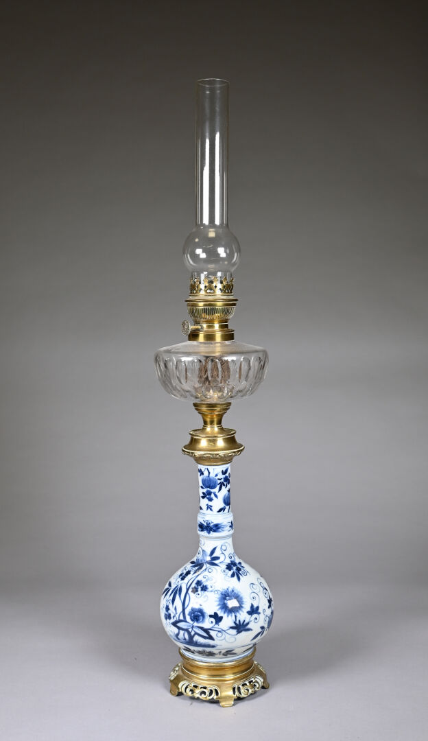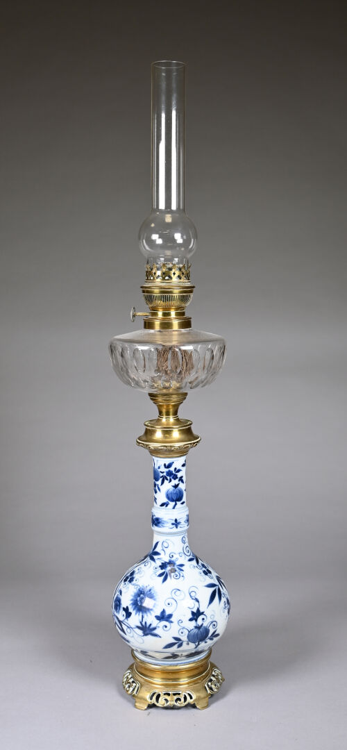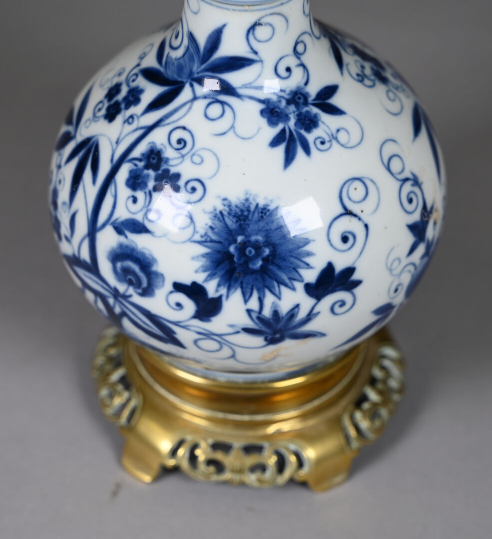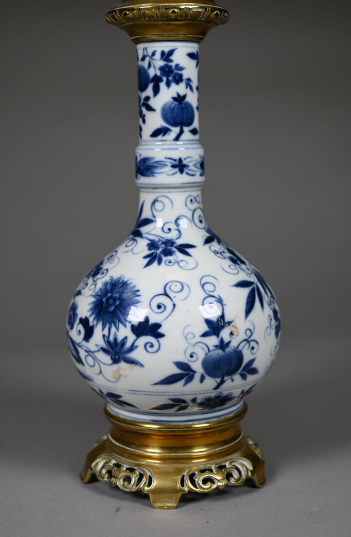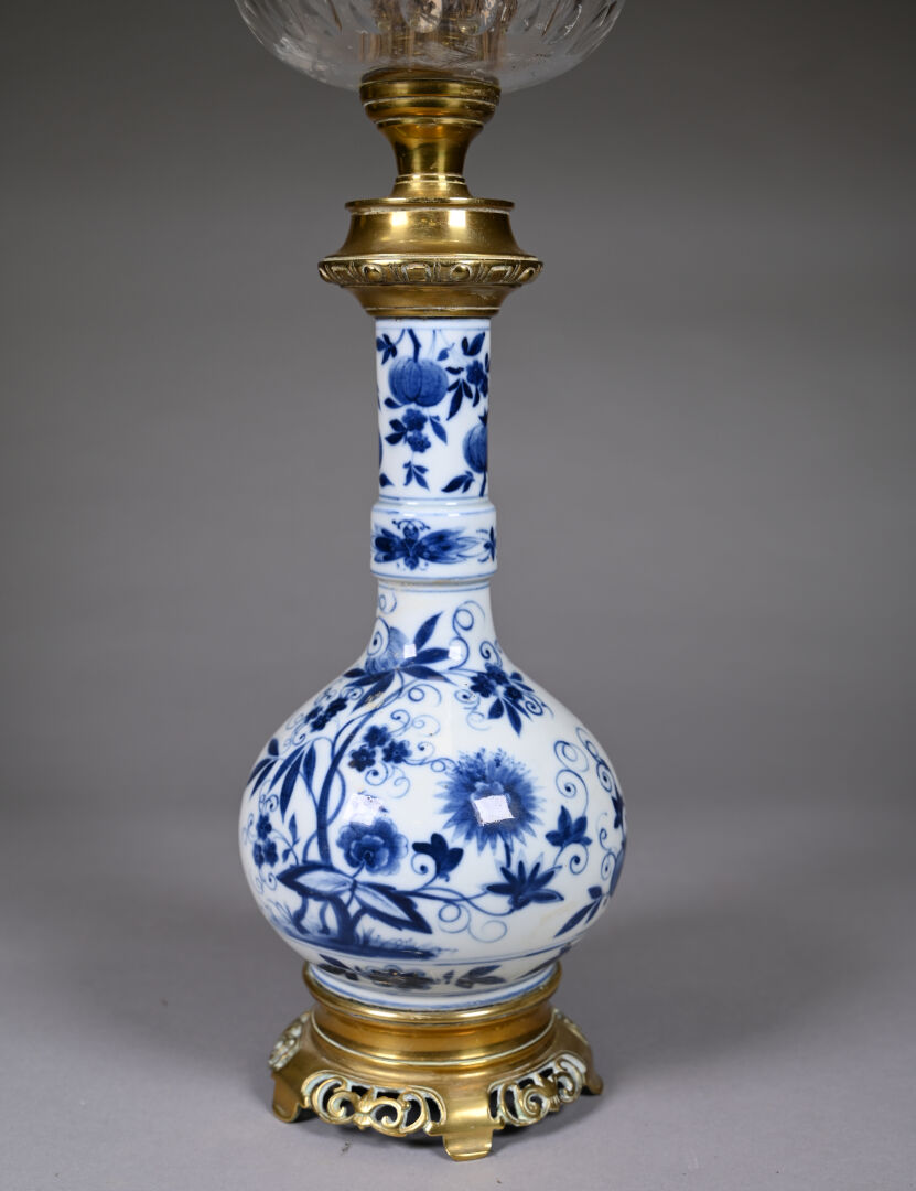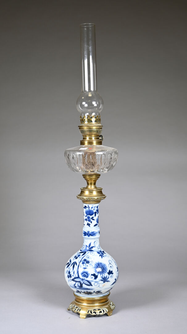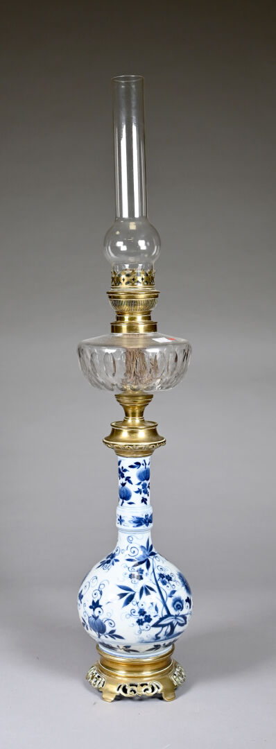 Vase bouteille en porcelaine à décor en bleu. Chine, XVIIIème siècle. Montée en lampe à pétrole, la monture en bronze. Haut. du vase seul : 25 cm.