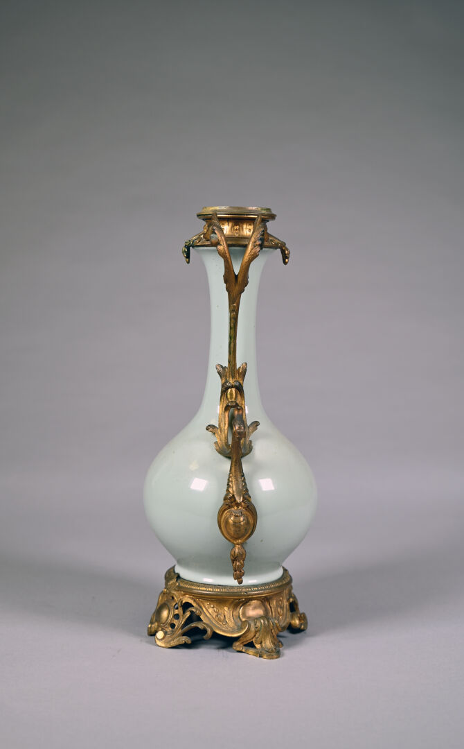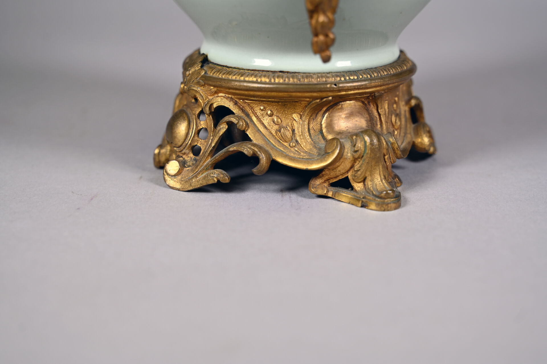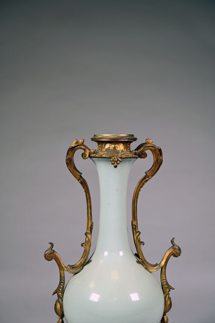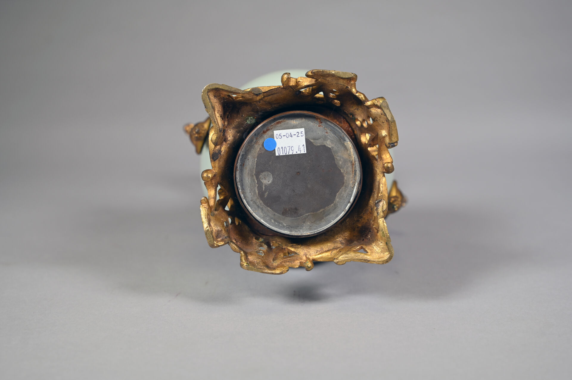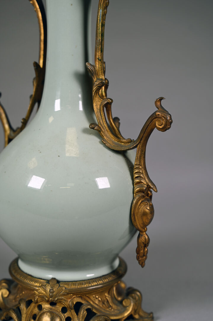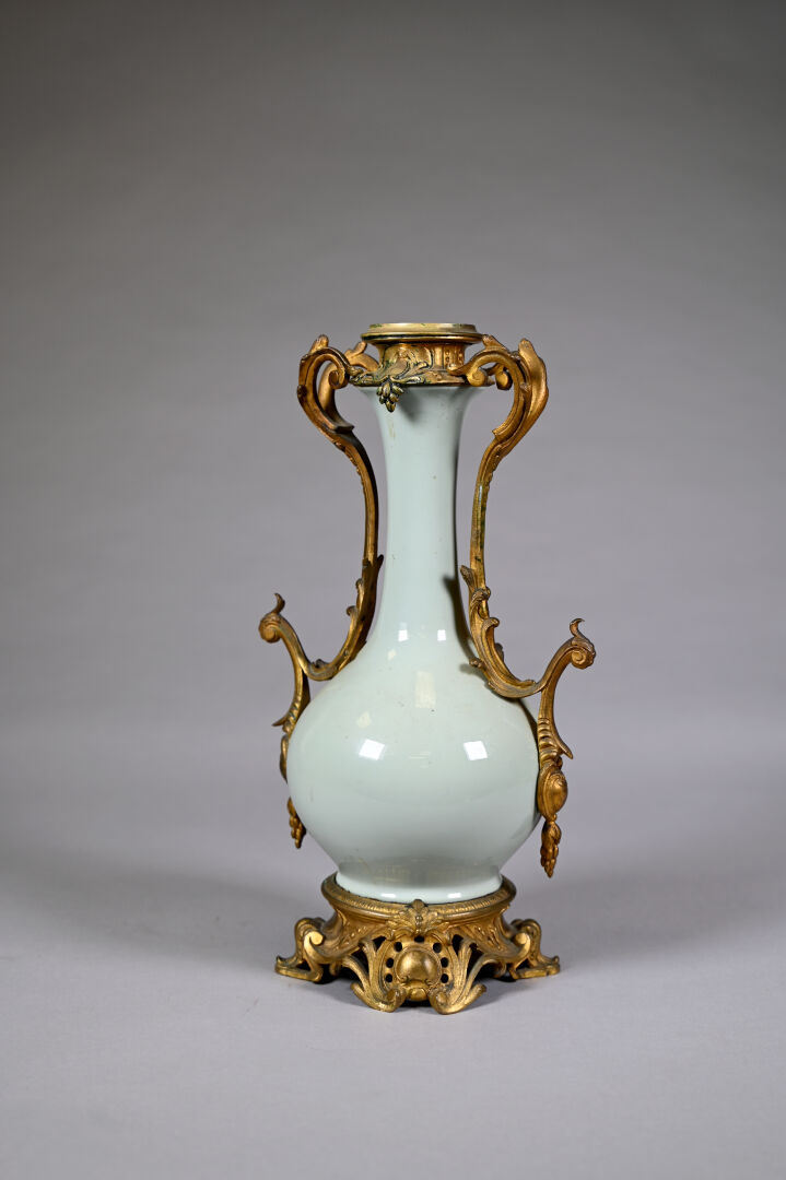 Vase bouteille en porcelaine céladon à monture en bronze ciselé doré à décor d’acanthes, médaillons. XIXe siècle. Haut. : 37 cm.