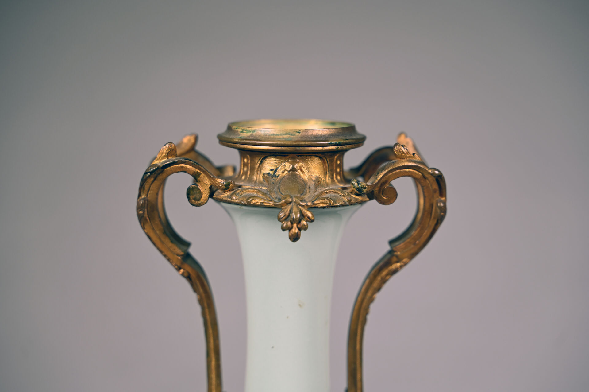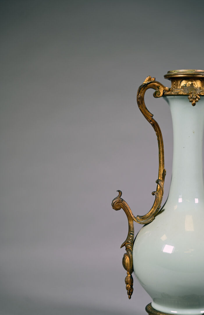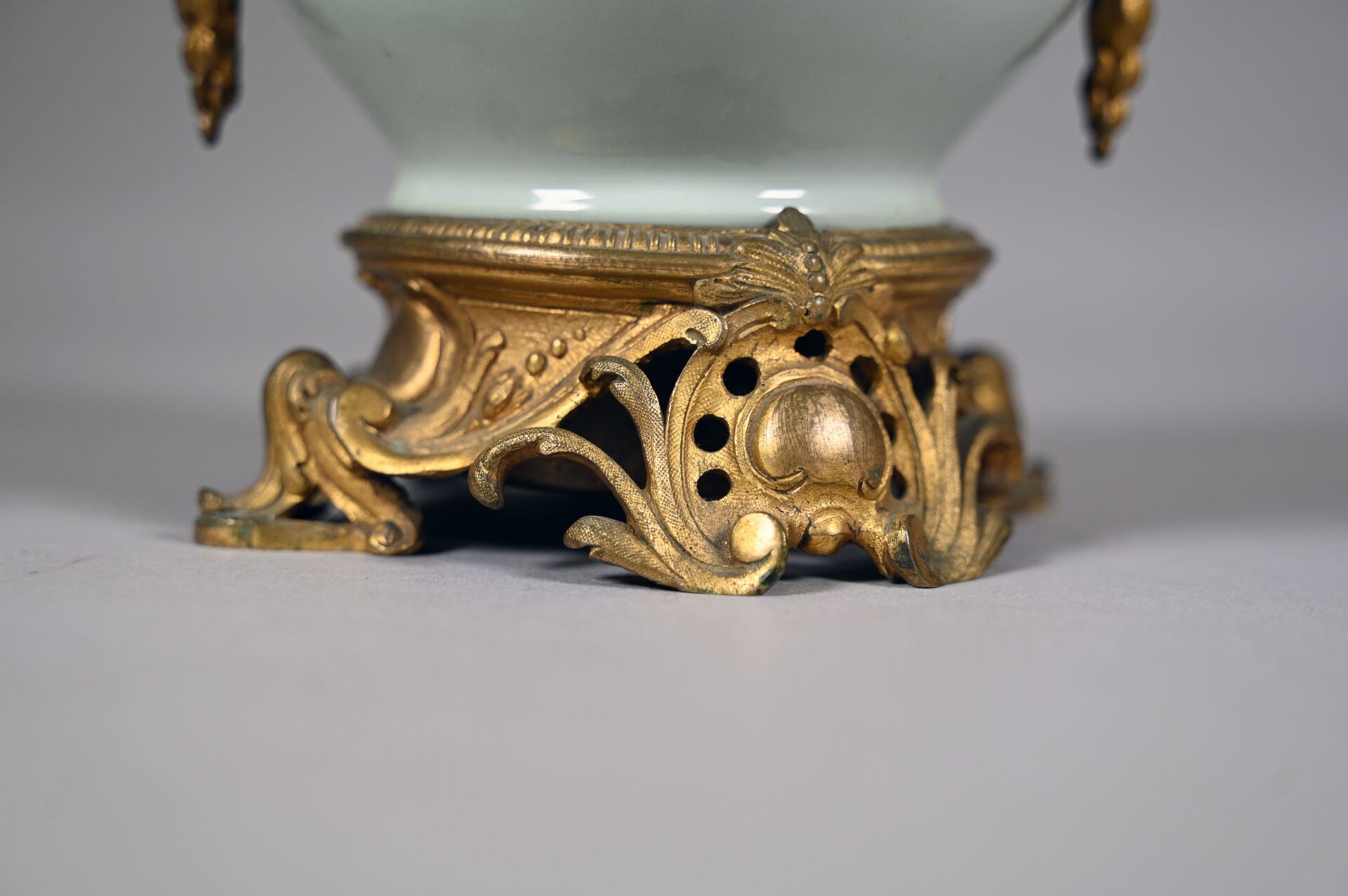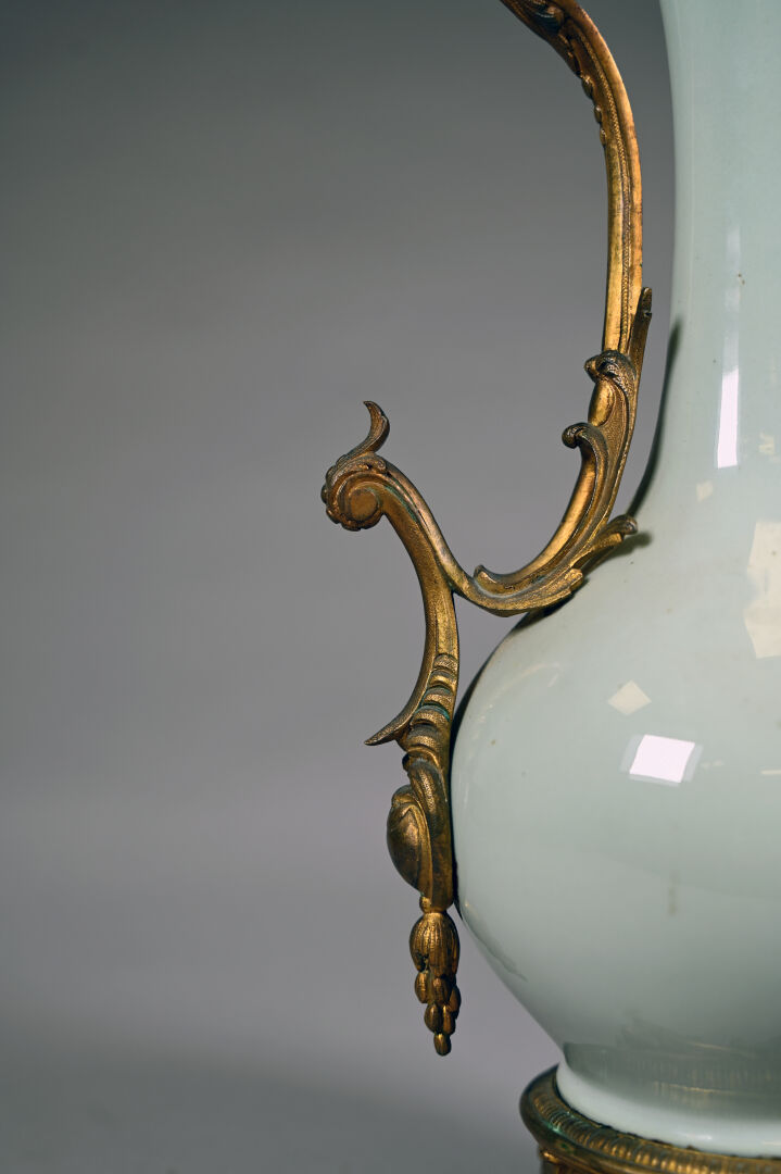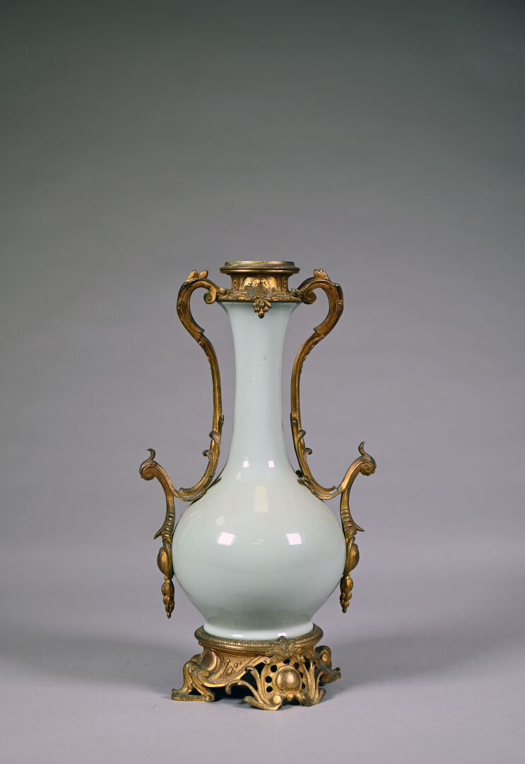 Vase bouteille en porcelaine céladon à monture en bronze ciselé doré à décor d’acanthes, médaillons. XIXe siècle. Haut. : 37 cm.